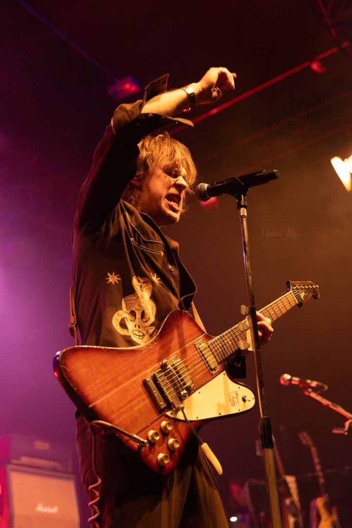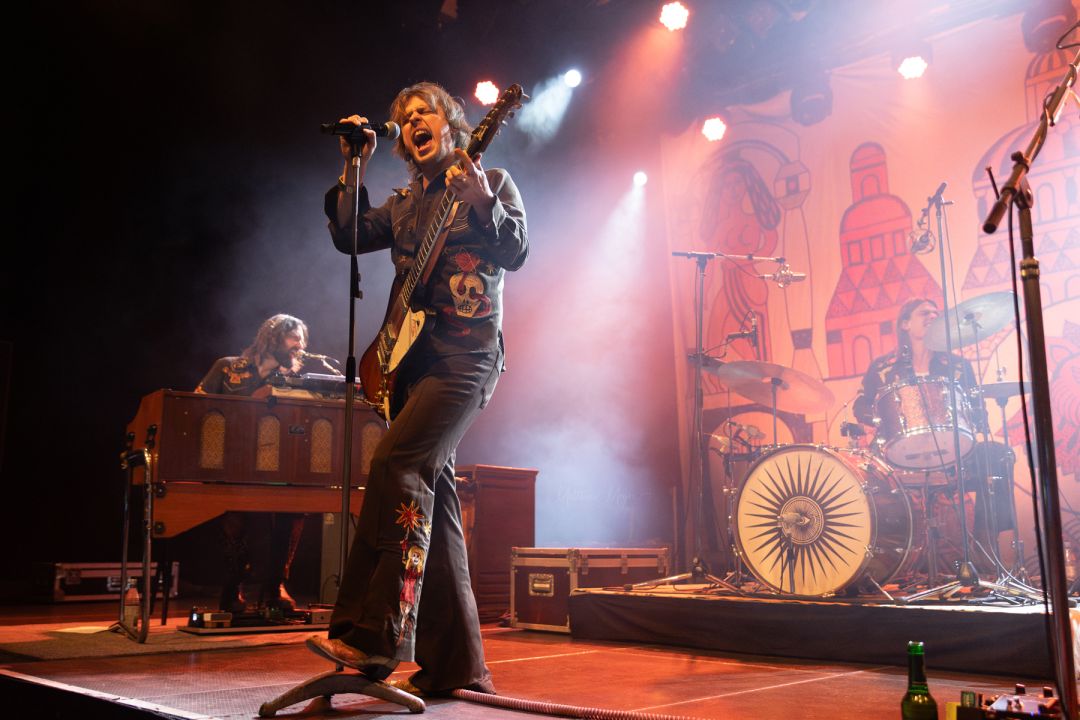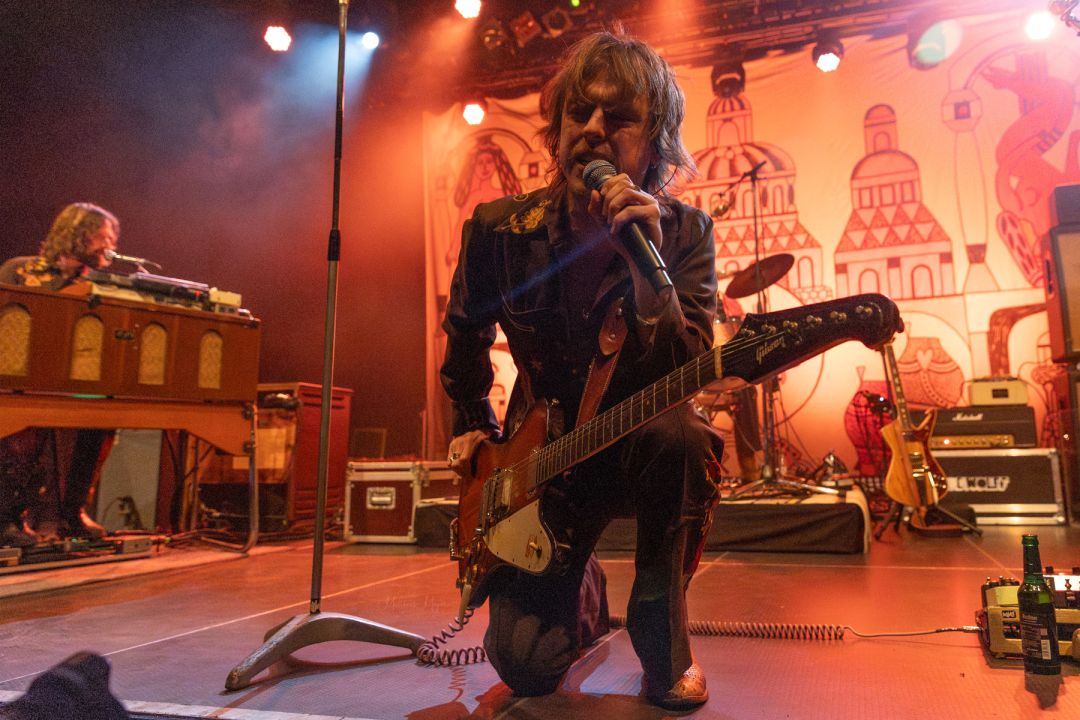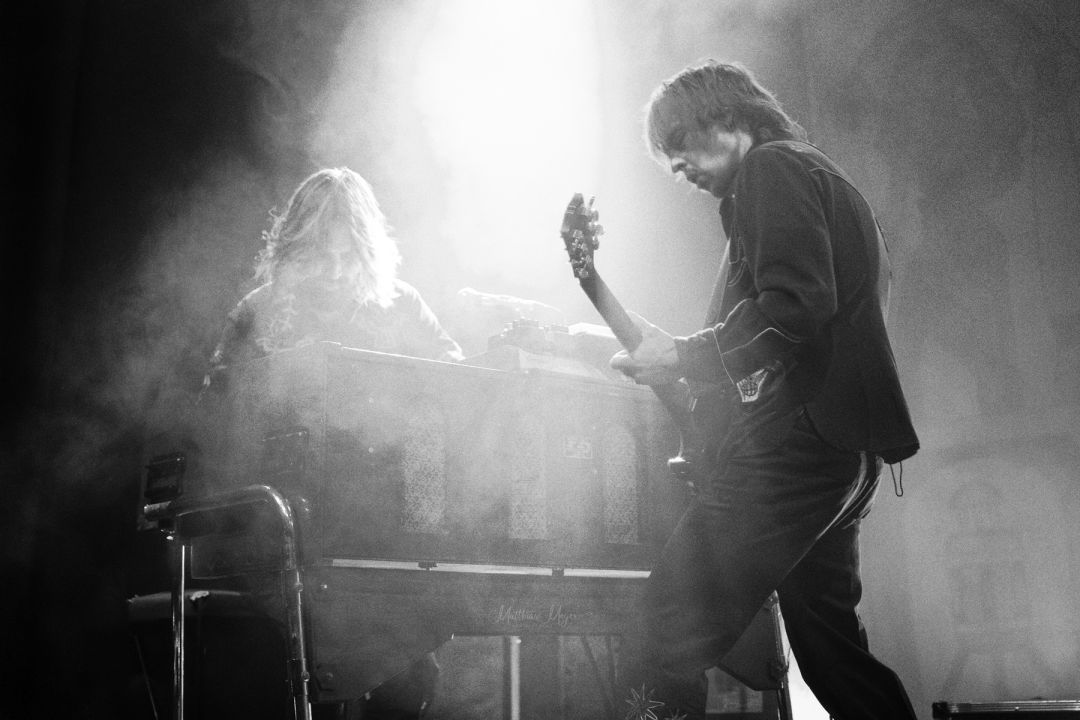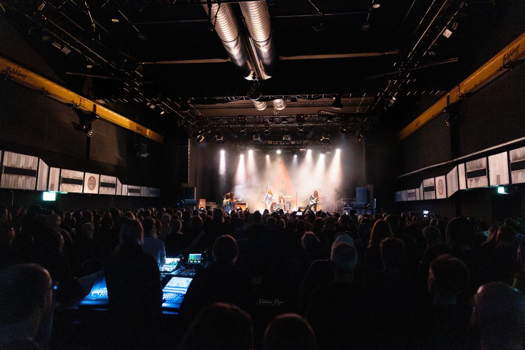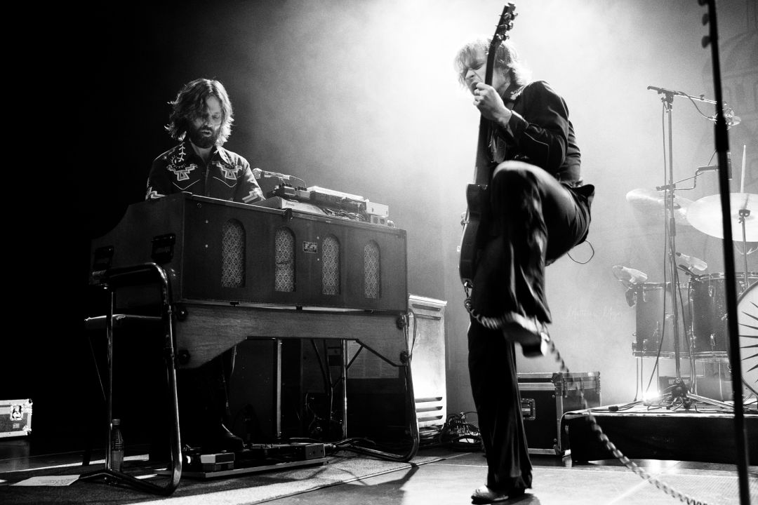 Pünktlich drei Minuten nach 20 Uhr geht es los. DeWolff betritt die Bühne. Für mich mit einem ungewöhnlichen Bühnen-Setup. Links eine fette Orgel, zentral die Drums und rechts ein Schrank mit unterschiedlichen Gitarren. Die niederländische Band besteht aus Pablo van de Poel an den Gitarren und als Frontmann, seinem Bruder Luka van de Poel hinter dem Schlagzeug und Robin Piso, der den Tasten an der Orgel einheizt. Optisch steht der Abend voll unter dem Thema Vintage der 70er. Der Sound von DeWolff setzt dort auch an.