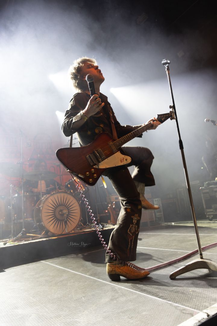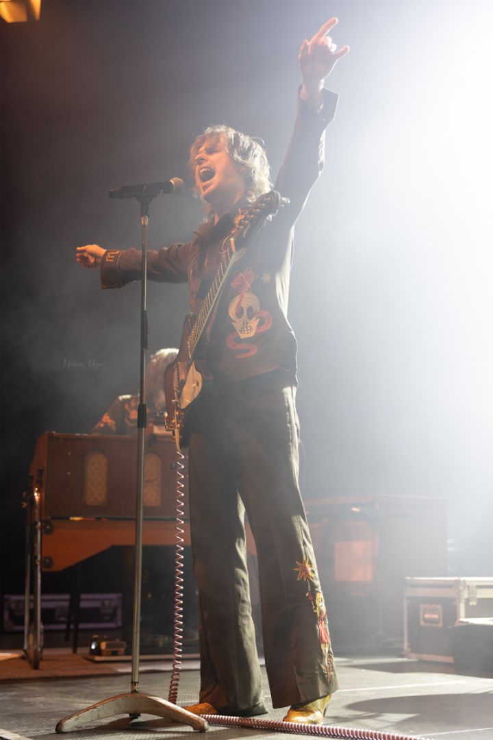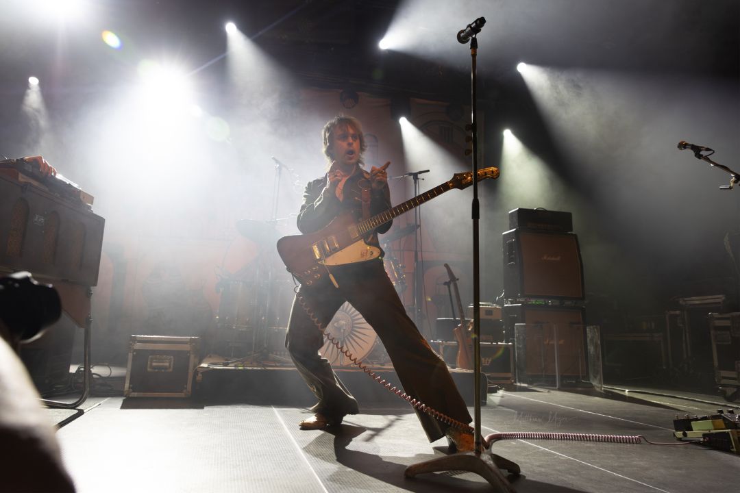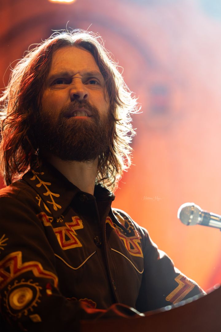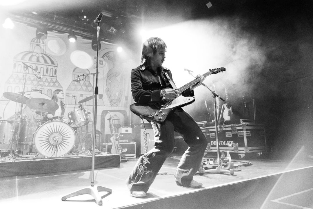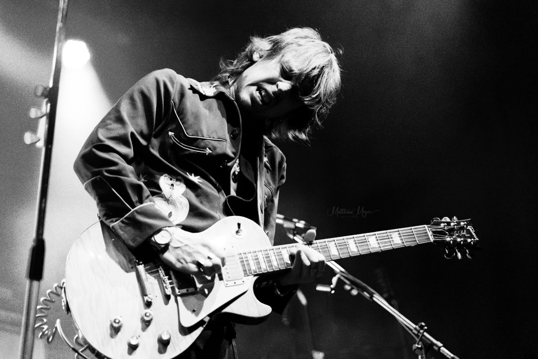 Pünktlich drei Minuten nach 20 Uhr geht es los. DeWolff betritt die Bühne. Für mich mit einem ungewöhnlichen Bühnen-Setup. Links eine fette Orgel, zentral die Drums und rechts ein Schrank mit unterschiedlichen Gitarren. Die niederländische Band besteht aus Pablo van de Poel an den Gitarren und als Frontmann, seinem Bruder Luka van de Poel hinter dem Schlagzeug und Robin Piso, der den Tasten an der Orgel einheizt. Optisch steht der Abend voll unter dem Thema Vintage der 70er. Der Sound von DeWolff setzt dort auch an.