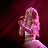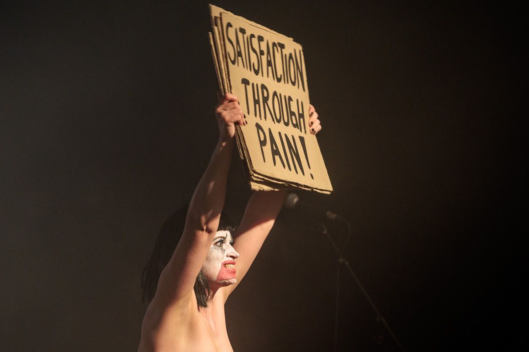 Die Überdosis setzten dann die Grausamen Töchter. „Satisfaction through pain“ stand auf einem der Schilder, die von Elsi zu Beginn hochgehoben wurden, und zeigte unmissverständlich den Weg des Abends auf. Schließlich präsentierte die Neoelectro-Girl-Band ihr neues Album „BDSM for Satsfaction“. Zu „Glaube Liebe Hoffnung“ enterte kurze Zeit später Mastermind Arena Peel im weißen Fellmantel mit ihren Schwestern die immer noch im Nebel verhüllte Bühne. Was dann folgte, war eine regelrechte Injektion in die Sinne und den Verstand, welche das Publikum mit knallharter Konfrontation in ästhetisch-provokanter Weise an die eigenen Grenzen und darüber hinaus führte. Zum rhythmisch schlagenden Synthesizer nahm Peels durchdringende Stimme kein Blatt vor den Mund. Songs von der neuen Scheibe wie „Schmerz“, „Folterkeller“ oder „Annika wird Filmstar“ erzählten von tiefen Abgründen aus Liebe, Lust und Gewalt. Dabei übergoss sich die Sängerin aus einem Benzinkanister, riss sich Haare aus (der Perücke) oder wälzte sich in Kunstblut. Die bizarren Szenen bohrten sich schmerzhaft durch die Gehirnwindungen auf der Suche nach Interpretationen und brachten ungeschminkt auch soziokulturelle Missstände ans Licht. Mit ihrer provokanten Performance und ihrer charismatischen Bühnenpräsenz tauchten die Grausamen Töchter – allen voran Aranea Peel – das Publikum genüsslich Stück für Stück tiefer in ihren Abgrund. Ein Abgrund, der für einige vielleicht näher ist, als man zugeben mag. Das fesselnde Potpourri beinhaltete neben den neuen Songs auch Klassiker wie „Wie eine Spinne“, „Annika ist tot“ und das Joachim-Witt-Cover „Goldener Reiter“. Mit „Ich darf das“ kommt zum Schluss der Bandklassiker, der laut Peel auf keinem Grausame-Töchter-Konzert fehlen darf.