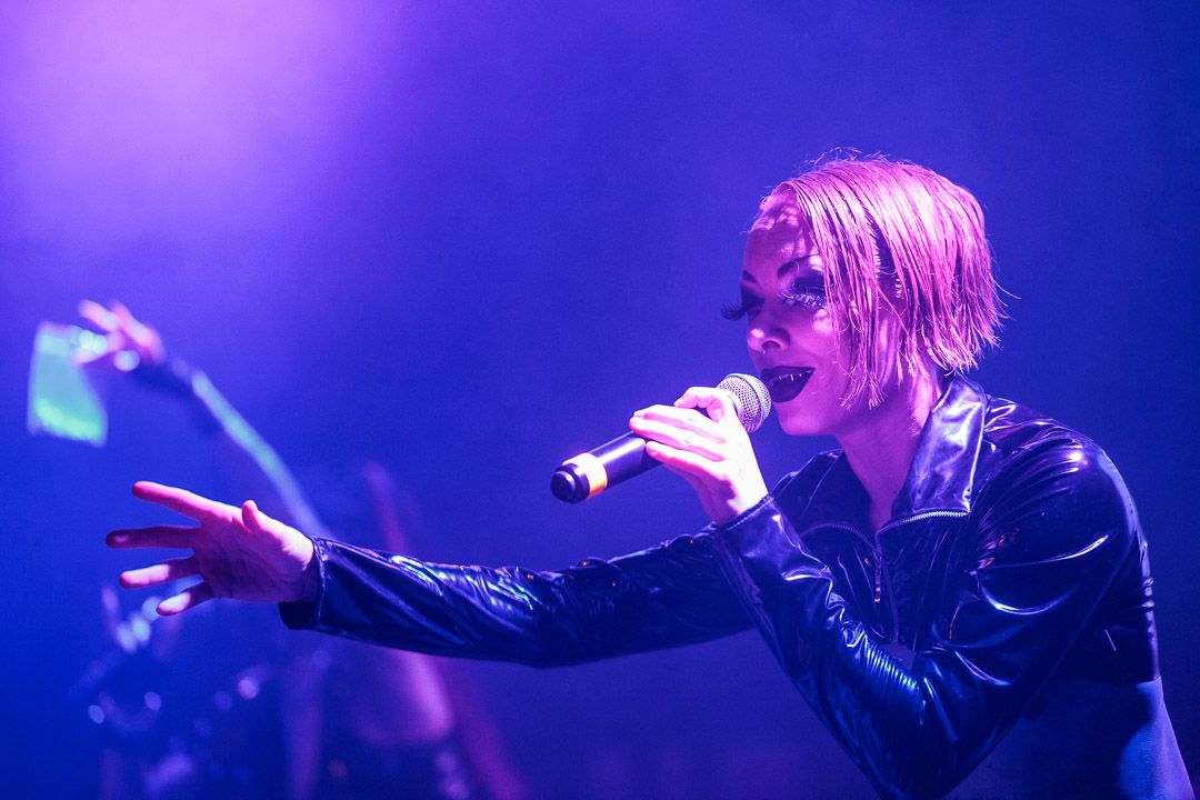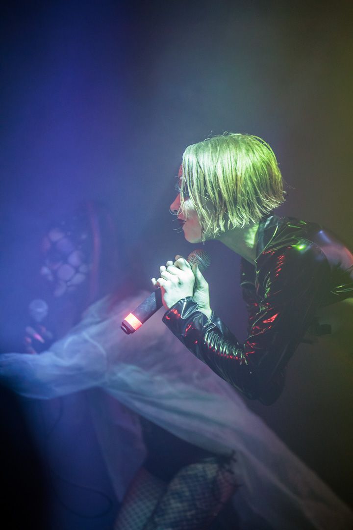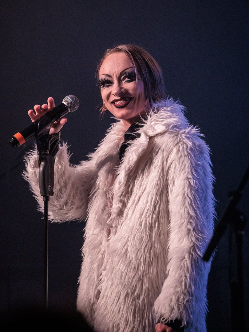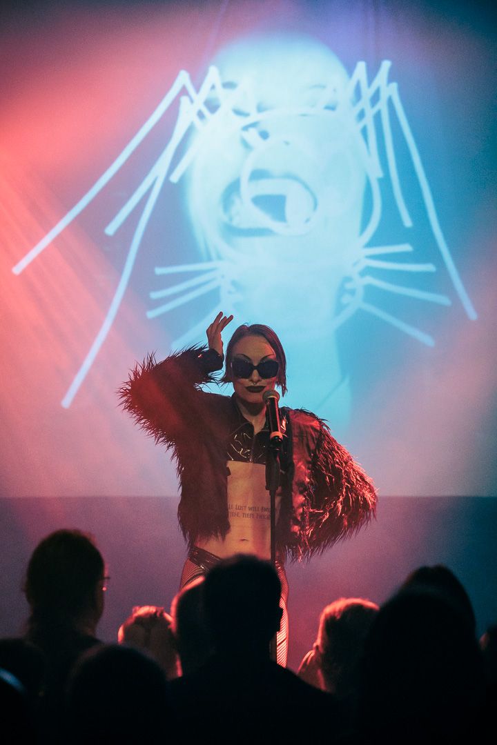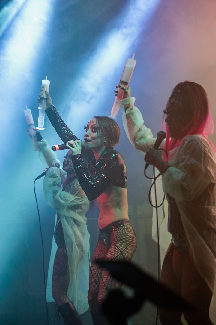 „Get Your Overdose“ war nicht nur ein Versprechen, sondern eine Aufforderung, sich voll und ganz der exzessiven Show hinzugeben. Die Grausamen Töchter erfüllten ihr Versprechen: Ihr Auftritt war ein hypnotisierender Trip, der das Publikum in einen Strudel aus musikalischer Ekstase und visueller Überwältigung zog. Die nicht immer leichten Inhalte wurden durch die konsequent groteske Bühnenshow der ausdrucksstarken Sängerin und ihren Mitstreiterinnen unterstrichen, die es meisterhaft schafften, das tanzwütige Publikum im Club Das Bett bis zum Schluss in ihren Bann zu ziehen.