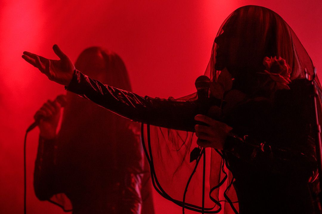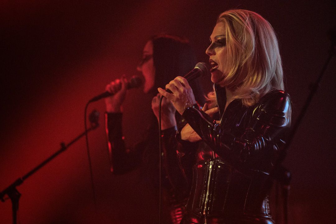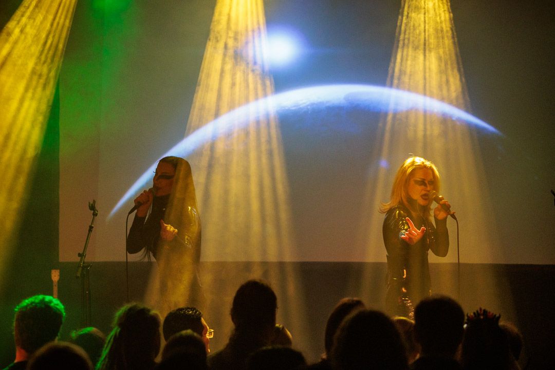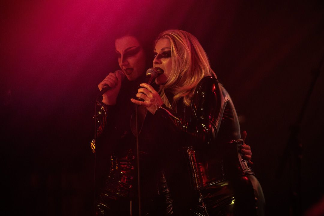 Danach verdunkelte sich der Raum und im spärlichen Rotlicht betraten Vampyros Lesbos das Podium. Im schwarzen Lack-/Latex-Outfit unter einem schwarzen Schleier verhüllt ziehen die beiden Frontfrauen die Anwesenden mit in eine mysteriöse Welt. Worte der Leidenschaft und aus dem Okkult, beispielsweise bei „Willst du mal?“, mischten sich in ruhige Melodien, die von harten Electrobeats getragen werden. So baute sich eine dunkle Symphonie aus lustvollem Transsilvanien-Flair gepaart mit einem pulsierenden Dark-Wave-Sound auf, die nach vier Songs ein viel zu frühes Ende fand. Das Publikum bedankte sich bei dem Booster mit ordentlich Beifall.
