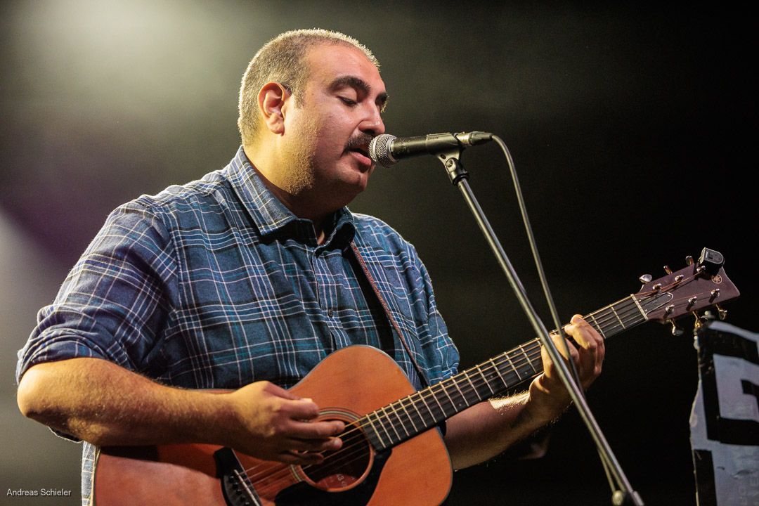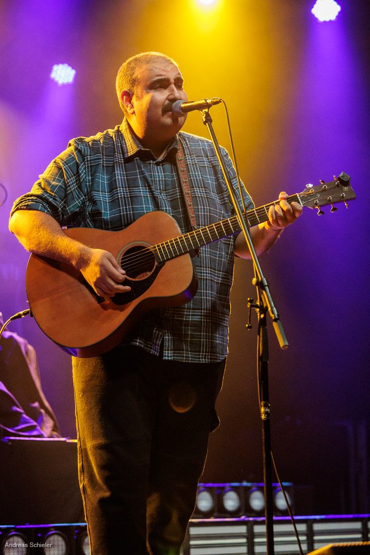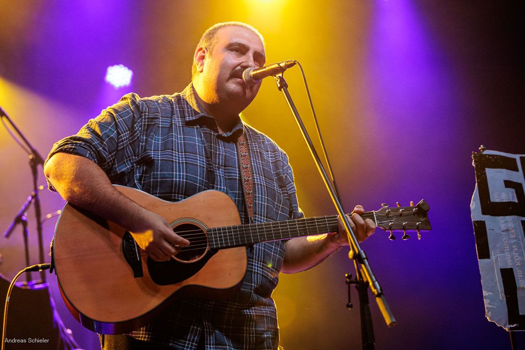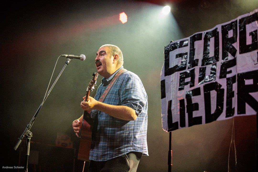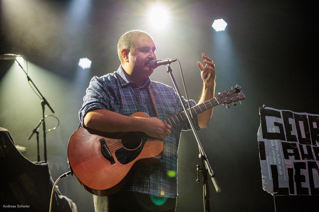 Der kurzweilige Abend beginnt unterhaltsam mit dem außergewöhnlichen Georg auf Lieder, der mit viel Selbstironie und seiner Gitarre anfangs kaum die Bühne füllt. Zumindest scheint dies so, jedoch entpuppt sich Georg als grandioser Geschichtenerzähler und als wahre Stimmungskanone. Mit kleiner Parlor Gitarre spielt er sich punkig-poppig in die Herzen des Publikums, das sich sofort mitreißen lässt. Doppelbödig-ironische Ansagen, eine überraschend emotionale Stimme und aufrichtige Texte über die komplexe Schlichtheit des Lebens und über die Liebe verleihen Songs wie „Goodbye Hamsterrad“, „Tarzan und Jane“ oder dem Opener „Schwer in Ordnung“ einen ganz eigenen Charme und bringen das Publikum überraschend schnell auf Betriebstemparatur. Hinzu kommen die Animateurqualitäten des Troubadours, der es mit listiger Argumentation schafft, dass das anspruchsvolle Frankfurter Publikum schon beim ersten Lied mitsingt und -klatscht.