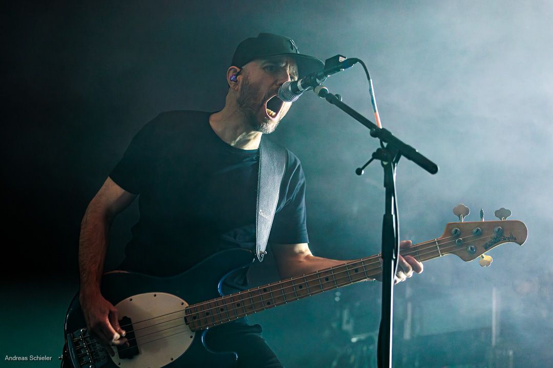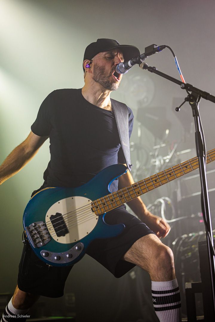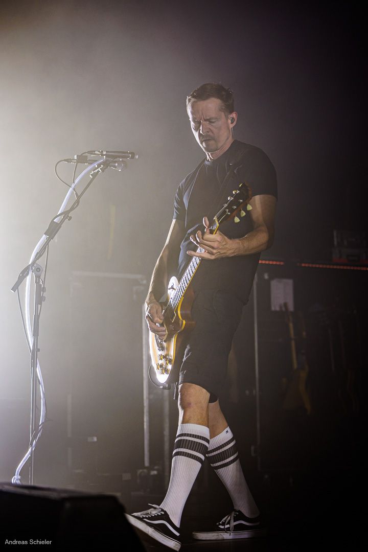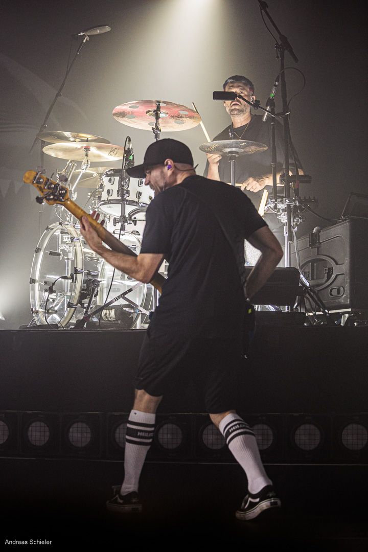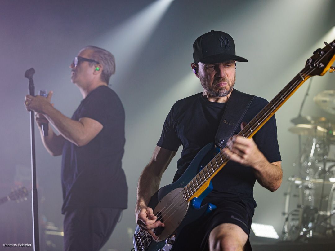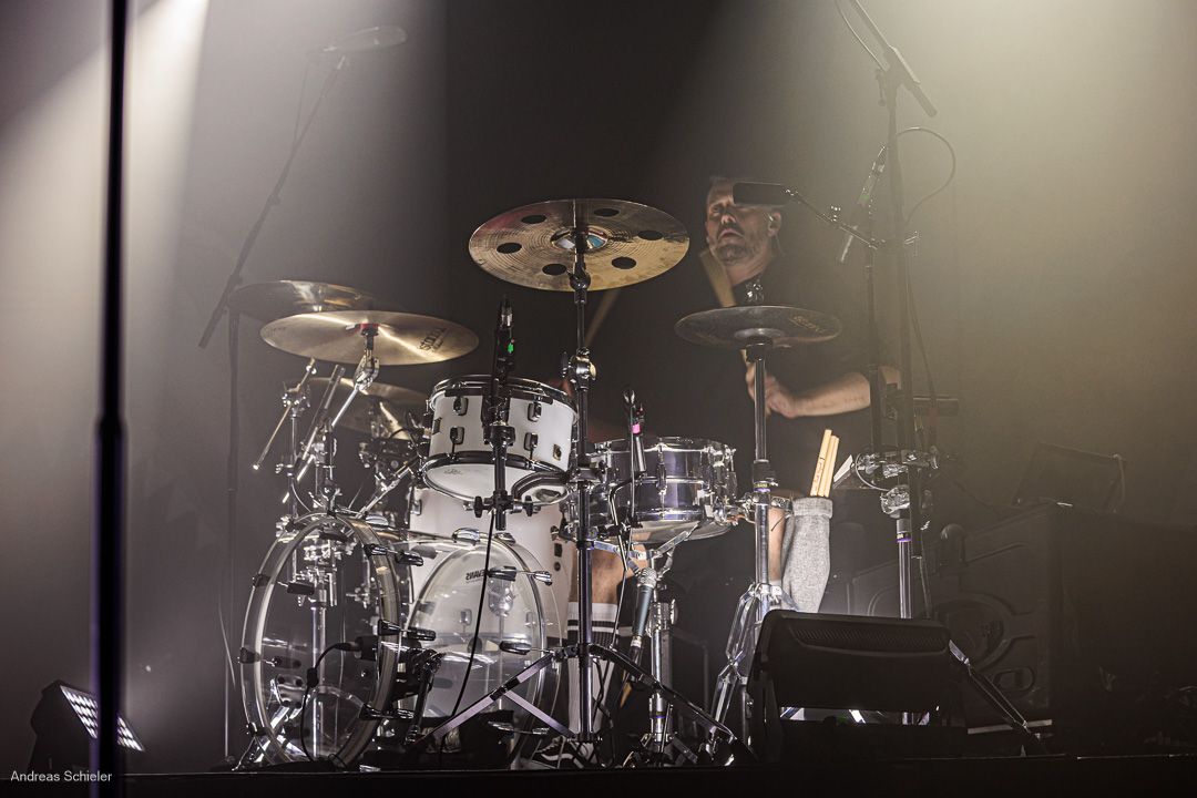 Als der Hamburger Klampfbube unter anerkennendem Applaus die Bühne verlässt, fallen uns sofort wieder die beiden übergroßen Haifischportraits auf, zwei große Weiße kurz vor dem Zubeißen, die in Anlehnung an das Cover des Erfolgsalbums „Time To Move“ das folgende Programm einläuten sollen. Die Anspannung steigt. Zu „Radio Gaga“ und aus einer Nebelwand heraus erscheint die Band nach und nach, hinter einer Barriere aus Nebel und Scheinwerferlicht erscheinen Podeste und ein zentral platziertes Schlagzeug. Allen Bandmitgliedern wird so ein gleichberechtigter Platz auf der Bühne eingeräumt. Dies zeigt sich auch, als der Einspieler in den Opener „Countdown to Insanity“ übergeht. Die Band wirkt tight und eingespielt, auch wenn es noch ein paar Lieder braucht, bis sich jeder richtig warm gespielt zu haben scheint. Im uniformen Look ganz in Schwarz und mit hochgezogenen Crew Socks, gibt man sich bewusst als Band, nicht als Einzelkünstler. Die Show bietet einen wunderbaren Querschnitt durch die Alben, wobei doch den Songs von „Time to Move“ ein größerer Anteil eingeräumt wird. Dies wird deutlich, als ein erstmals ein Gast auf die Bühne gebeten wird. Niemand geringerer als der ehemalige Sänger Dave Gappa, der bei der Urbesetzung dabei war, gesellt sich unter lautem Applaus zur Band, die uns mit einem energetischen Time-To-Move-Medley einen ersten Höhepunkt beschert und noch mehr Bewegung auf die Bühne bringt. Still steht im Saal nun keiner mehr!