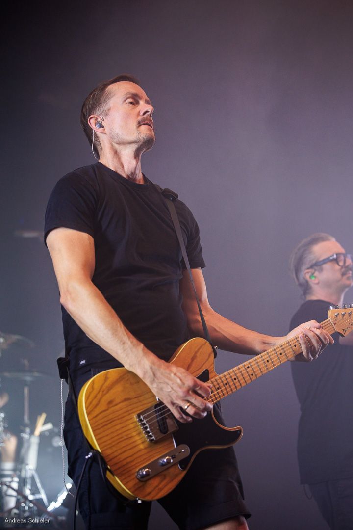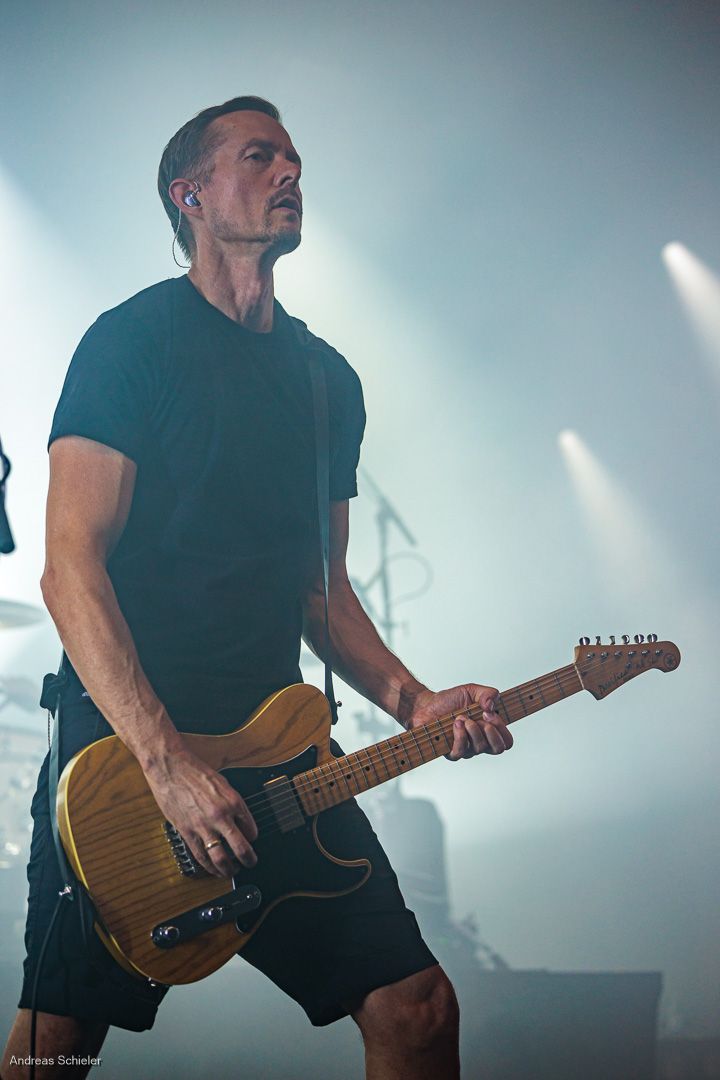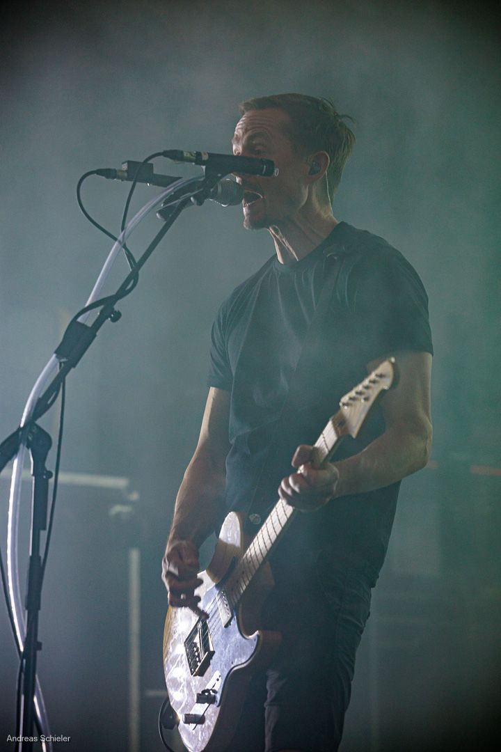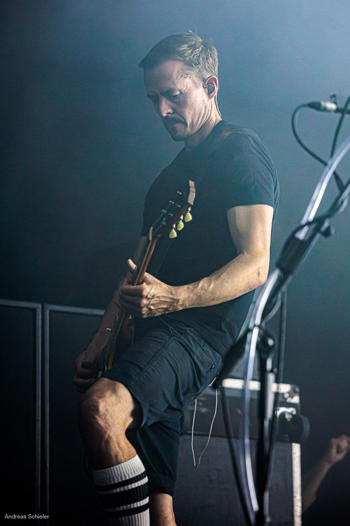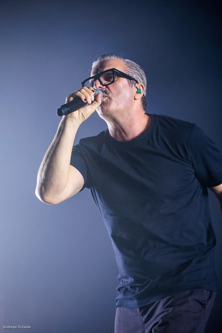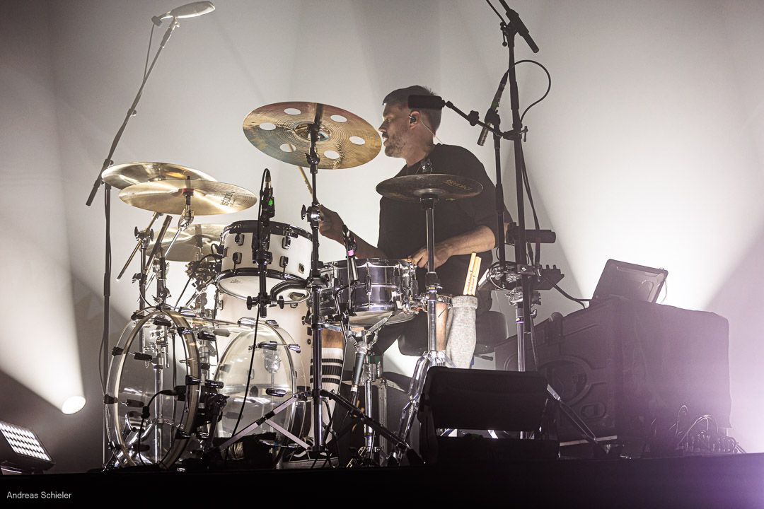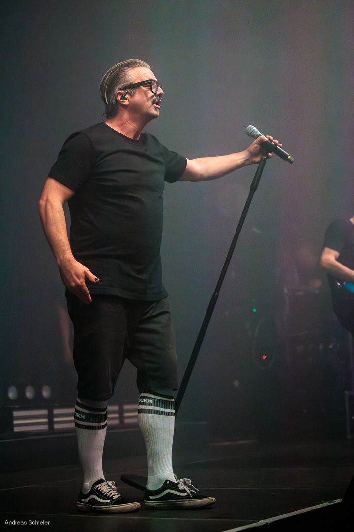 Als der Hamburger Klampfbube unter anerkennendem Applaus die Bühne verlässt, fallen uns sofort wieder die beiden übergroßen Haifischportraits auf, zwei große Weiße kurz vor dem Zubeißen, die in Anlehnung an das Cover des Erfolgsalbums „Time To Move“ das folgende Programm einläuten sollen. Die Anspannung steigt. Zu „Radio Gaga“ und aus einer Nebelwand heraus erscheint die Band nach und nach, hinter einer Barriere aus Nebel und Scheinwerferlicht erscheinen Podeste und ein zentral platziertes Schlagzeug. Allen Bandmitgliedern wird so ein gleichberechtigter Platz auf der Bühne eingeräumt. Dies zeigt sich auch, als der Einspieler in den Opener „Countdown to Insanity“ übergeht. Die Band wirkt tight und eingespielt, auch wenn es noch ein paar Lieder braucht, bis sich jeder richtig warm gespielt zu haben scheint. Im uniformen Look ganz in Schwarz und mit hochgezogenen Crew Socks, gibt man sich bewusst als Band, nicht als Einzelkünstler. Die Show bietet einen wunderbaren Querschnitt durch die Alben, wobei doch den Songs von „Time to Move“ ein größerer Anteil eingeräumt wird. Dies wird deutlich, als ein erstmals ein Gast auf die Bühne gebeten wird. Niemand geringerer als der ehemalige Sänger Dave Gappa, der bei der Urbesetzung dabei war, gesellt sich unter lautem Applaus zur Band, die uns mit einem energetischen Time-To-Move-Medley einen ersten Höhepunkt beschert und noch mehr Bewegung auf die Bühne bringt. Still steht im Saal nun keiner mehr!