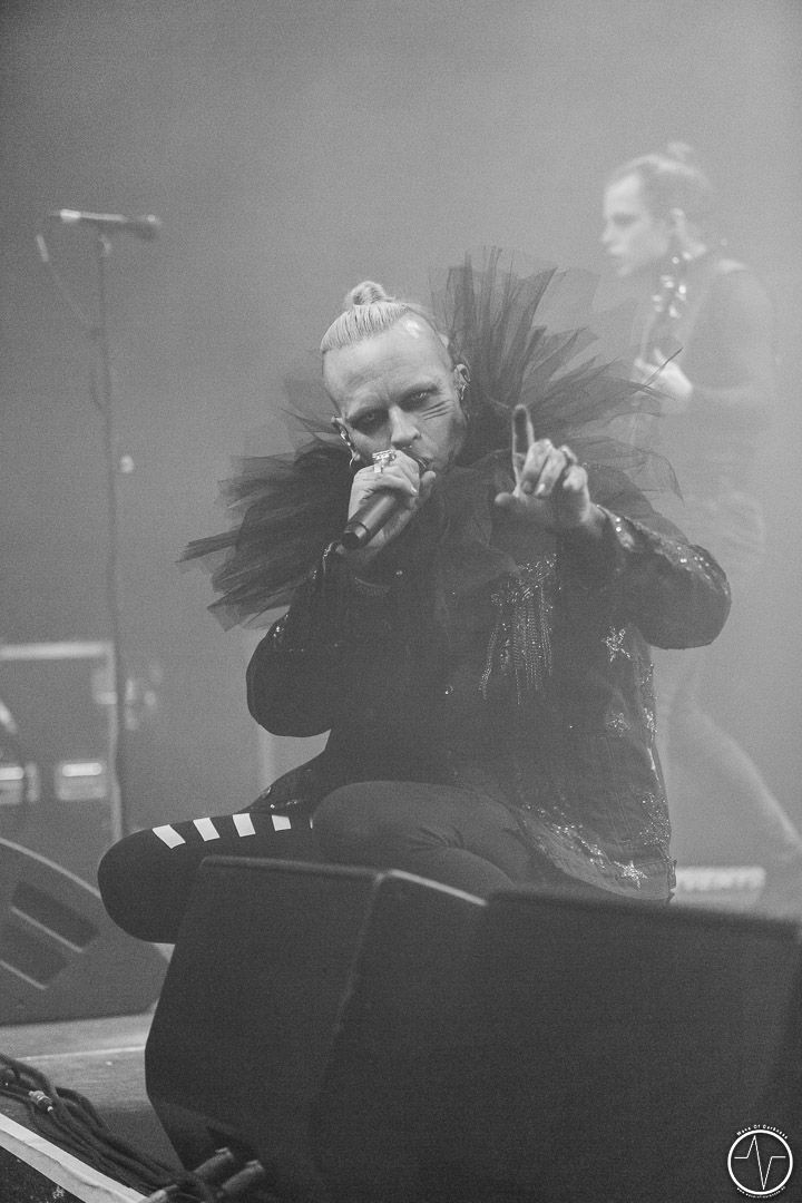 Lord of the Lost werden nach einer kurzen Umbaupause lautstark empfangen. Während der Schlagzeuger Niklas Kahl die ersten Takte hämmert, sind im Dunst weiße Schminke und extraordinäre Outfits, meist mit Glitzer besetzt, zu erkennen. Sofort kommt Stimmung in der Garage Saarbrücken auf. Denn viele – vor allem weiblich Fans – sind heute angereist, um die Dark-Rock-Band aus Hamburg zu sehen. So singt die Fanschar mehr oder weniger textsicher mit, klatscht oder tanzt ausgelassen zu dem Mix aus der aktuellen Scheibe „Thornstar“ und den älteren Klassikern. „Loreley“ zündet beim saarländischen Publikum ebenso wie „Full Metal Whore“. Die Band ist bekannt und beliebt im kleinen Bundesland. So hat es in der Vergangenheit einige Liveshows beispielsweise auf dem Hexentanz oder gar in Ottweiler gegeben, aber heute ist Premiere in Saarbrücken, so Chris Harms. Der charismatische „Lord“ bewegt sich im Fokus – mal mit leuchtender Gitarre, mal glitzernder Gitarre und mal ohne, dafür unten bei seinen feiernden Fans. Lord of the Lost halten bis zum Schluss das Stimmungsbarometer relativ hoch und werden nach den beiden letzten Songs „La Bomba“ sowie „Trisma“ frenetisch verabschiedet.
