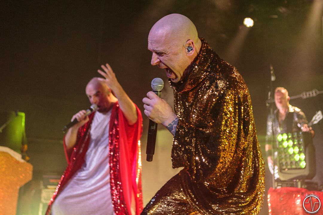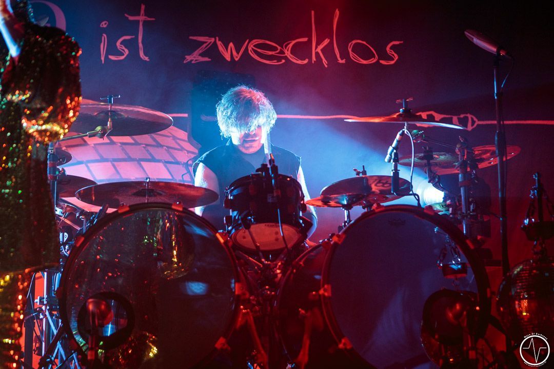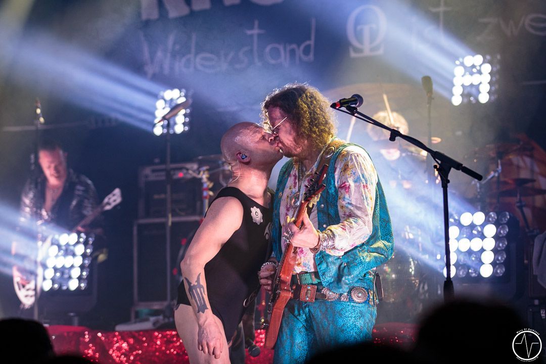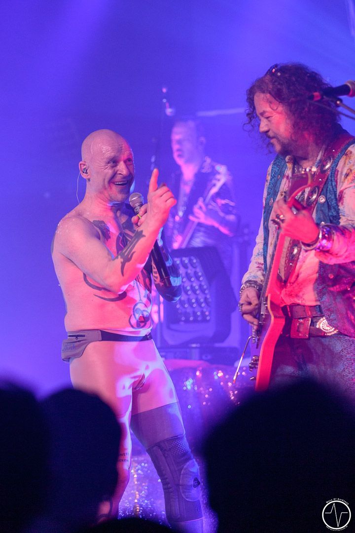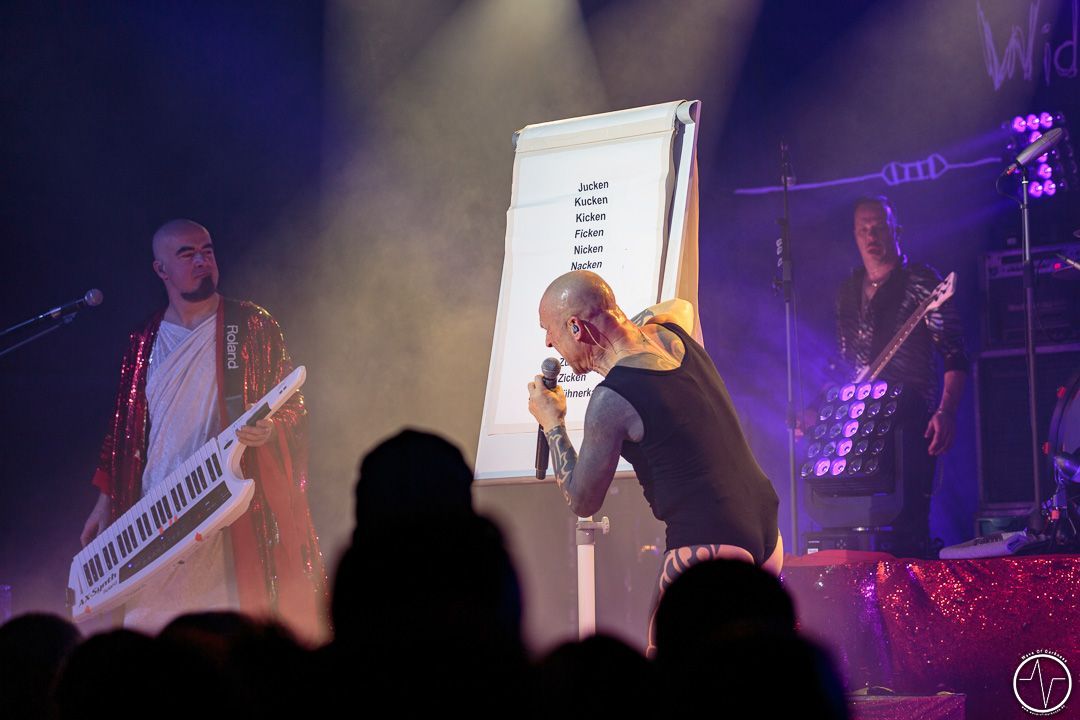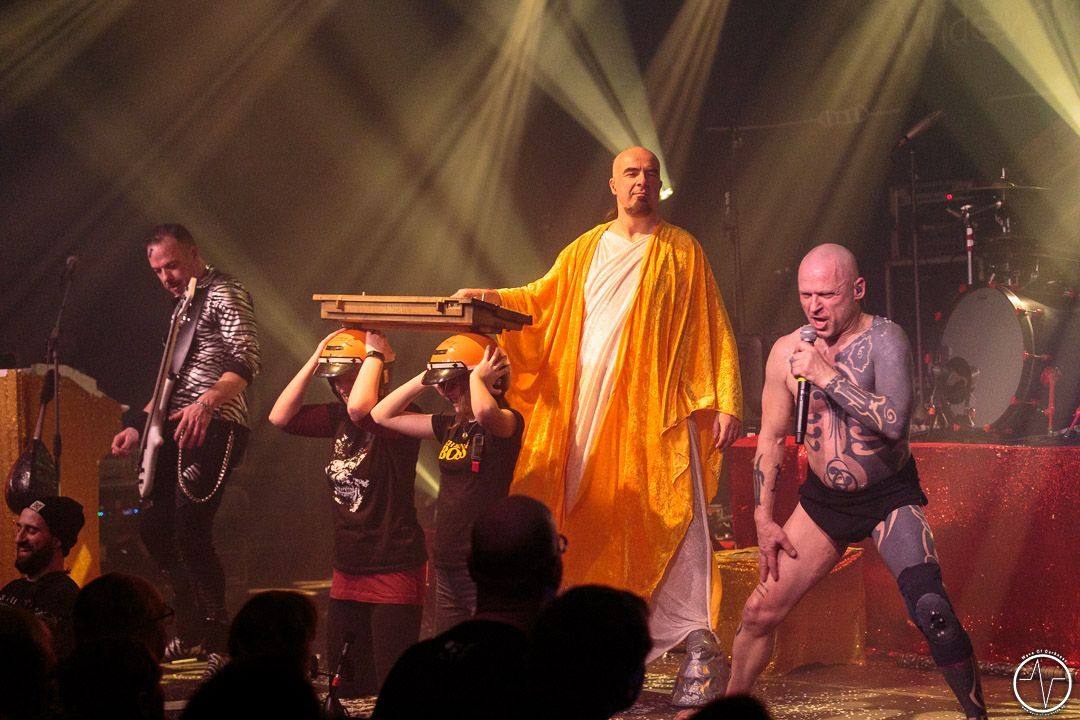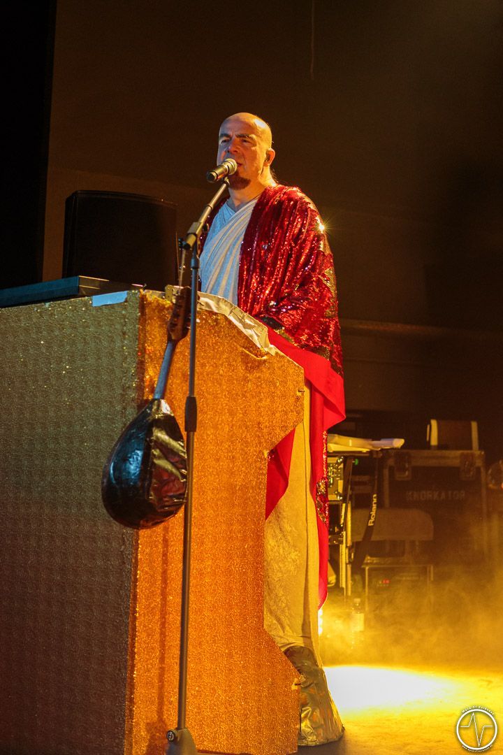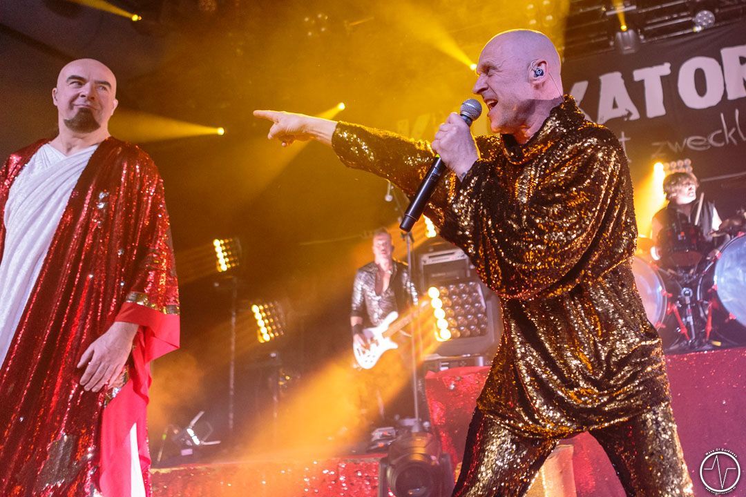 Der unbedachte Neuling dürfte wohl mit musikalischer Poesie der Berliner Band überfordert sein. Dies zeigt sich schon von Anfang an. Anstatt einer Vorband steht ein übergroßer Bildschirm vorne, auf dem skurrile Videoclips mal mit mal ohne die „meiste Band der Welt“ für Belustigung sorgt. Die neu synchronisierten Videoausschnitte nehmen vor allem die Kollegen auf die Schippe – von Rammstein über Ed Sheeran bis hin zu der Musikerformation selbst ist ein witziger Querschnitt geboten. Unter den besonders schrägen Orchesterklängen starten Stumpen, Alf, Raijko, Nick und die alte Frau BuzzDee mit ihrer „Absolution“ und damit gleich ein Song, der den vollen Umfang von der Gesangsstimme repräsentiert. Doch nicht nur als ausgebildeter klassischer Sänger sondern auch als eigenartiger Entertainer weiß der zappelige Frontmann zu begeistern. Im Gold glitzernden Outfit samt plüschigen Puschel-Hausschuhen steht der kleine Stumpen auf dem Podest, während er in hohem Operngesang seine schein-lateinischen Wörter jenseits der Schamgrenze trällert. Ebenso glitzernd flankieren Alf Ator am Keyboard und Buzz Dee an der Gitarre die Lebensweisheiten bei „Es kotzt mich an“ oder „Du bist schuld“ im aggressiven Metalsound. Alf, der sich auch als Komponist und Texter verantwortlich zeichnet, stampft in überdimensionalen Plateauschuhen über die Bühnen, um mal mit Stumpen im Duett oder mal solo zu singen. Derweil treibt der stets gechillte Buzz Dee mit seiner hippen Retro-Figur und seinem harten Gitarrenspiel selbstbestimmt den Sound voran.