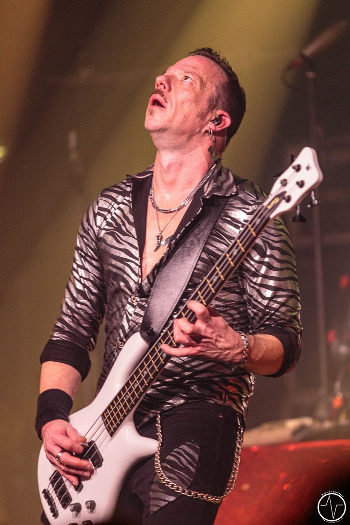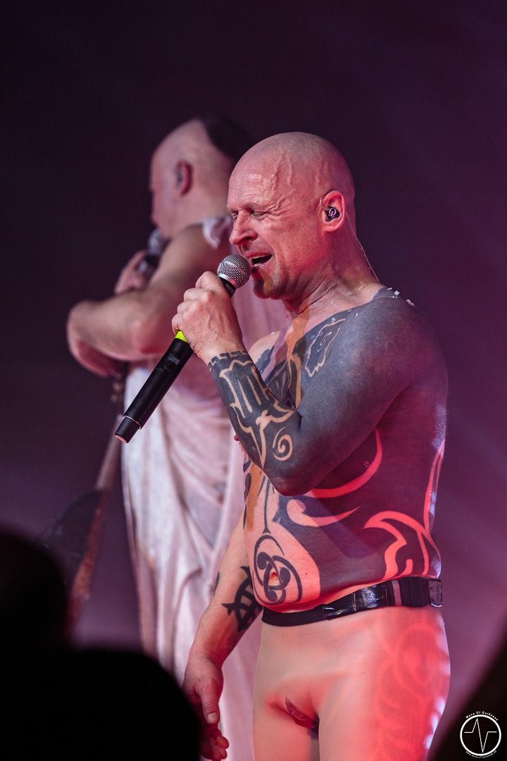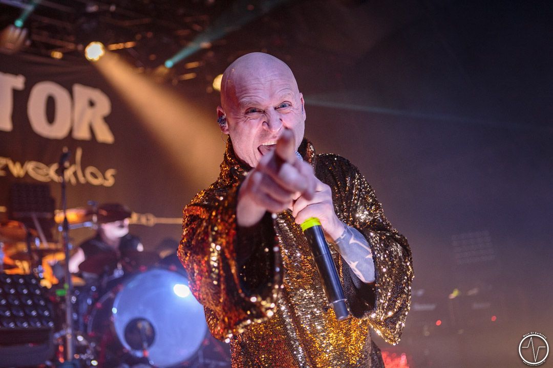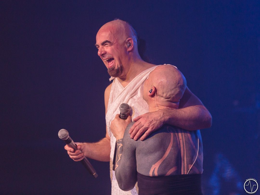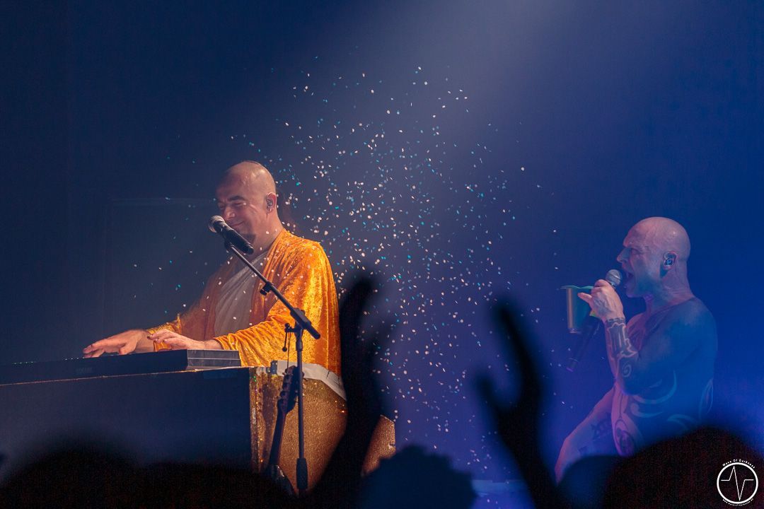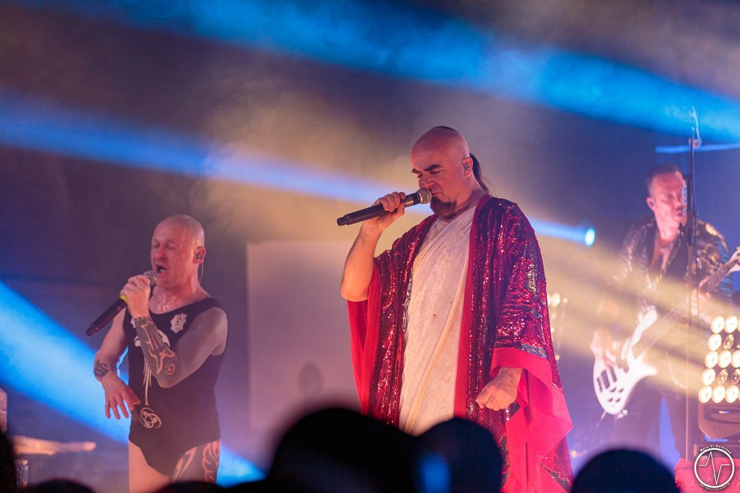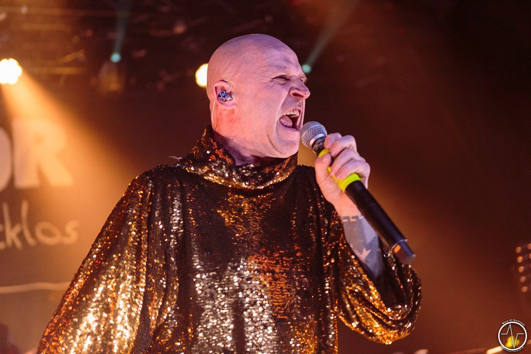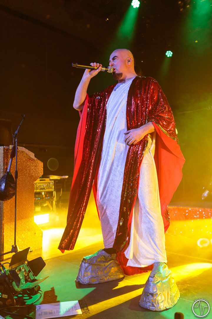 Der unbedachte Neuling dürfte wohl mit musikalischer Poesie der Berliner Band überfordert sein. Dies zeigt sich schon von Anfang an. Anstatt einer Vorband steht ein übergroßer Bildschirm vorne, auf dem skurrile Videoclips mal mit mal ohne die „meiste Band der Welt“ für Belustigung sorgt. Die neu synchronisierten Videoausschnitte nehmen vor allem die Kollegen auf die Schippe – von Rammstein über Ed Sheeran bis hin zu der Musikerformation selbst ist ein witziger Querschnitt geboten. Unter den besonders schrägen Orchesterklängen starten Stumpen, Alf, Raijko, Nick und die alte Frau BuzzDee mit ihrer „Absolution“ und damit gleich ein Song, der den vollen Umfang von der Gesangsstimme repräsentiert. Doch nicht nur als ausgebildeter klassischer Sänger sondern auch als eigenartiger Entertainer weiß der zappelige Frontmann zu begeistern. Im Gold glitzernden Outfit samt plüschigen Puschel-Hausschuhen steht der kleine Stumpen auf dem Podest, während er in hohem Operngesang seine schein-lateinischen Wörter jenseits der Schamgrenze trällert. Ebenso glitzernd flankieren Alf Ator am Keyboard und Buzz Dee an der Gitarre die Lebensweisheiten bei „Es kotzt mich an“ oder „Du bist schuld“ im aggressiven Metalsound. Alf, der sich auch als Komponist und Texter verantwortlich zeichnet, stampft in überdimensionalen Plateauschuhen über die Bühnen, um mal mit Stumpen im Duett oder mal solo zu singen. Derweil treibt der stets gechillte Buzz Dee mit seiner hippen Retro-Figur und seinem harten Gitarrenspiel selbstbestimmt den Sound voran.
