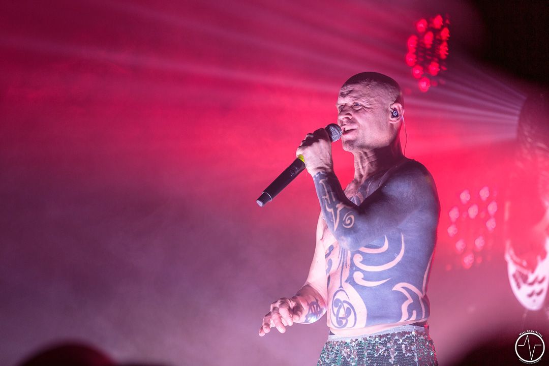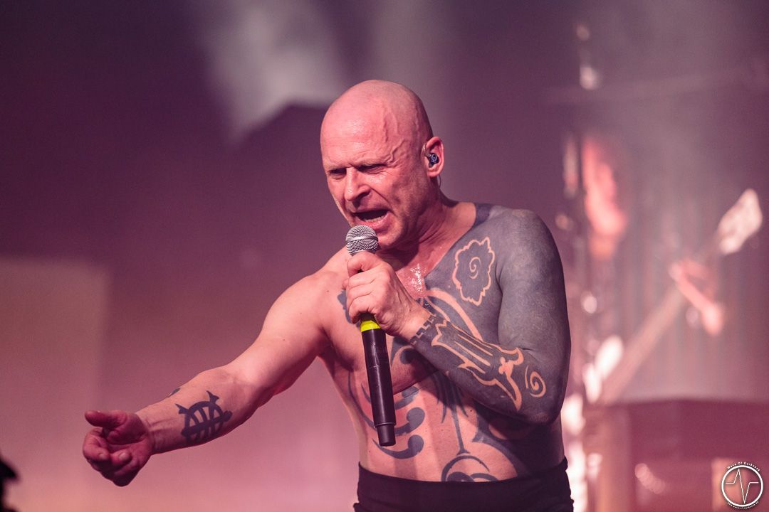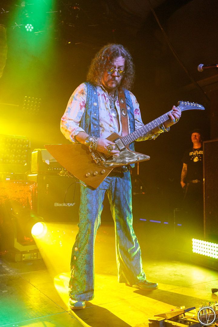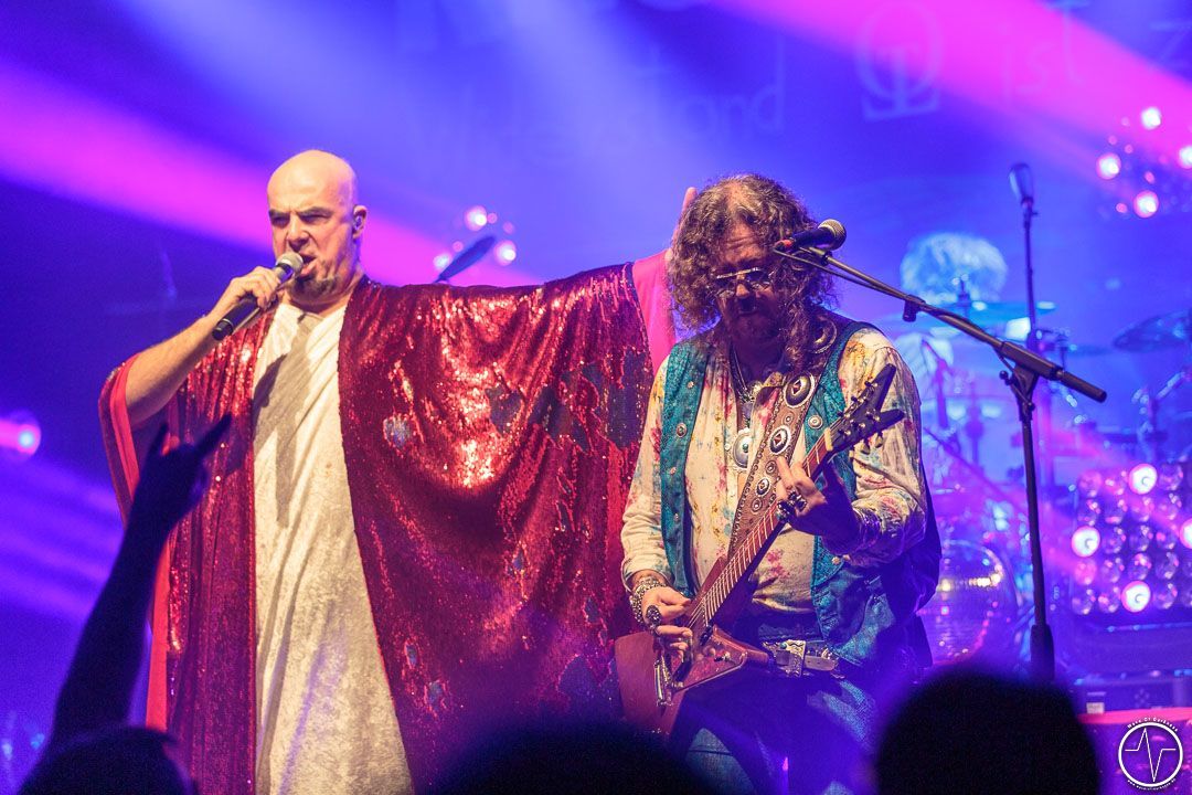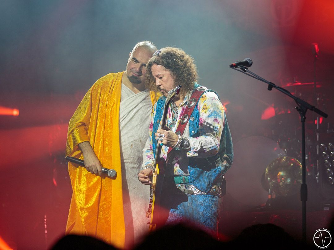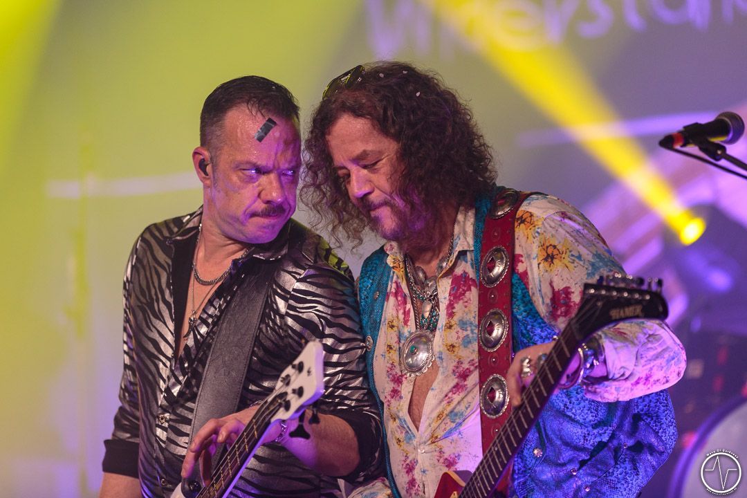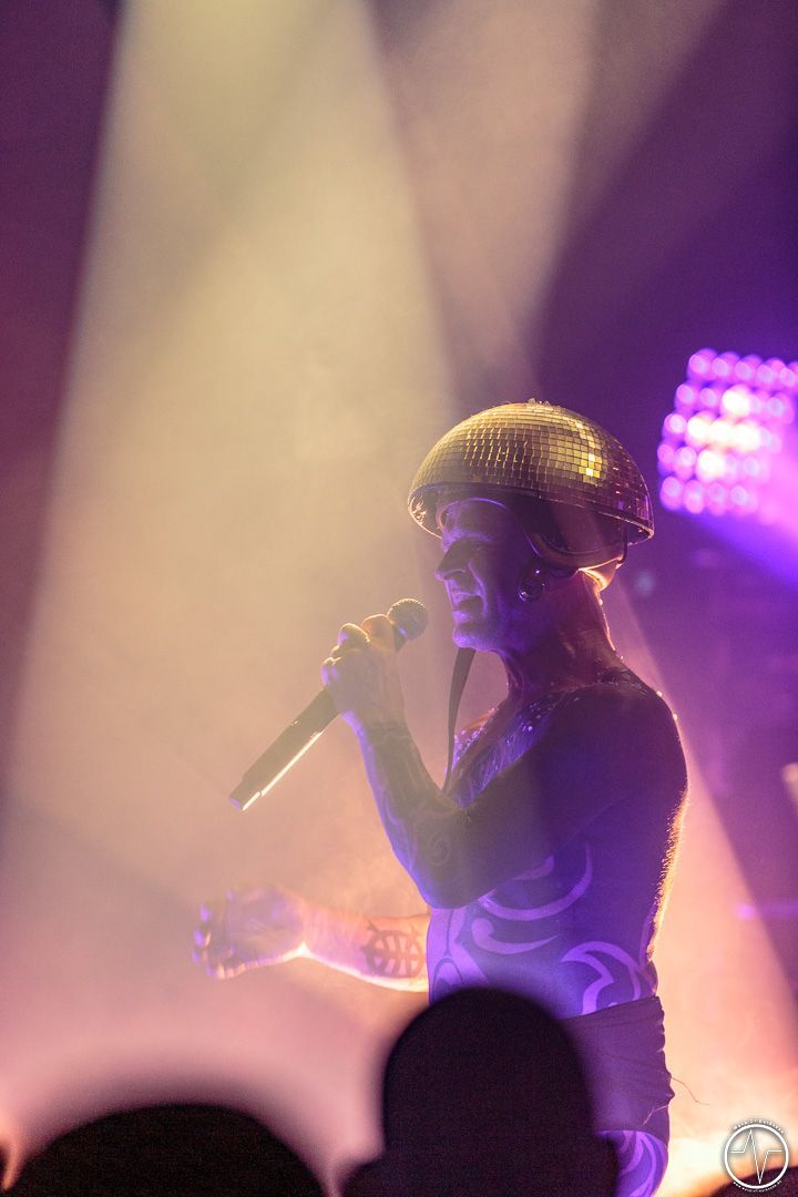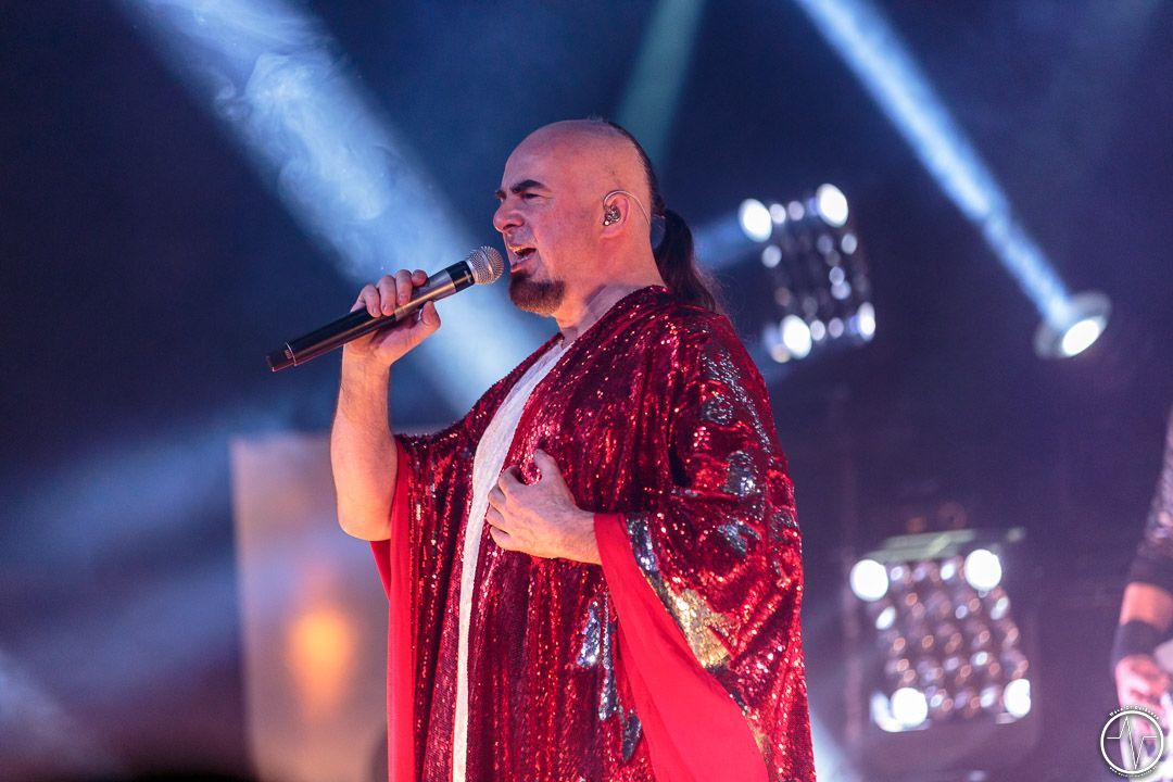 Der unbedachte Neuling dürfte wohl mit musikalischer Poesie der Berliner Band überfordert sein. Dies zeigt sich schon von Anfang an. Anstatt einer Vorband steht ein übergroßer Bildschirm vorne, auf dem skurrile Videoclips mal mit mal ohne die „meiste Band der Welt“ für Belustigung sorgt. Die neu synchronisierten Videoausschnitte nehmen vor allem die Kollegen auf die Schippe – von Rammstein über Ed Sheeran bis hin zu der Musikerformation selbst ist ein witziger Querschnitt geboten. Unter den besonders schrägen Orchesterklängen starten Stumpen, Alf, Raijko, Nick und die alte Frau BuzzDee mit ihrer „Absolution“ und damit gleich ein Song, der den vollen Umfang von der Gesangsstimme repräsentiert. Doch nicht nur als ausgebildeter klassischer Sänger sondern auch als eigenartiger Entertainer weiß der zappelige Frontmann zu begeistern. Im Gold glitzernden Outfit samt plüschigen Puschel-Hausschuhen steht der kleine Stumpen auf dem Podest, während er in hohem Operngesang seine schein-lateinischen Wörter jenseits der Schamgrenze trällert. Ebenso glitzernd flankieren Alf Ator am Keyboard und Buzz Dee an der Gitarre die Lebensweisheiten bei „Es kotzt mich an“ oder „Du bist schuld“ im aggressiven Metalsound. Alf, der sich auch als Komponist und Texter verantwortlich zeichnet, stampft in überdimensionalen Plateauschuhen über die Bühnen, um mal mit Stumpen im Duett oder mal solo zu singen. Derweil treibt der stets gechillte Buzz Dee mit seiner hippen Retro-Figur und seinem harten Gitarrenspiel selbstbestimmt den Sound voran.