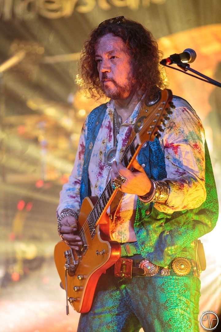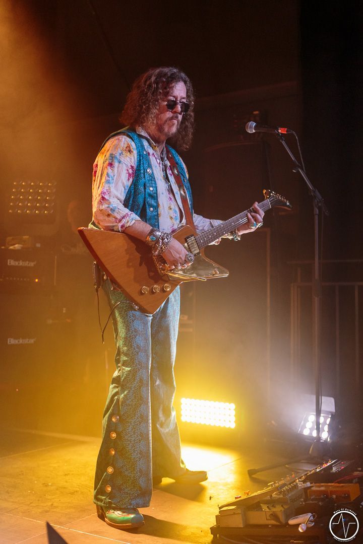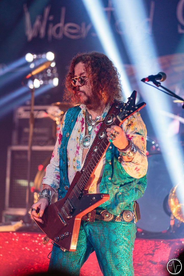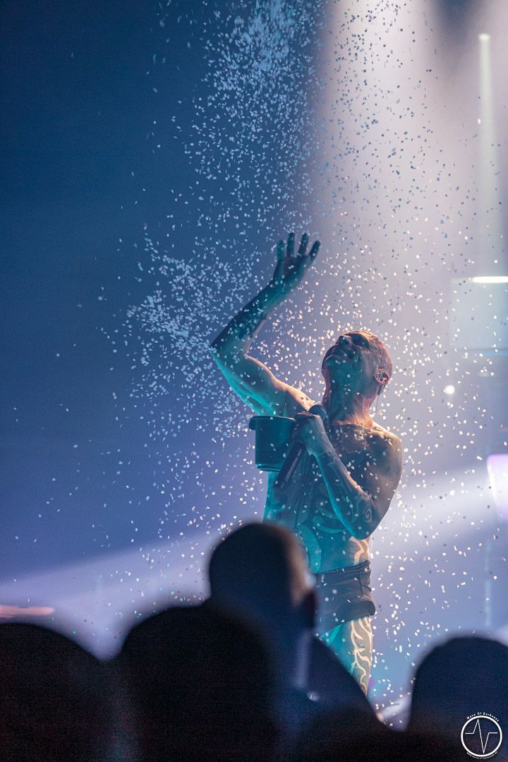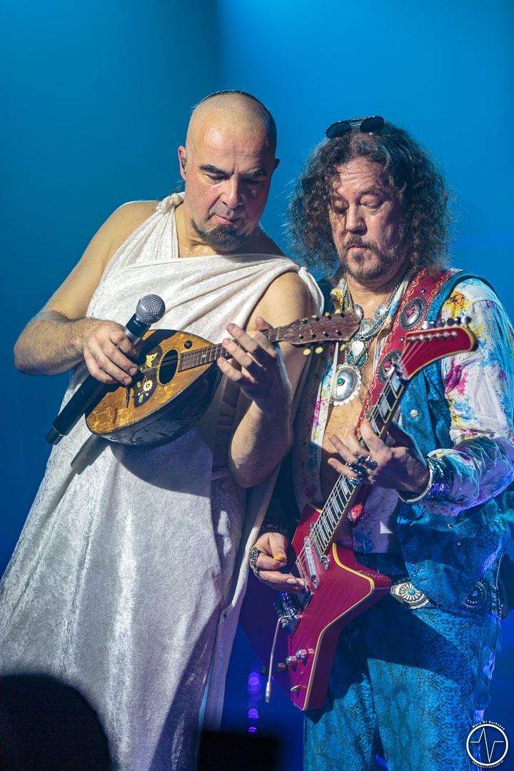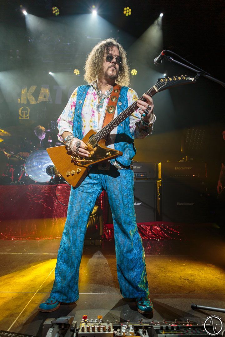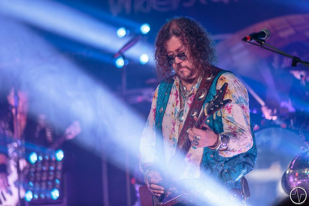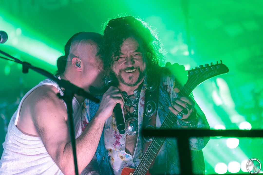 Der unbedachte Neuling dürfte wohl mit musikalischer Poesie der Berliner Band überfordert sein. Dies zeigt sich schon von Anfang an. Anstatt einer Vorband steht ein übergroßer Bildschirm vorne, auf dem skurrile Videoclips mal mit mal ohne die „meiste Band der Welt“ für Belustigung sorgt. Die neu synchronisierten Videoausschnitte nehmen vor allem die Kollegen auf die Schippe – von Rammstein über Ed Sheeran bis hin zu der Musikerformation selbst ist ein witziger Querschnitt geboten. Unter den besonders schrägen Orchesterklängen starten Stumpen, Alf, Raijko, Nick und die alte Frau BuzzDee mit ihrer „Absolution“ und damit gleich ein Song, der den vollen Umfang von der Gesangsstimme repräsentiert. Doch nicht nur als ausgebildeter klassischer Sänger sondern auch als eigenartiger Entertainer weiß der zappelige Frontmann zu begeistern. Im Gold glitzernden Outfit samt plüschigen Puschel-Hausschuhen steht der kleine Stumpen auf dem Podest, während er in hohem Operngesang seine schein-lateinischen Wörter jenseits der Schamgrenze trällert. Ebenso glitzernd flankieren Alf Ator am Keyboard und Buzz Dee an der Gitarre die Lebensweisheiten bei „Es kotzt mich an“ oder „Du bist schuld“ im aggressiven Metalsound. Alf, der sich auch als Komponist und Texter verantwortlich zeichnet, stampft in überdimensionalen Plateauschuhen über die Bühnen, um mal mit Stumpen im Duett oder mal solo zu singen. Derweil treibt der stets gechillte Buzz Dee mit seiner hippen Retro-Figur und seinem harten Gitarrenspiel selbstbestimmt den Sound voran.
