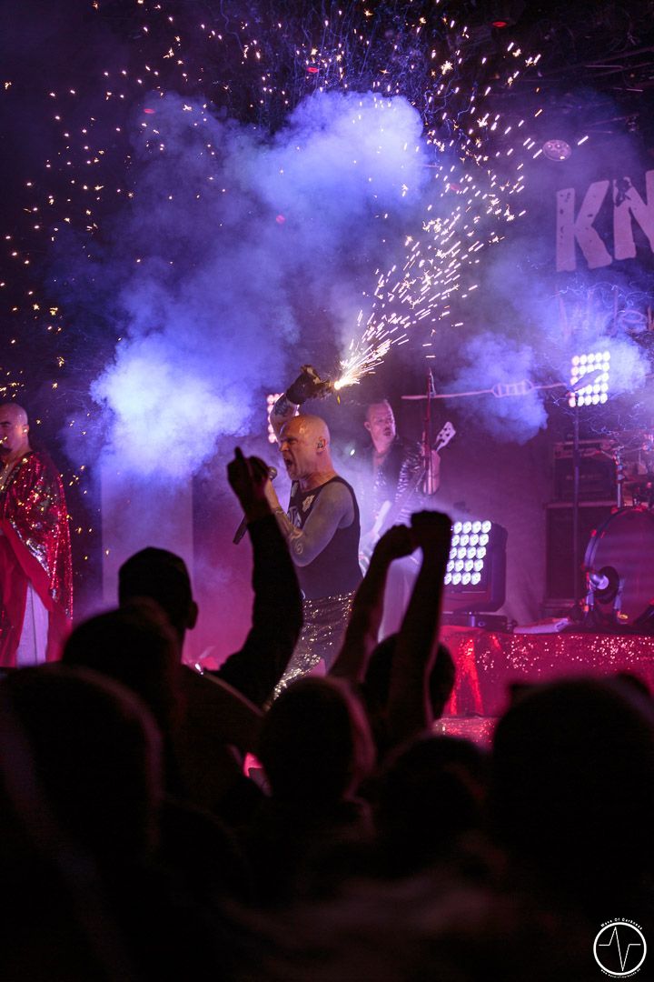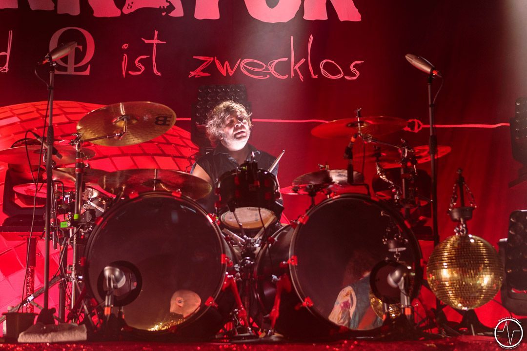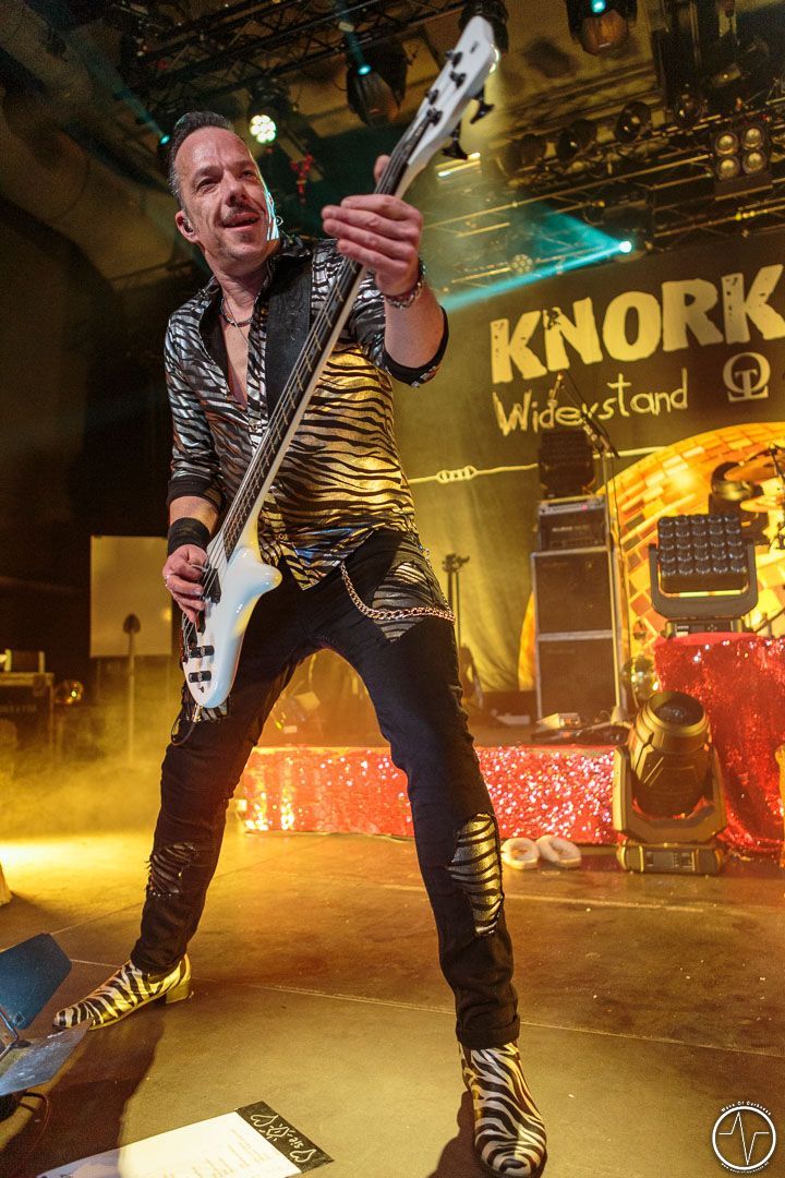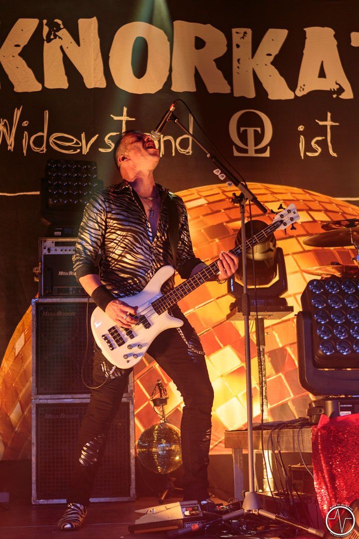 Die Fans sind ebenso wie Knorkator an diesem Abend mit Hingabe dabei und sich in der Heidelberger halle02 in für nichts zu schade. Lametta fliegt von dem Podium, während die Halle textsicher die extravagante Lyrik begleitet. Wer nicht mitmacht, muss damit rechnen, von Stumpen geknutscht zu werden. So geschieht es zumindest einem jungen Herrn in den vorderen Reihen. Ein anderer Fan, der das wilde Treiben eigentlich mit seinem Smartphone festzuhalten beabsichtigte, bekommt ein „Autogramm“ der besonderen Art. Der spärlich bekleidete Sänger trägt das Gerät für eine Weile in seiner engen Hose trägt, zuerst vorne dann hinten. Die Berliner Schnauze mit temporärer Pumuckl-Stimme macht sich aber nicht alleine zum Affen. Zwei (frei)willige Damen werden bei „Ich hasse Musik“ zum Keyboardständer. Eben dieses wird an Helmen befestigt, auf dem Alf wie immer mit Anmut und Körperspannung spielt und im Anschluss in guter Rockmanier zerschlagen wird. Der Unterhaltung wert ist hoch: Ob mit Diskohalbkugel oder Funkenregen auf dem Kopf, mal im Glitzergewand und mal halbnackt in weiblicher Latexhose ist die Darbietung kurzweilig. Die Bühnenshow bedient sich trotz allem willkürlich wirkendem Klamauk ausgewählter Zutaten und vereint das Beste aus verschiedenen Welten. Was daraus entsteht ist die knorke Welt von Knorkator, angesiedelt im Irgendwo zwischen Genie und Wahnsinn. Denn wie besingt die Band (ironisch) im Lied „Rette sich wer kann“: „Die Farben leuchten, die Lichter funkeln und alles dreht sich zur Musik. So ist es perfekt, so soll es bleiben. Für immer Liebe, Spaß und Glück.“