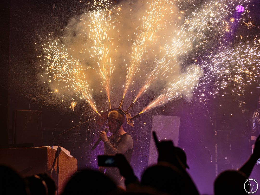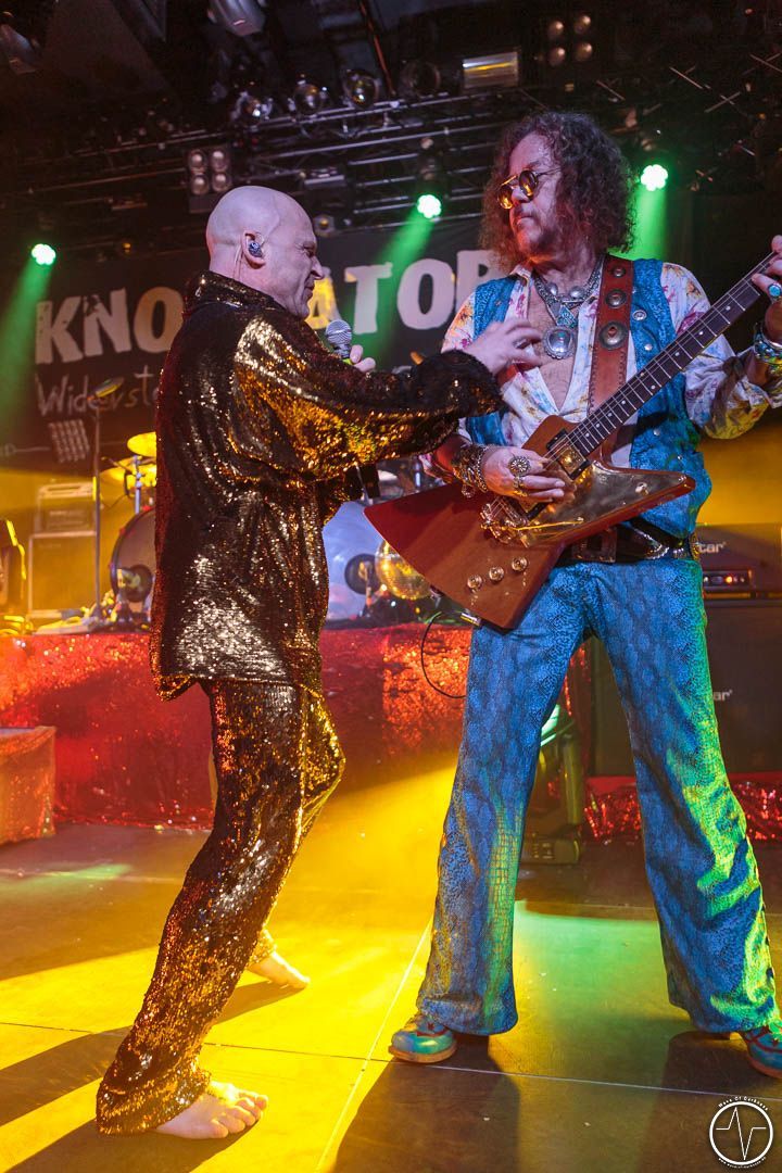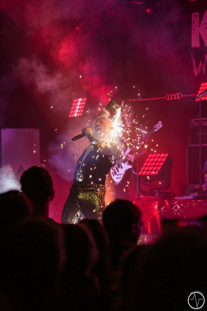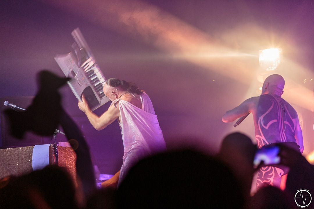 Die Fans sind ebenso wie Knorkator an diesem Abend mit Hingabe dabei und sich in der Heidelberger halle02 in für nichts zu schade. Lametta fliegt von dem Podium, während die Halle textsicher die extravagante Lyrik begleitet. Wer nicht mitmacht, muss damit rechnen, von Stumpen geknutscht zu werden. So geschieht es zumindest einem jungen Herrn in den vorderen Reihen. Ein anderer Fan, der das wilde Treiben eigentlich mit seinem Smartphone festzuhalten beabsichtigte, bekommt ein „Autogramm“ der besonderen Art. Der spärlich bekleidete Sänger trägt das Gerät für eine Weile in seiner engen Hose trägt, zuerst vorne dann hinten. Die Berliner Schnauze mit temporärer Pumuckl-Stimme macht sich aber nicht alleine zum Affen. Zwei (frei)willige Damen werden bei „Ich hasse Musik“ zum Keyboardständer. Eben dieses wird an Helmen befestigt, auf dem Alf wie immer mit Anmut und Körperspannung spielt und im Anschluss in guter Rockmanier zerschlagen wird. Der Unterhaltung wert ist hoch: Ob mit Diskohalbkugel oder Funkenregen auf dem Kopf, mal im Glitzergewand und mal halbnackt in weiblicher Latexhose ist die Darbietung kurzweilig. Die Bühnenshow bedient sich trotz allem willkürlich wirkendem Klamauk ausgewählter Zutaten und vereint das Beste aus verschiedenen Welten. Was daraus entsteht ist die knorke Welt von Knorkator, angesiedelt im Irgendwo zwischen Genie und Wahnsinn. Denn wie besingt die Band (ironisch) im Lied „Rette sich wer kann“: „Die Farben leuchten, die Lichter funkeln und alles dreht sich zur Musik. So ist es perfekt, so soll es bleiben. Für immer Liebe, Spaß und Glück.“