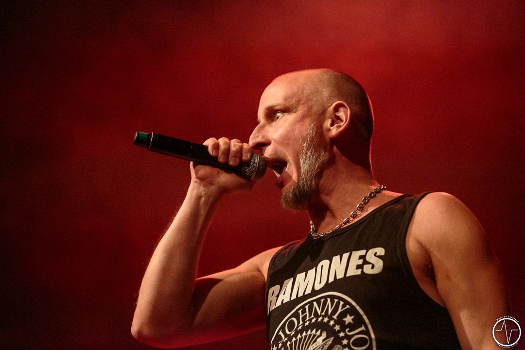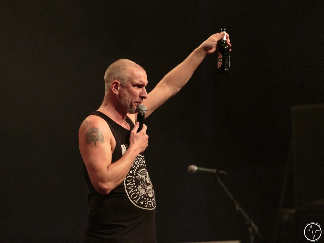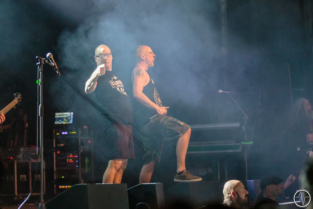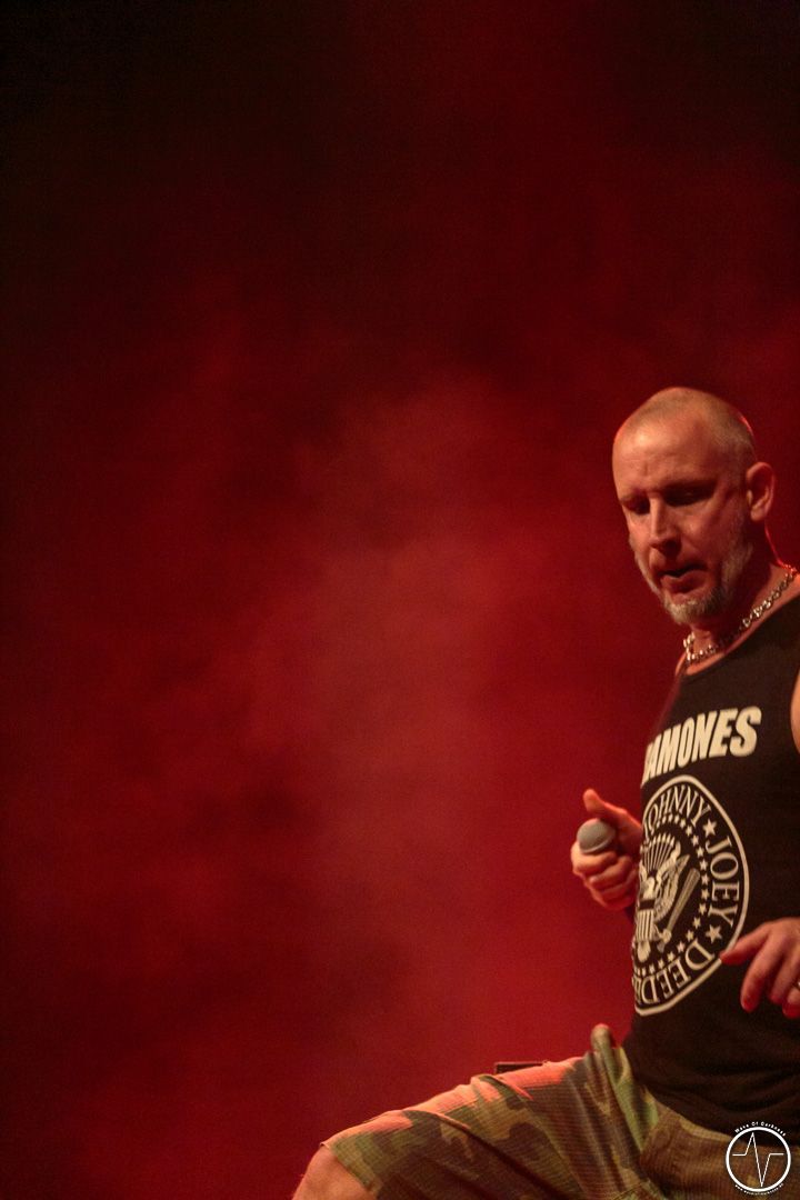 Und mehr Spaß folgt. Mit einer eigenen Version des James Bond Titelsongs „Goldfinger“ – in dem Fall „Clawfinger“ – betreten die Schweden von Clawfinger die Bühne, um daraufhin ein Feuerwerk der guten Laune abzubrennen, das angelehnt ist an die erfolgreichen Jahre der Band. Dass diese Ära schon ein paar Tage auf dem Buckel hat, hat die Band auch festgestellt. „Wer ist hier, der damals „Deaf Dumb Blind“ gekauft hat, fragt Sänger Zak Tell. Die vielen aufzeigenden Hände, die von frenetischem Jubel begleitet werden, zeigen, dass viele des mittleren Alters anwesend sind. Der Frontmann bedankt sich fürs Kommen, um ein paar „middle aged men make a fool of themselves“ und zeigt stolz seinen kleinen Bierbauch.