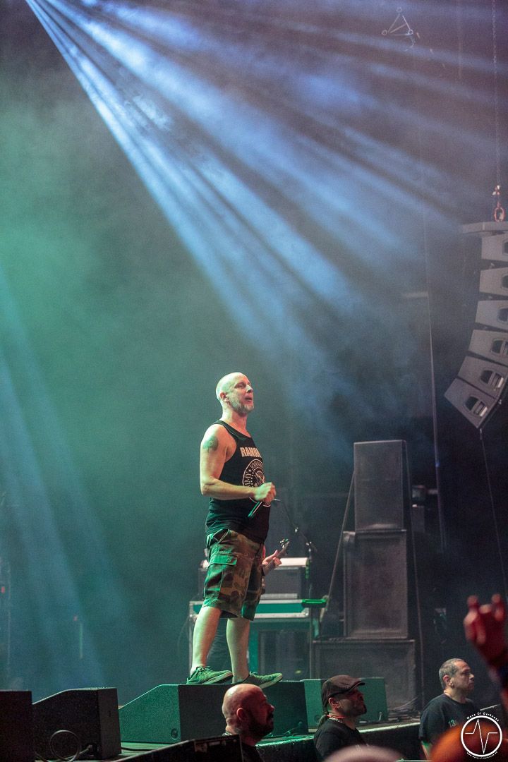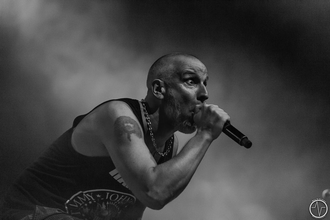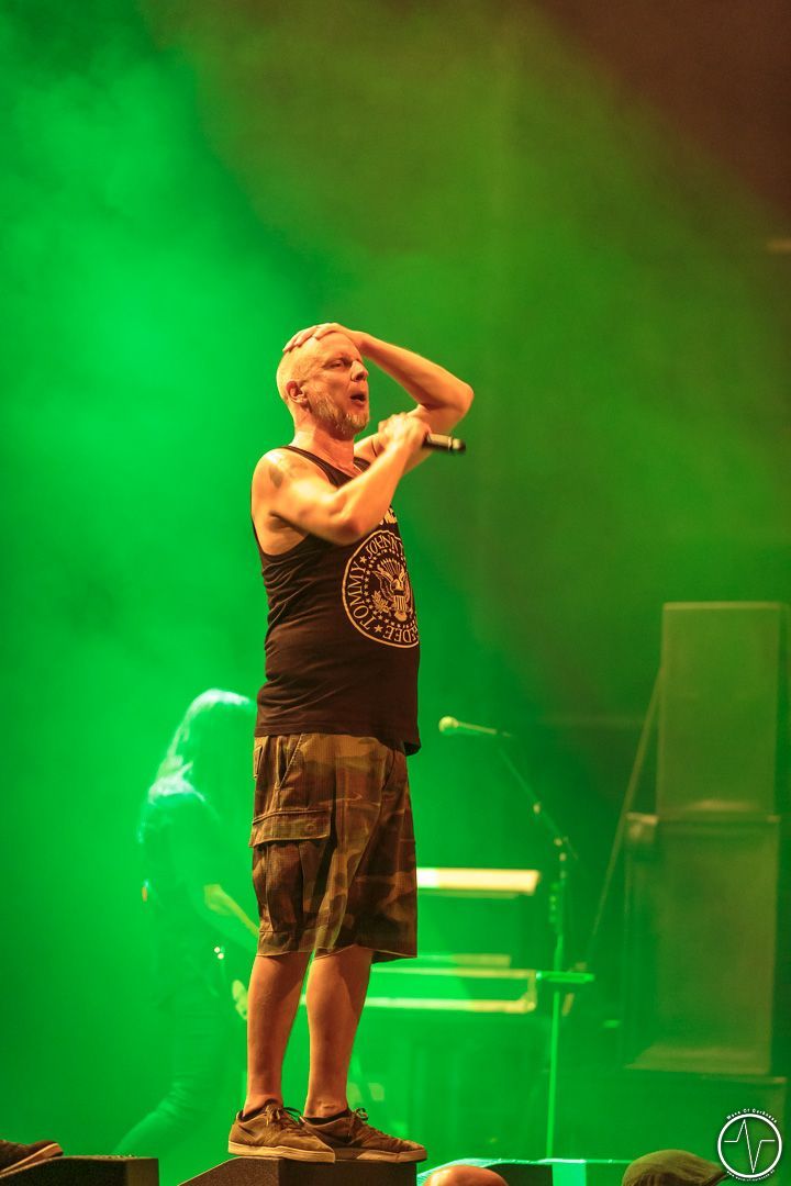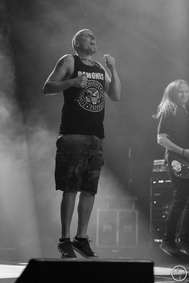 Und mehr Spaß folgt. Mit einer eigenen Version des James Bond Titelsongs „Goldfinger“ – in dem Fall „Clawfinger“ – betreten die Schweden von Clawfinger die Bühne, um daraufhin ein Feuerwerk der guten Laune abzubrennen, das angelehnt ist an die erfolgreichen Jahre der Band. Dass diese Ära schon ein paar Tage auf dem Buckel hat, hat die Band auch festgestellt. „Wer ist hier, der damals „Deaf Dumb Blind“ gekauft hat, fragt Sänger Zak Tell. Die vielen aufzeigenden Hände, die von frenetischem Jubel begleitet werden, zeigen, dass viele des mittleren Alters anwesend sind. Der Frontmann bedankt sich fürs Kommen, um ein paar „middle aged men make a fool of themselves“ und zeigt stolz seinen kleinen Bierbauch.