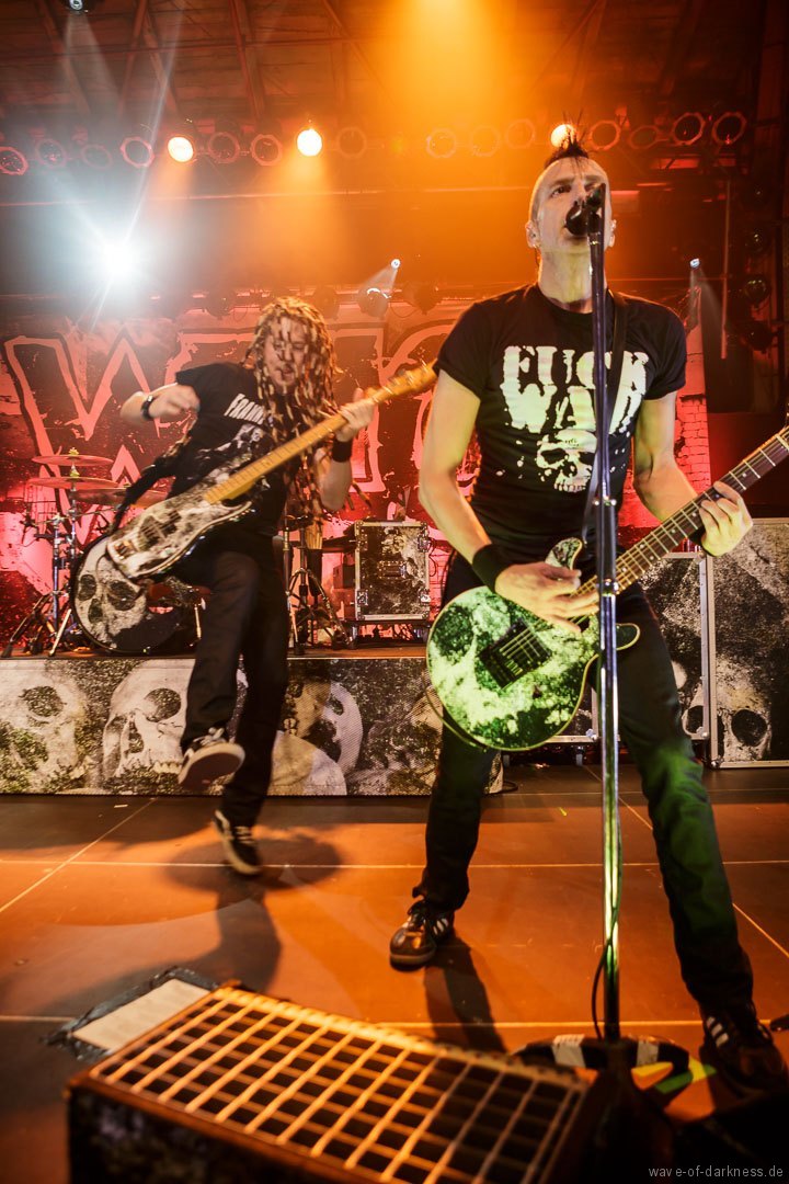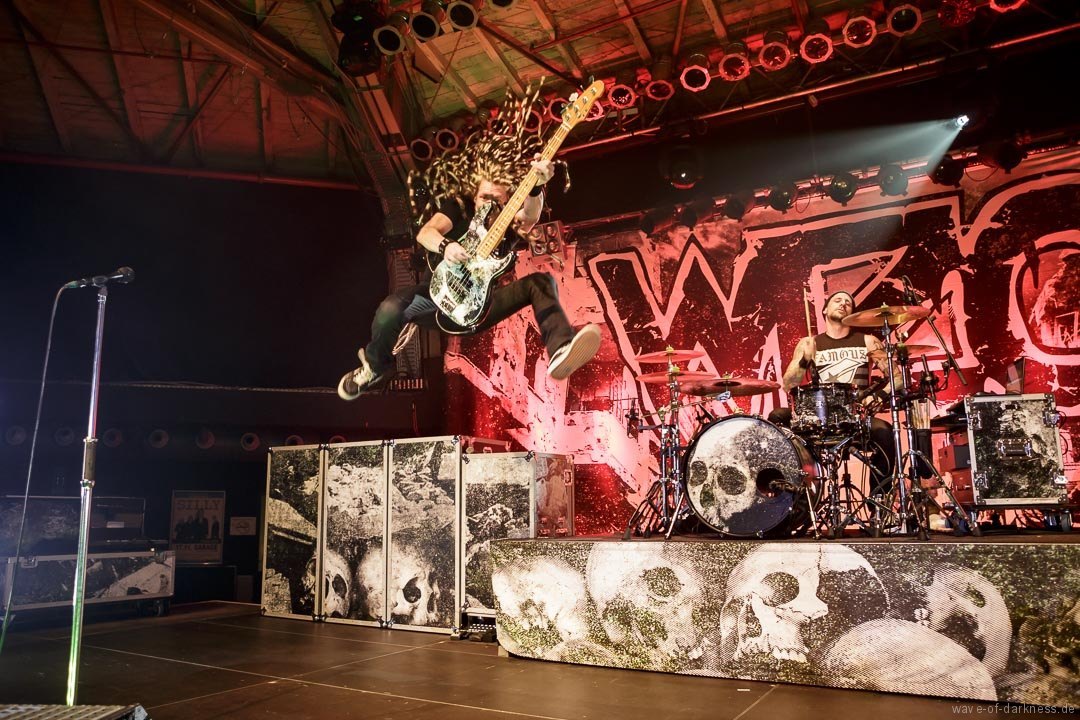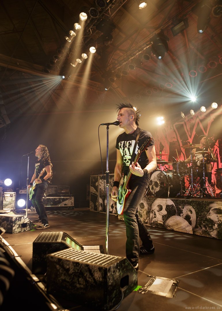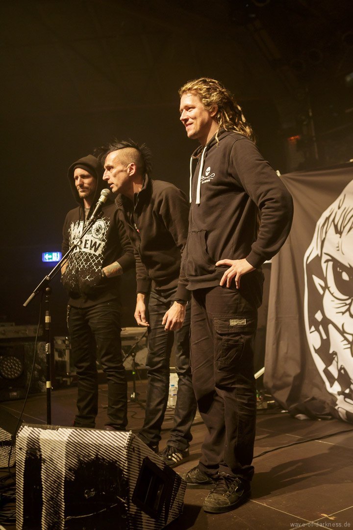 Mit leichter Verzögerung betraten am Sonntagabend Axel, der Frontmann von WIZO, zusammen mit Bassist Ralf und Schlagzeuger Alex die Bühne, um ihre Vorband, mit der sie schon sehr lange befreundet sind, den angereisten Fans anzukündigen. Unter kräftigem Beifall legten die Abstürzende Brieftauben dann auch direkt los und die Fans waren sofort mit dabei. Sogleich bildete sich in der Mitte des Raumes ein Pogokreis, in dem bunte Haare umherwirbelten, um gleich wieder in der Masse zu verschwinden. Die beiden „Tauben“ Mirco und Olli auf der Bühne spielten in den knapp 45 Minuten einen gelungenen Mix von alten Hits und neuen Liedern aus dem aktuellen Album „Doofgesagte leben länger“. Sowohl alt wie auch jung – man bedenke, dass viele Besucher deutlich jünger waren als die Band existiert – feierten und würdigten die kultige Fun-Punkband aus Hannover. Die Abstürzende Brieftauben waren mehr als nur ein Support, sie waren vielmehr ein Co-Headliner, der vor dem Hauptakt eine ausgelassene Reise in den Deutschpunk der 80er und 90er startete.