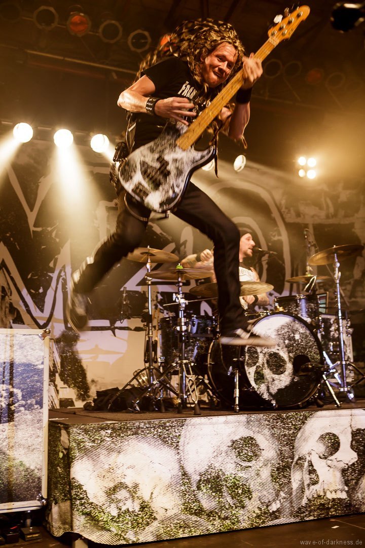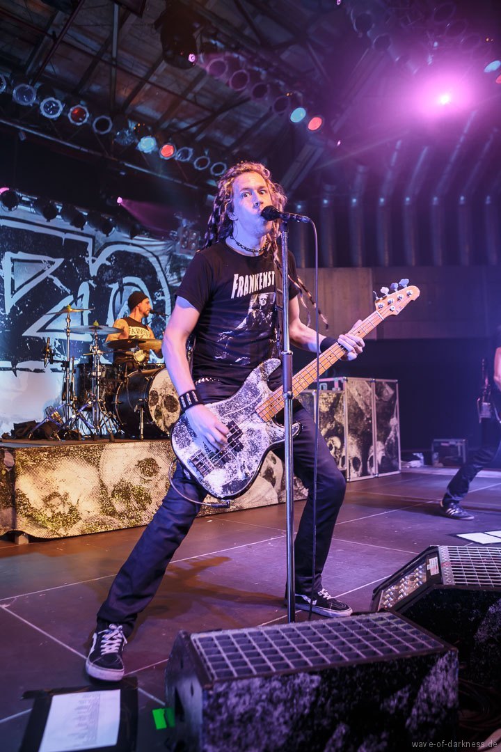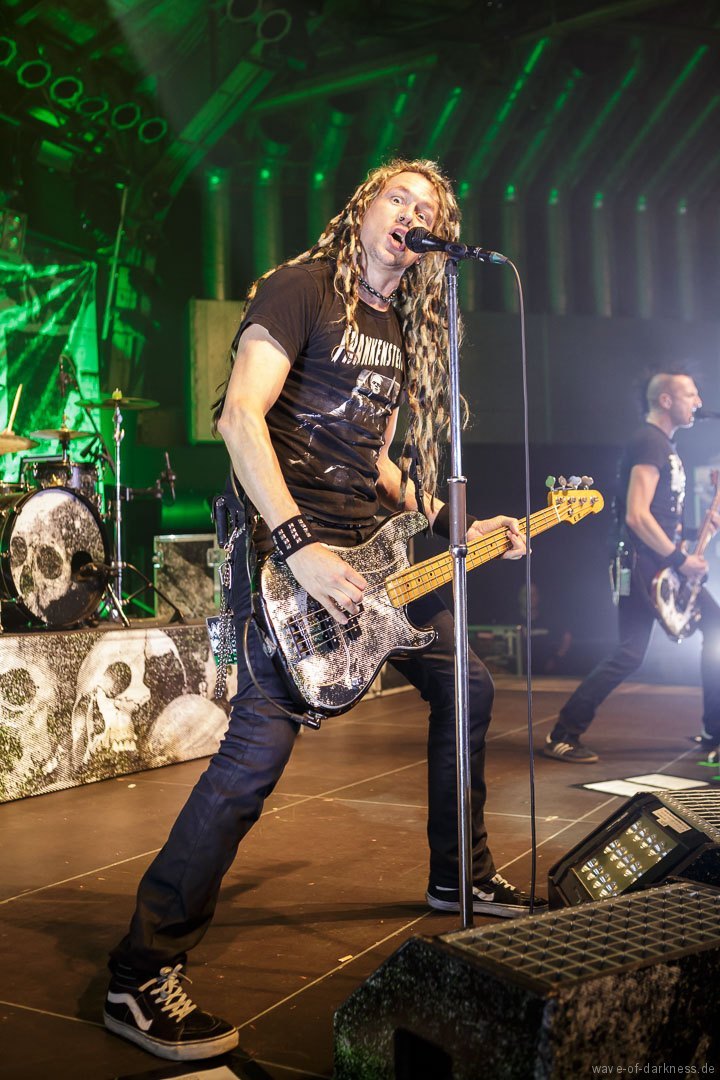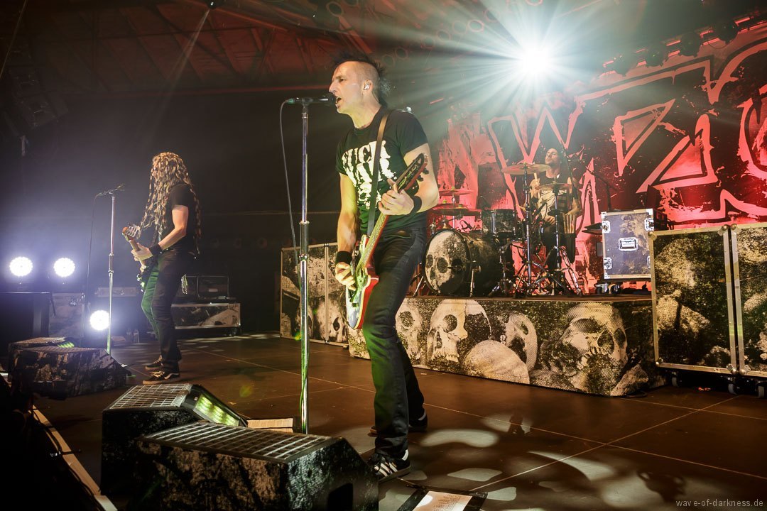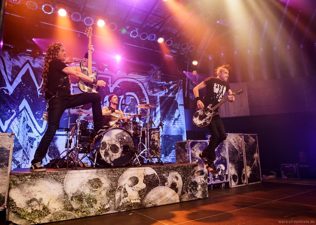 Mit leichter Verzögerung betraten am Sonntagabend Axel, der Frontmann von WIZO, zusammen mit Bassist Ralf und Schlagzeuger Alex die Bühne, um ihre Vorband, mit der sie schon sehr lange befreundet sind, den angereisten Fans anzukündigen. Unter kräftigem Beifall legten die Abstürzende Brieftauben dann auch direkt los und die Fans waren sofort mit dabei. Sogleich bildete sich in der Mitte des Raumes ein Pogokreis, in dem bunte Haare umherwirbelten, um gleich wieder in der Masse zu verschwinden. Die beiden „Tauben“ Mirco und Olli auf der Bühne spielten in den knapp 45 Minuten einen gelungenen Mix von alten Hits und neuen Liedern aus dem aktuellen Album „Doofgesagte leben länger“. Sowohl alt wie auch jung – man bedenke, dass viele Besucher deutlich jünger waren als die Band existiert – feierten und würdigten die kultige Fun-Punkband aus Hannover. Die Abstürzende Brieftauben waren mehr als nur ein Support, sie waren vielmehr ein Co-Headliner, der vor dem Hauptakt eine ausgelassene Reise in den Deutschpunk der 80er und 90er startete.