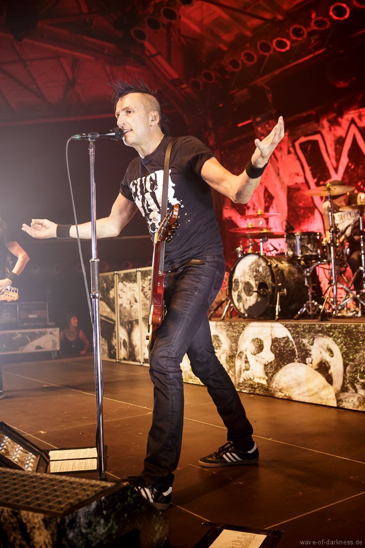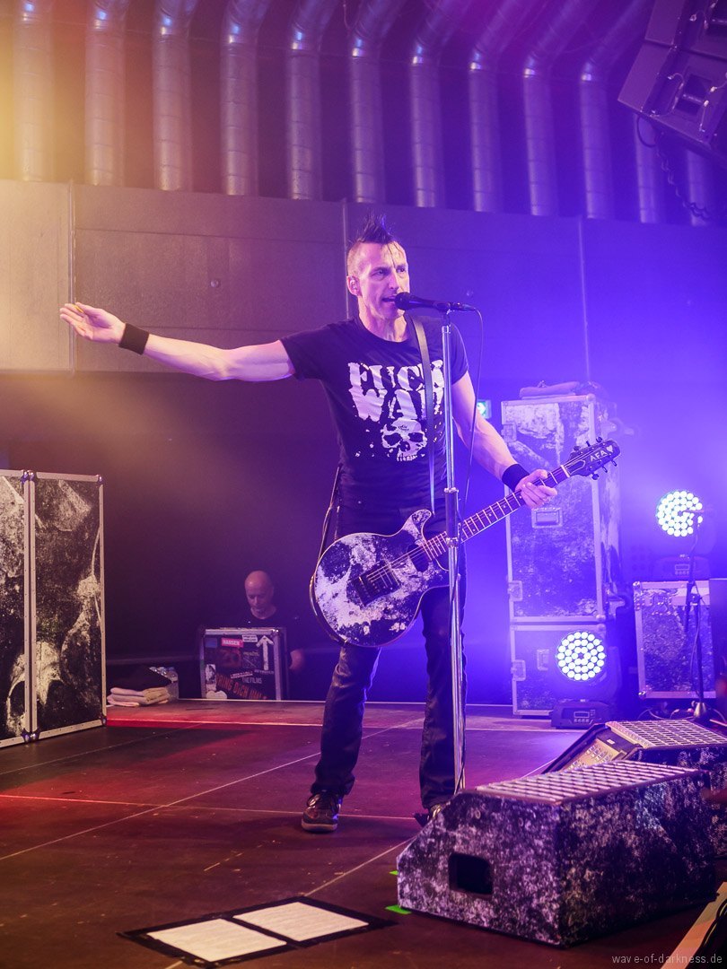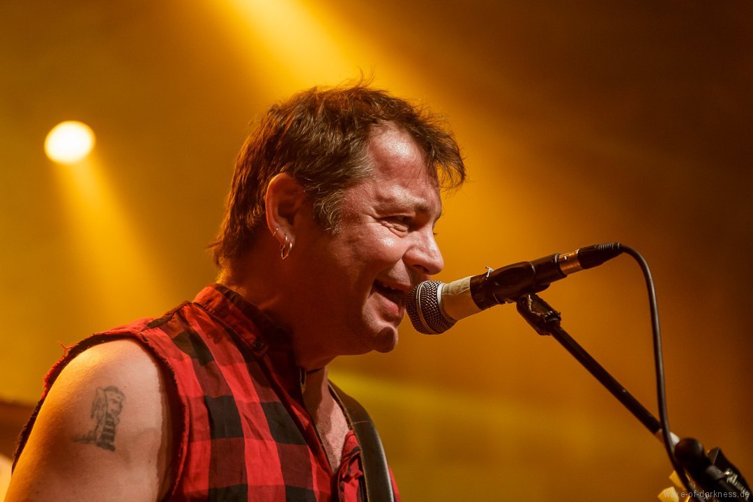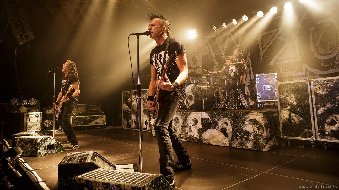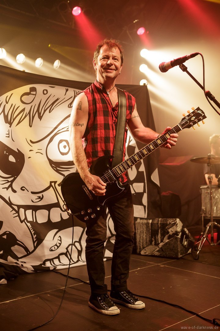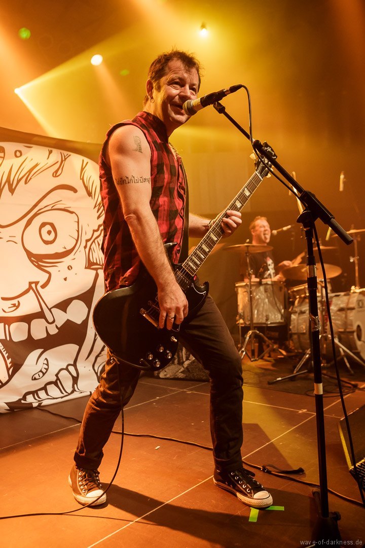 So fieberte das schon angeheizte Publikum dem Headliner entgegen. Doch WIZO ließ nicht lange auf sich warten. Nach einem kurzen Intro startete die Punkband aus Sindelfingen mit „Adagio“ von der aktuellen Scheibe „DER“. Vom ersten bis zum letzten Ton waren auch hier die Fans ganz nah bei der Band. Der sich nie schließen wollende Pogokreis wurde zeitweise von Bier getränkt, das in der Euphorie nicht ausgetrunken sondern einfach samt Becher in die Luft geworfen wurde. Dazu sah man wie sich junge Punks von der feiernden Menge mehr oder weniger kontrolliert nach vorne tragen ließen. In der etwa 100-minütigen Party wurde es aber auch zeitweise laut Axel „sentimental“. Mit nostalgischem Blick schweifte der Frontmann zwischendurch über die mitgröhlende Menge und bedankte sich bei den langjährigen Fans, welche die Band seit vielen Jahren unterstützte. Auch ließen Ralf und Axel es nicht aus, immer wieder den unverändert rebellisch sowie eindeutig linksorientierten Standpunkt der Punkband zu verdeutlichen. Insgesamt überzeugte WIZO mit einer mitreißenden Bühnenpräsenz und Publikumsnähe ohne große Effekthascherei und vollendete die ausgelassene Reise in den Deutschpunk der 80er und 90er. Fazit: Ein ausgelassener Punkrockabend mit zwei kultigen Bands in toller Feierlaune!