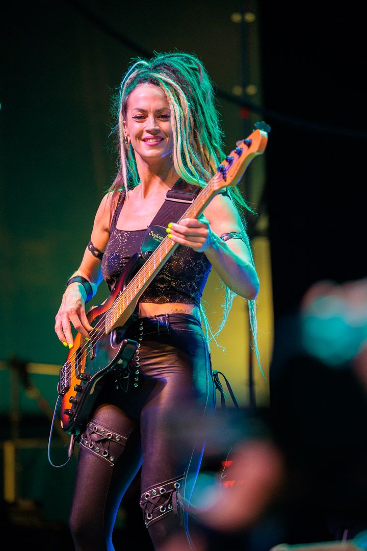 Auf der LED-Leinwand im Hintergrund drehte sich eine Bronzemünze mit einem großen M. Dazu erzählte eine düstere Stimme von weiten Galaxien und dem Ende der Welt. „Germany, let’s rock this place“, begrüßte der sichtlich gut gelaunte Bruce Dickinson mit unverkennbarer Stimme. Ein Meer aus Jung und Alt grölte in den ersten Tönen von „Accident Of Birth“ ihm vor Freude entgegen. „Abduction“ und das erste Lied aus dem neuen Album „Afterglow of Ragnarok“ brachten die Metalheads ordentlich in Bewegung, doch Dickinson stand ihnen in nichts nach. Im Gegenteil: Der 65-Jährige wirbelte scheinbar unermüdlich zwischen den beiden Gitarristen von Seite zu Seite, vorbei an der Bassistin, deren blonde Dreadlocks ebenso herumwirbelten. Ausladende Gesten begleiteten seine energische Performance, wie bei „Chemical Wedding“. Bruce benötige viel Raum und zurecht feierte das Publikum die stimmgewaltige Metal-Ikone. In den instrumentalen Passagen treten die anderen Musiker ins Scheinwerferlicht. Ob O’Callaghan, die immer wieder mit dem Publikum flirtete, oder Mistheria im Cowboy-Hut oder auch Chris und Philip ernteten alle bei ihren Soli, beispielsweise bei „Frankenstein“, für jede Action mächtig Applaus.