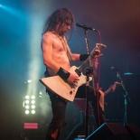 Als Lord Of The Lost die Bretter entern, wird es wahnsinnig laut in der rappelvollen Garage. Das Publikum feiert den erst kürzlichen ESC-Teilnehmer noch vor dem ersten Ton: grandiose Stimmung schon von Anfang an. Wie wild rennt Chris „The Lord“ Harms beim Opener „The Curtain Falls“ von einem Ende zum anderen, auf das Podium und wieder zurück. Gitarrist Pi und Bassist Klaas stehen ihm auch bei „Morgana“ im Anschluss dabei in nichts nach. „No Respect for Disrespect“ grölt es lauthals aus der Menge, in deren Mitte sich immer wieder ein schweißtreibender Moshpit bildet. In einer kleinen Verschnaufpause bedankt der Frontmann beim Publikum für das zahlreiche Erscheinen – besonders bei den treuen Fans, unter denen heute eine junge Frau demnach ihr 74. LOTL-Konzert besucht. Dann noch schnell die Frisur richten und so kann der Lord mit „Absolute Attitude“ weiter rocken. Mit „And It Was Night“ – noch immer eines meiner Favoriten – und „Judas“ beglücken Lord Of The Lost mit Songs aus dem Vorgängeralbum. Die Fünf sind offensichtlich guter Laune, witzeln untereinander und treten stets in Kontakt mit ihren Fans. Die energische Performance und natürlich vor allem die mitreisende Liedauswahl lässt fast niemanden mehr ruhig stehen und fast keine Stirn mehr trocken. „Destruction Manual“ gefolgt von „Full Metal Whore“ legen noch eine Schippe drauf und heizen nochmal so richtig ein: Ein Konzerterlebnis wie es sein soll!