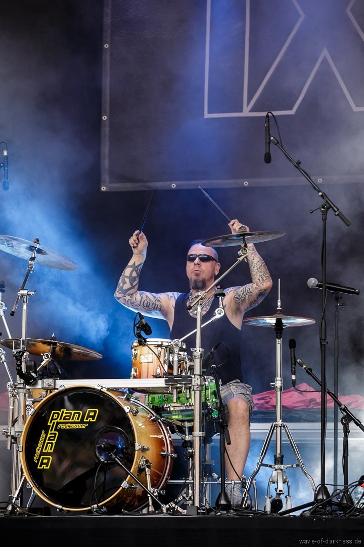 Der zweite RockFels-Tag begann etwas undurchsichtlich, sowohl wettertechnisch als auch organisatorisch. Zum einen sollte es schon früh Regen geben und zum anderen sollte bald Mustasch spielen. Beides war jedoch nicht der Fall. Nach der tollen Rockcover-Band Plan A sprangen TXL für die Schweden ein, da es ihr Sänger wegen des Pilotenstreiks nicht rechtzeitig zu Spielbeginn schaffte. Dennoch kamen die restlichen Bandmitglieder für ein Lied auf die Bühne, bei dem Halid (TXL-Sänger) mit seiner Stimme spontan aushalf. Wo bei den meisten Bands des Genres schwarz die dominierende Farbe ist, regierte bei der anschließenden Band rosarot. Mit J.B.O. traten nun die Partymetaller aus Erlangen auf und starteten wie im gleichnamigen Lied die Feier auf der Loreley, und das obwohl sie ihr geliebtes Kitzmann-Bier angeblich zuhause vergessen haben. Dieses Stimmungslevel konnten die vier Dänen von D-A-D trotz mitreißendem Oldschoolrock und überraschend großer Fanbase zwar nicht erreichen, aber präsentierten ein Sound, den man gerne noch länger hören wollte. Ensiferum, eine finnische Metal-Band, brannte mit ihrem brachialen Sound ein echtes Feuerwerk ab. Mit ihrem Viking- und Folk-Metal konnte der skandinavische Musikexport nicht nur die angereisten Fans überzeugen und sorgte somit für wehende Haare sowie nickende Köpfe auf den gefüllten Rängen des Amphitheaters. Mit Michael Kiske am Gesang und Gitarrero Hai Hansen war danach nicht nur für alte HELLOWEEN-Fans der Gig von Unisonic ein absoluter Genuss. Mit dem Klassiker aus den alten gemeinsamen Tagen „I Want Out“ und vielen eigenen Songs sorgte die Heavy-Metal-Band für ordentlich Stimmung, und das Publikum dankte es ihnen mit frenetischem Applaus. Es folgte nun der Auftritt des Checkers mit seiner Combo Eisbrecher, die es auf der Bühne anfänglich Geldscheine regnen und zum Ende hin schneien ließ. Wer die Jungs noch nicht live gesehen hat, sollte dies unbedingt nachholen. Denn Alexx & Co gehen immer „Volle Kraft voraus“ und fakelten auch am Samstag ein gewaltiges Feuerwerk aus unterhaltsamen Spielwitz, eindrucksvoller Liveshow und reiner Neuen Deutschen Härte ab. Mit Avantasia, einem großartigen Rock-Oper-Projekt, das von dem Kreativkopf Tobis Sammet in Leben gerufen wurde, fand das Festival einen spektakulären Abschluss. Eine sehenswerte Lightshow gepaart mit musikalischer Mystik sowie namhafter Gastmusiker verzauberte zwei Stunden lang die Loreley.