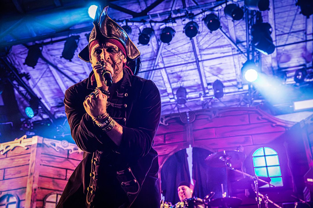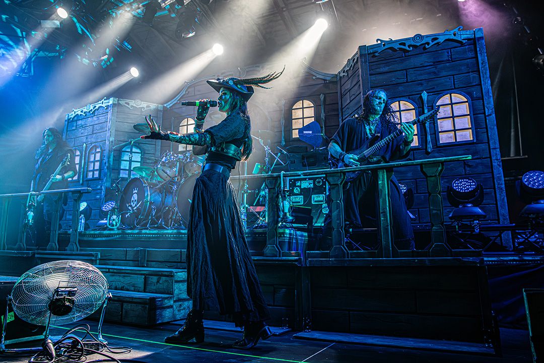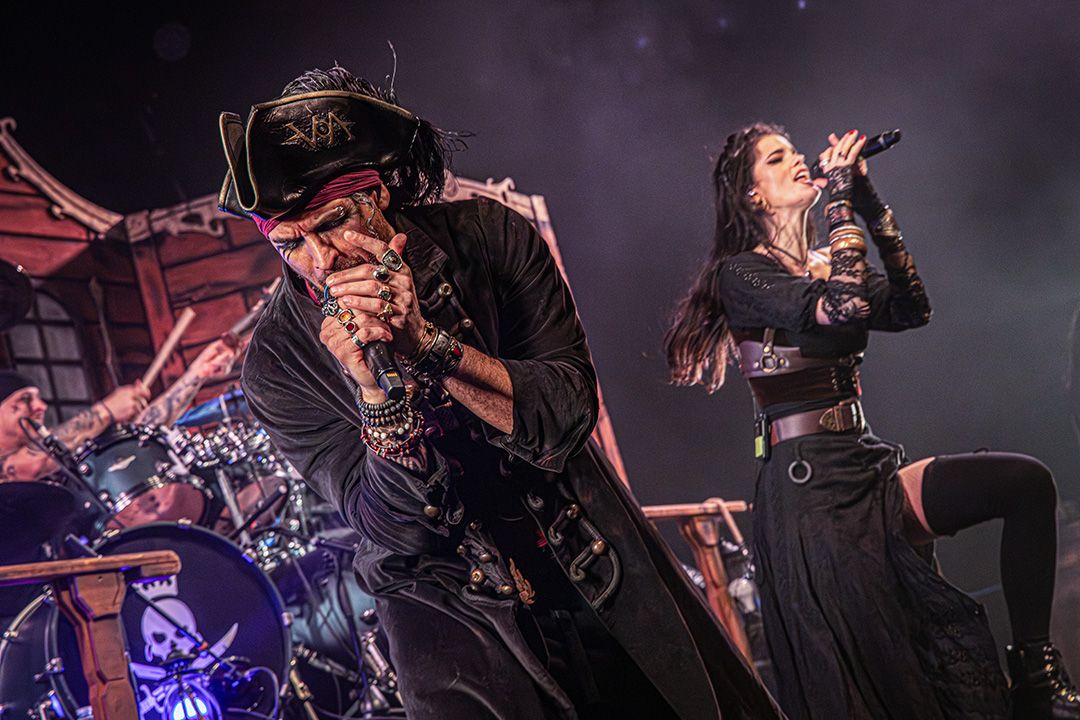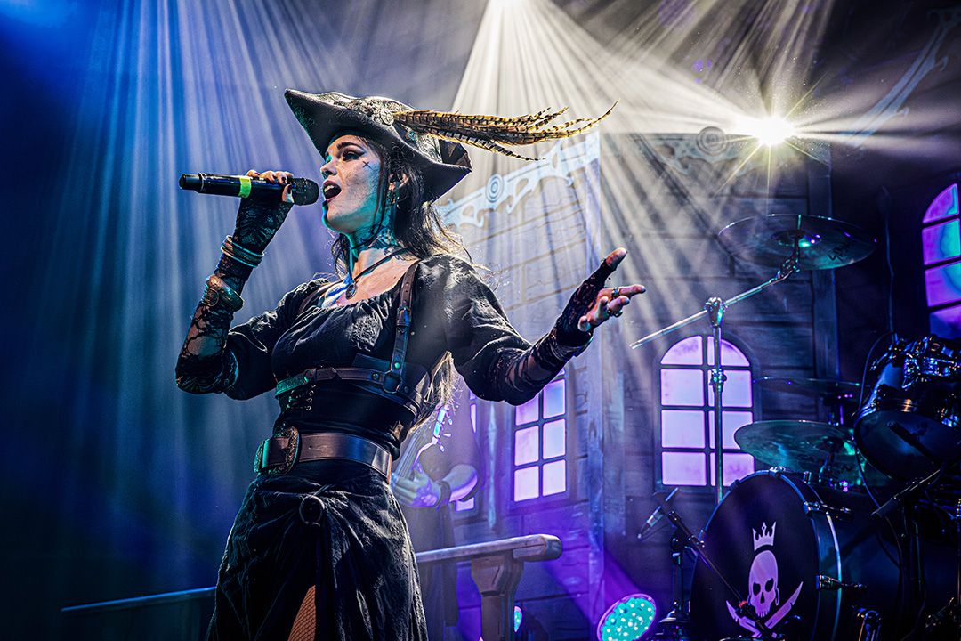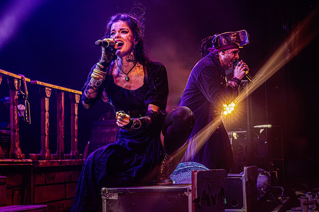 Beim Umbau dann wird schnell klar, dass Visions Of Atlantis großen Wert auf Atmosphäre legen. Die Bühne wirkt nach kurzer Zeit wie das Deck eines Schiffes kurz vor dem Auslaufen. Dieses Bild greift das Piratenkonzept der Band konsequent auf und Visions Of Atlantis übernehmen das Ruder während das Lichtdesign die Szenerie in wechselnde Blau- und Grüntöne hüllt. Fast so, als würde sich die Halle in eine nächtliche Seelandschaft verwandeln. Dezenter Nebel verstärkt den Eindruck von Gischt und Bewegung. Symphonic Metal trifft auf Piratenromantik, harte Riffs auf große Melodien. Das Zusammenspiel der beiden markanten Stimmen von Clementine Delauney und Michele Guaitoli sorgen für Gänsehaut. Während sich epische Refrains durch die Halle schieben und von der Crowd lautstark zurückgeworfen werden, wie z.B. bei „Legions of the Sea“, „Melancholy Angel“ und spätestens bei den hymnischen Nummern wie „Clocks“ gibt es kein Halten mehr.. Es zünden immer wieder Pyros, die die Bühne in grelles Licht und Hitze tauchen, was die wuchtigen Momente unterstreicht. Außerdem herrscht eine extreme Publikumsnähe. Die Energie schwappt permanent zwischen Bühne und Crowd hin und her. Alle sind lautstark und textsicher dabei. und feiern jede Nuance dieses Sets. Von der Seite des Bühnenrands aus gesehen wirkt das Ganze fast surreal. Während auf der Bühne gesungen, gespielt und gestikuliert wird, antwortet die Crowd wie aus einem Guss.
