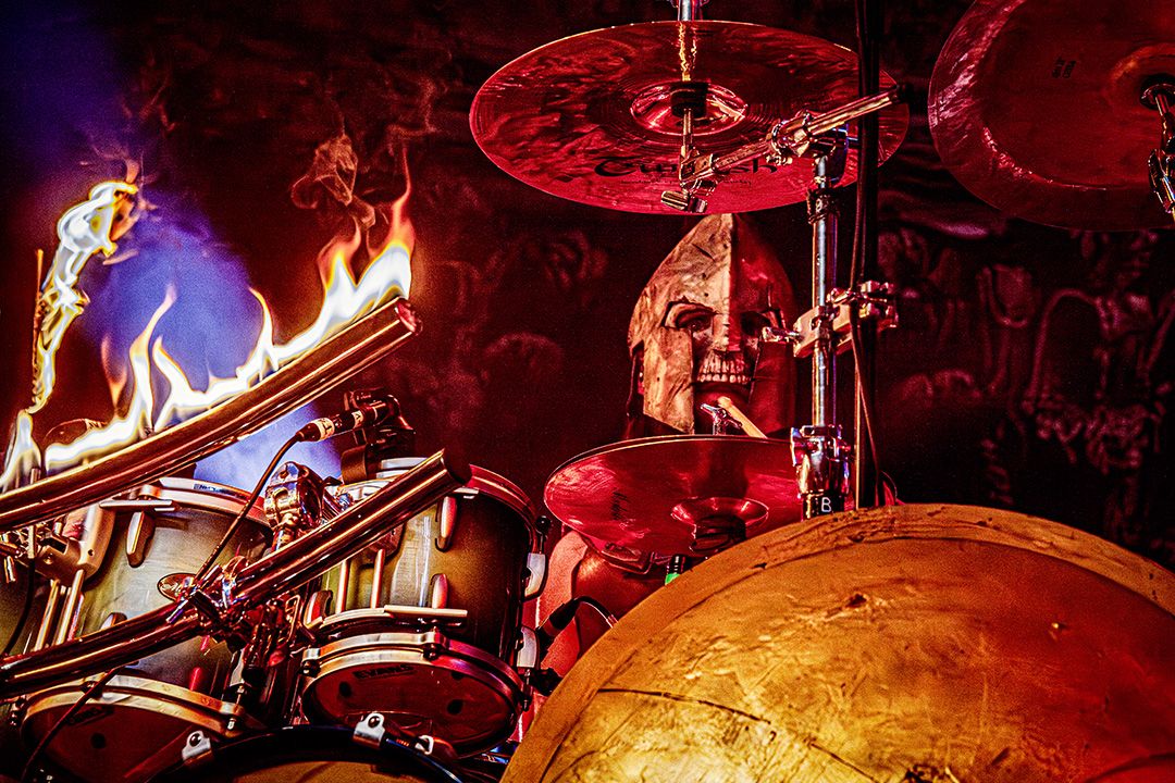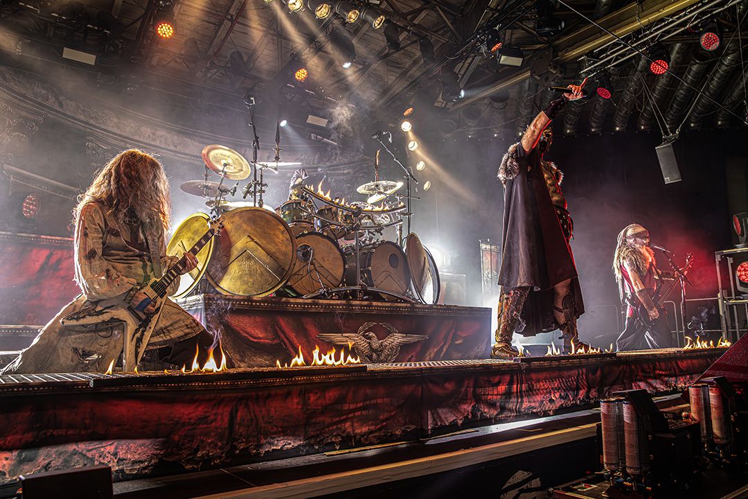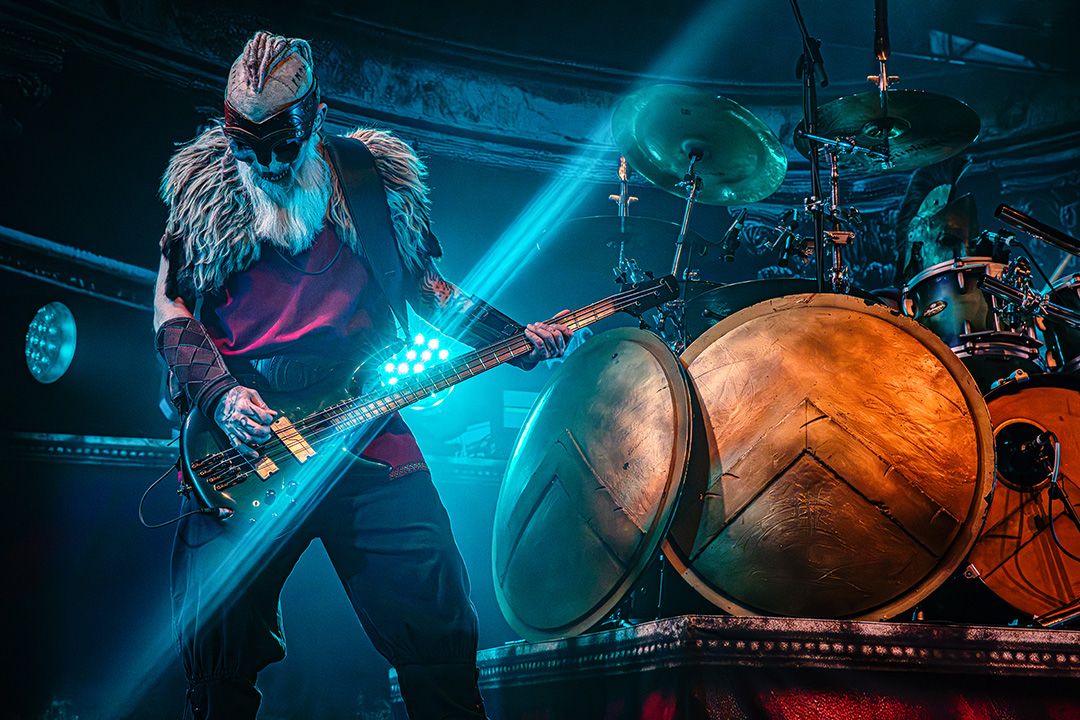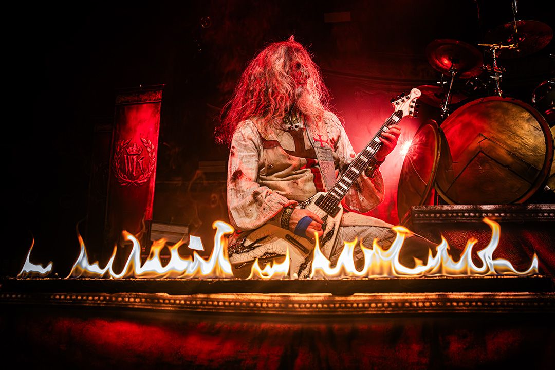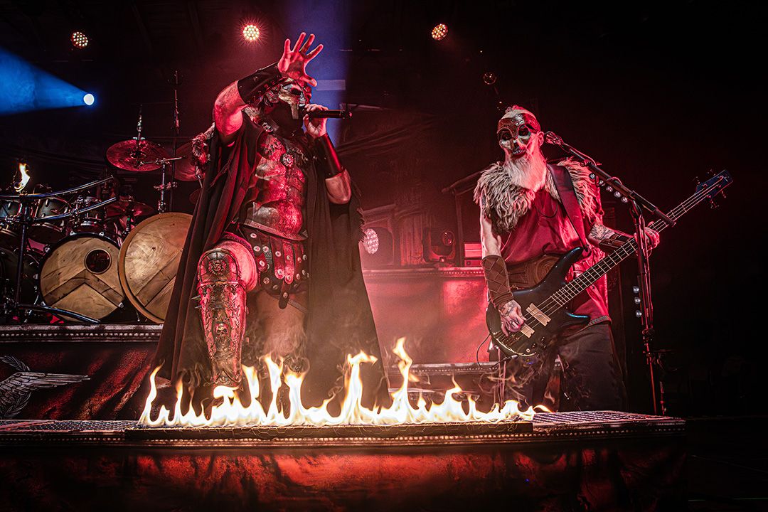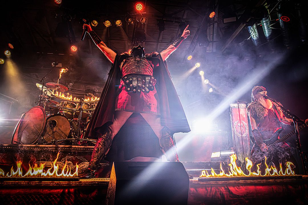 Kaum ist der Applaus abgeklungen, fallen die ersten Schatten auf die Bühne. Kanonen und Fahnen verschwinden. Warkings betreten als Headliner die Bühne und fahren direkt alles auf, was das Power-Metal-Herz höher schlagen lässt. Der Bühnenaufbau wirkt wie ein Schlachtfeld, dominiert von martialischen Symbolen, Masken und einer bedrohlichen Präsenz. Jetzt spürt man, dass Warkings übernehmen mit „Ghengis Khan“ verwandeln sie die Garage direkt in einen brennenden Hexenkessel. Vor allem die Pyro-Elemente von Anfang an setzen starke Akzente. Immer wieder schießen Flammenstöße in die Höhe, perfekt getimt zu Breaks und Refrains. Die Hitze müsste selbst in den hinteren Reihen spürbar sein. All das verleiht der Show eine zusätzliche physische Wucht. Pyro wird hier nicht als Gimmick eingesetzt, sondern als fester Bestandteil der Inszenierung; sogar das Schlagzeug brennt. Auch hier ist die Interaktion mit dem Publikum extrem hoch. The Tribune führt die Garage wie ein Feldherr, animiert permanent, fordert Mitsingen, Klatschen und Schlachtrufe. Dann schickt er eine Frau aus dem Publikum kurzerhand mit einem Reifenschlauch über die Menge nach hinten mit der Bitte ein Getränk zu holen und wenig später kommt sie auf demselben Weg mit Getränk in der Hand wieder zurück nach vorn gesurft. Die Crowd lacht, hilft mit, hebt sie weiter, und selbst von der Bühne aus wird das Spektakel grinsend registriert. Ein Moment, der perfekt zeigt, wie ausgelassen, respektvoll und gut gelaunt die Stimmung an diesem Abend ist.