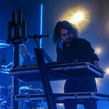 Nach kurzer Umbauphase ist die Bühne in blaues Licht getaucht. Gut zu erkennen sind die beiden Schlagzeuge rechts und links außen, in der Mitte das Keyboard. Das Project Pitchfork Markenzeichen, die Heugabel, darf natürlich in diesem Bild nicht fehlen. Als dann mystischer Nebel den Beginn der Show ankündigt, fängt die Menge, der mittlerweile ziemlich gut gefüllten Halle an, laut zu Klatschen und zu Gröhlen. Als dann endlich die Musiker auf der Bühne erscheinen und mit dem Song Revolution Now starten, beginnt die Reise in eine von Anfang an emotionsgeladene Show. Die Musik mit ihrem einzigartigen Sound aus Elementen von EBM, Gothic und Industrial kombiniert schafft eine wirklich fesselnd düstere Stimmung und es besteht kein Zweifel daran, dass hier eine treue Fangemeinde anwesend ist, die leidenschaftlich und engagiert die tiefgründigen Texte schätzt und die atmosphärische Musik liebt. Es wird zwischenzeitlich immer wieder sogar auch richtig rockig mit Gitarre und allemal ist diese Show mit den beiden fast synchron arbeitenden Schlagzeugern und den kraftvollen Beats zum Tanzen gemacht und treibt nach vorne. Die Halle bebt und das tut sie wirklich. Das Parkett schwingt im Rhythmus und macht fast ein wenig schwindelig. Visuell ist das Ganze ganz sicher auch ein Erlebnis mit abwechslungsreicher Lichtshow und LED-Wand im Hintergrund, auf der Videoclips der Band laufen.