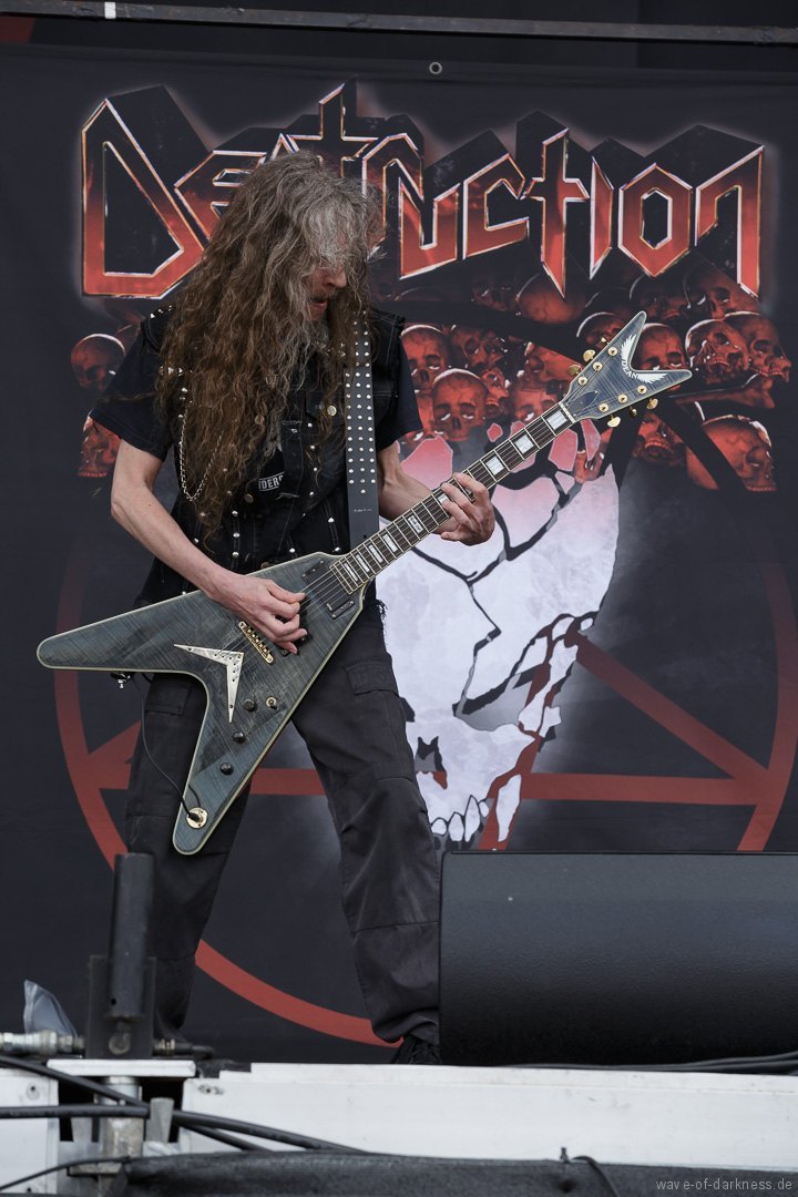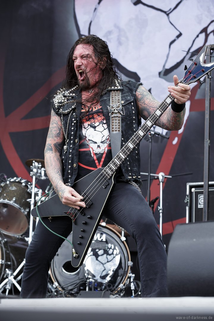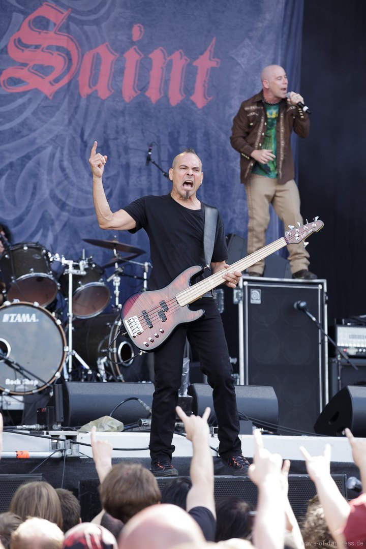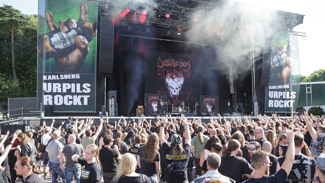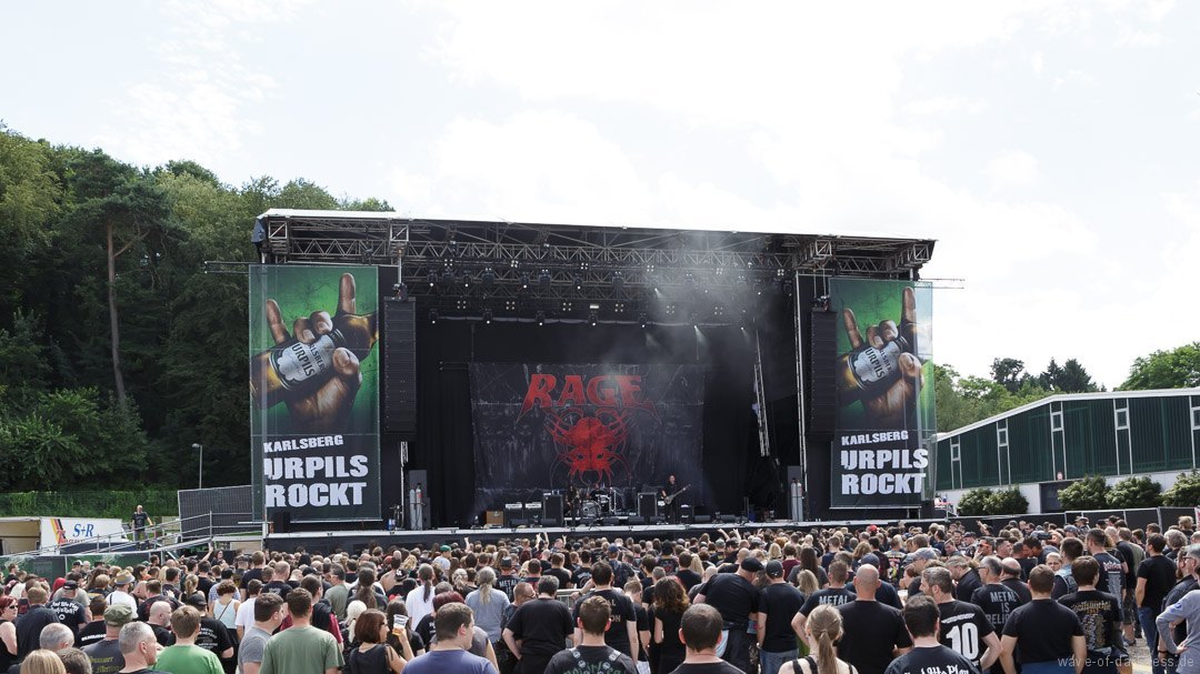 Nachdem sich um 12 Uhr die Tore geöffnete hatten, strömten die ersten Besucher voller Spannung auf das, was sie erwartet, auf das Messegelände. Denn um 13 Uhr sollte das erste Saarmageddon mit Valient Thorr starten. Da jedoch die US-amerikanische Band nicht rechtzeitig antreten konnte, gaben schließlich die schwedischen Hardrocker von Bullet den Startschuss. Im Anschluss folgte mit Rage schon das erst Highlight des Tages. Das nordrhein-westfälische Trio um das einzig verbleibende Gründungsmitglied Peter Wagner sorgte direkt für ordentliche Stimmung vor der hohen Bühne. Leider musste die Power-Metal-Band, die recht früh im Line-Up platziert war und man somit mit einer kurzen Spielzeit rechnen musste, nach etwa 30 Minuten die Bühne verlassen. Sowohl die Band als auch die Fans hätten gerne noch ein paar weitere Lieder zusammen gespielt bzw. gehört, was an dem Tag aufgrund des „sehr eng gesteckten Zeitplans“ (so der Veranstalter) kein Einzelfall blieb. Mit 20 Minuten Verspätung legten Armored Saint los. Aber irgendwie wollte der Funke nicht recht überspringen oder es lag einfach daran, dass Rage die Latte schon ziemlich hoch gelegt hatte. Denn die Metal-Band aus Pasadena lieferte eine Energie geladene Show ab, bei der vor allem der ausdrucksstarke und unermüdlich herumspringende Frontmann John Bush unentwegt das Publikum anzuheizen versuchte. Nach kurzem Umbau folgte nun eine der ältesten bis heute bestehenden deutschen Thrash-Metal-Bands. Obwohl die Sound-Abmischung nicht ganz so kräftig klang, versetzte Destruction nicht nur die große angereiste Fanbase in Bewegung. Jetzt flogen die Haare in den ersten Reihen oder man schwitzte in den Mosh- und Circlepit auf dem steinigen Untergrund.