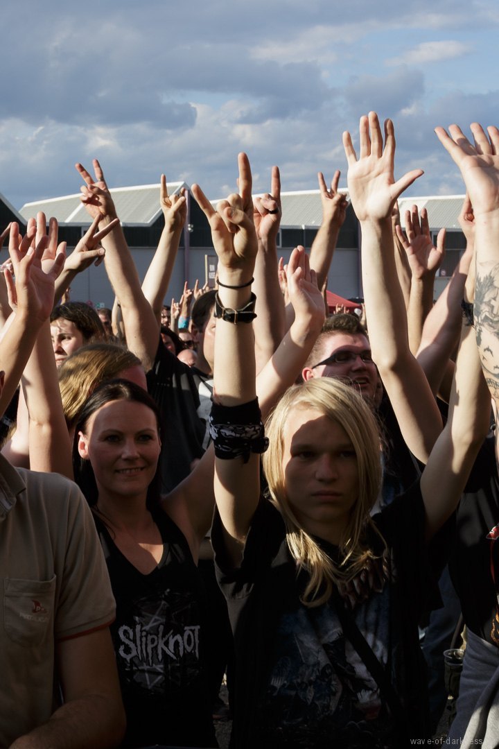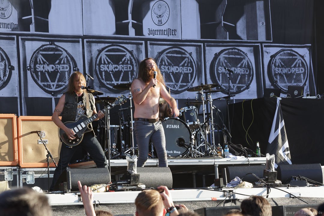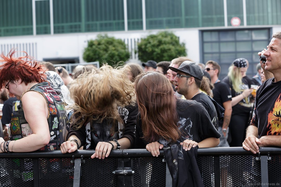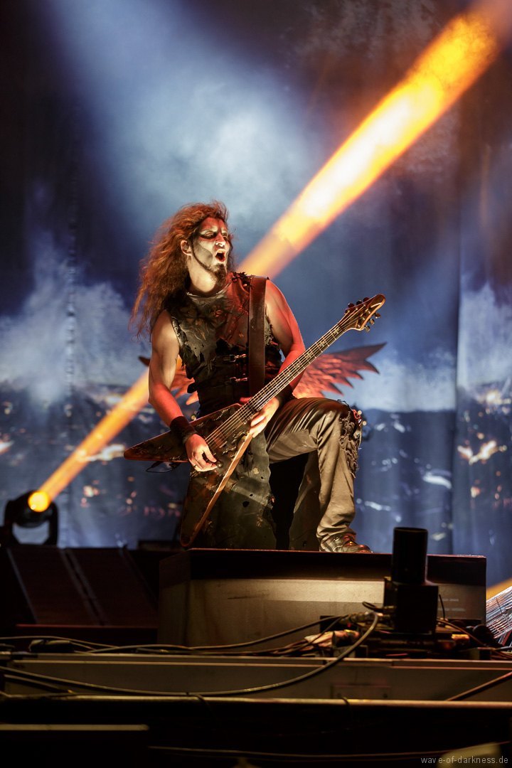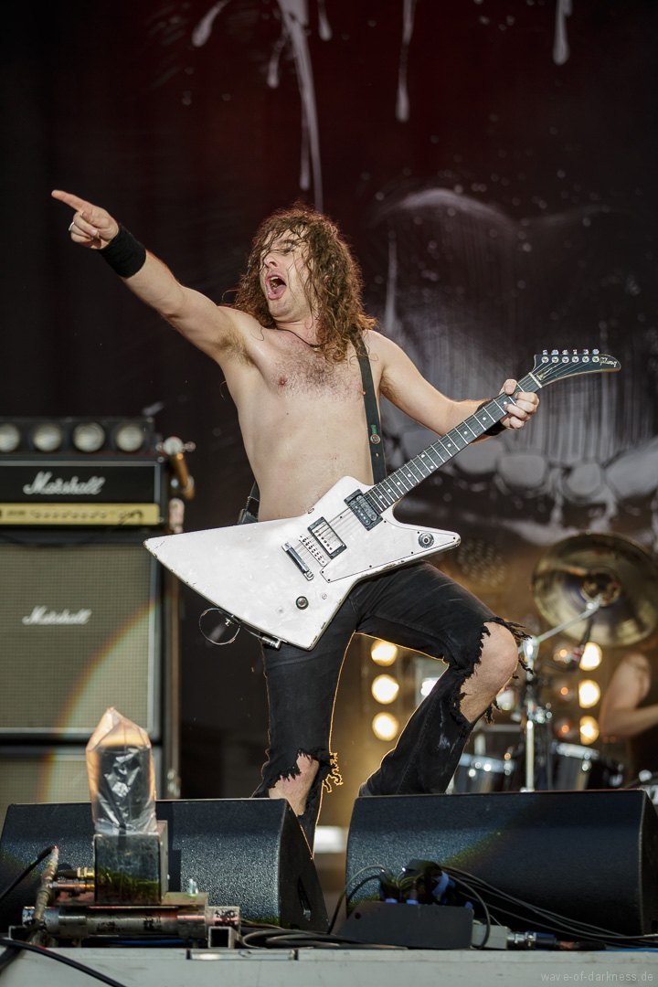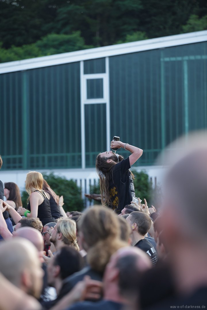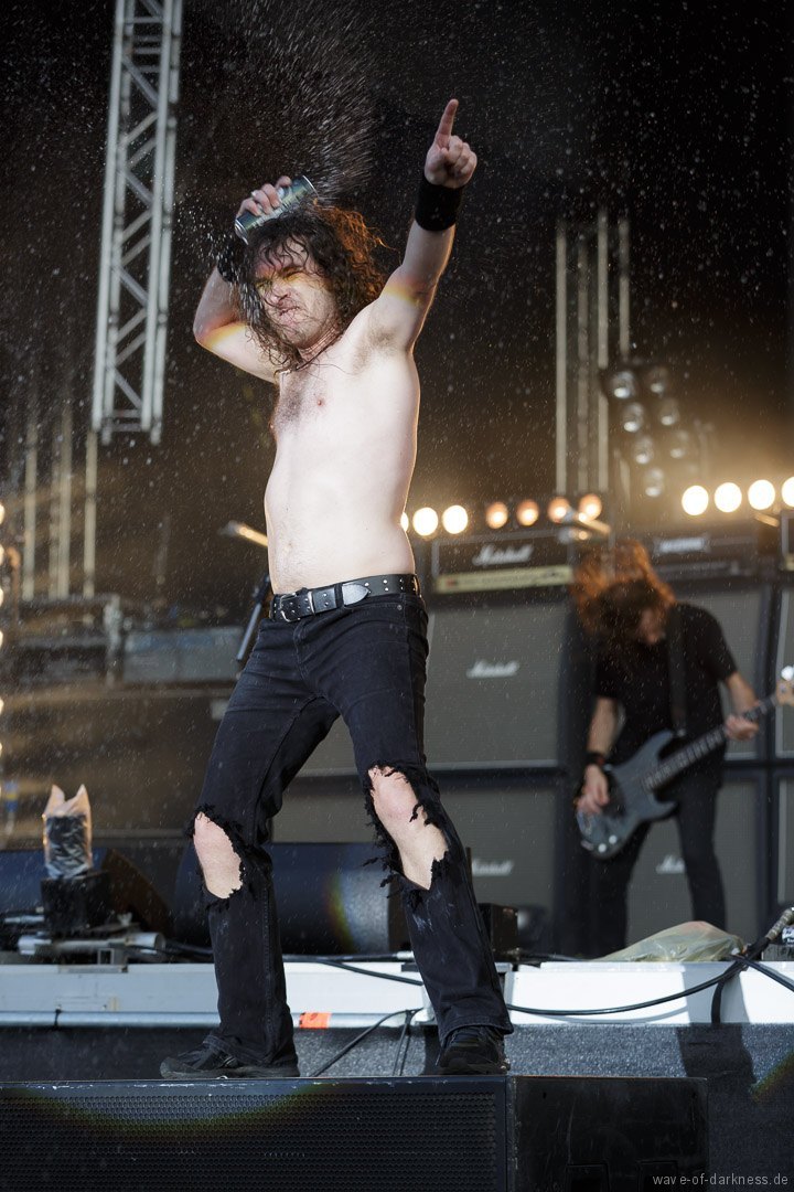 Die Stimmung stieg jedoch wieder schlagartig als Skindred mit ihrer unvergleichlichen Art von Metal auftraten. Den expressiven Engländern gelang es mit harten Riffs gepaart mit Punk-, Reggae- und Hiphop-Elementen die Menschenmasse bei strahlendem Sonnenschein zum Tanzen und Springen zu bringen. Besondere Kollegialität zeigte die Band, indem sie während ihres Gigs für ein paar Lieder Valient Thorr die Bühne überließ, die wohl auch nicht rechtzeitig zu ihrer Spielzeit kamen. Dann gaben Airbourne, die schon seit Jahren auf weltweiten Headliner-Touren und auf Festivals für Begeisterungsstürme sorgen, Vollgas. Mit einer sensationellen Performance aus purem Rocksound überzeugten die vier Jungs aus Australien auf ganzer Linie und das das Publikum feierte sie zu Recht von Anfang bis Ende. Der Sänger und Leadgitarrist Joel O’Keeffe, der mit seinem Bruder Ryan am Schlagzeug die Band 2001 gründete, zelebrierte auf dem Festival geradezu das Image des Rock’n’Roll. Ob es die Bierdose war, die er sich auf dem Kopf zerhämmerte, oder die überschäumende Power, mit der er auf der Bühne und im Publikum agierte, der Auftritt war stets mitreißend. Powerwolf erwiesen sich zu Abschluss als würdiger Headliner. Die saarländische Band hat in den letzten Jahren ihre Fanbase immer weiter ausgebaut und diese zeigte sich deutlich bei dem Heimspiel in Saarbrücken. In einer gewaltigen Bühnenshow mit reichlich Pyro- sowie Lichteffekten begeisterten die Saarländer die knapp 2500 Metalheads auf dem Messegelände durch ihre gewohnt kraftvolle Art von Power-Metal vereint mit spirituellen Musikeinflüssen.