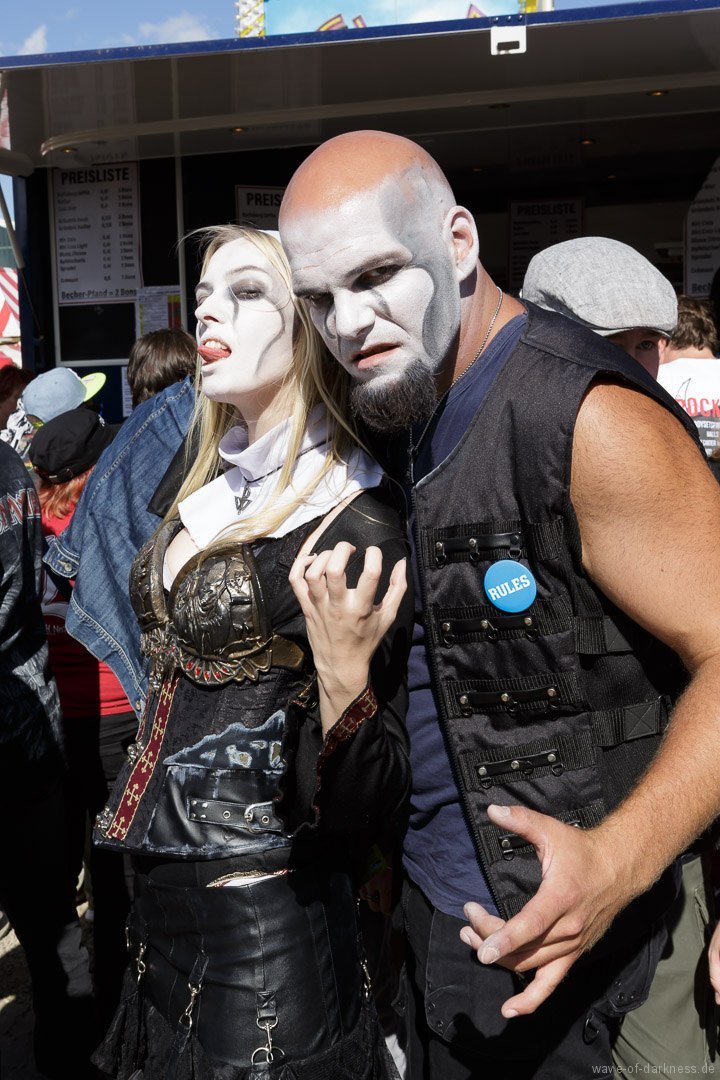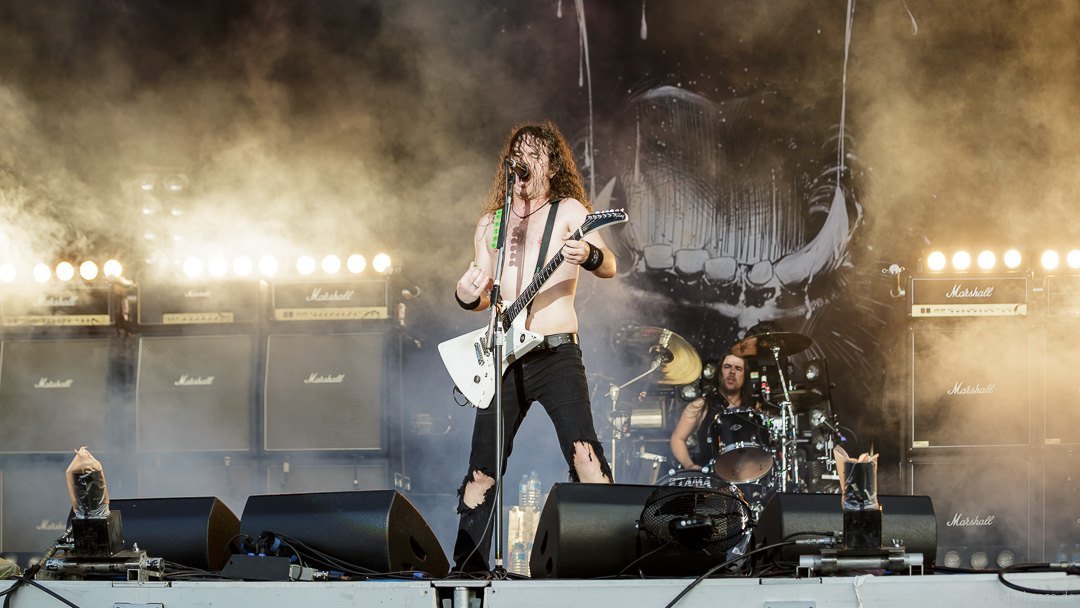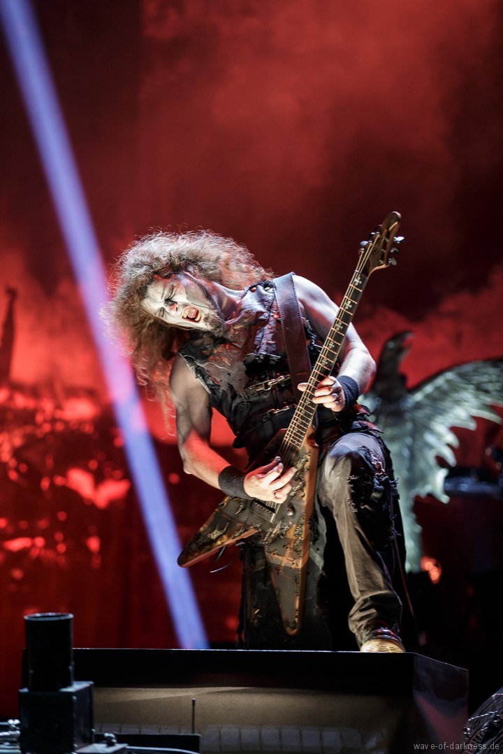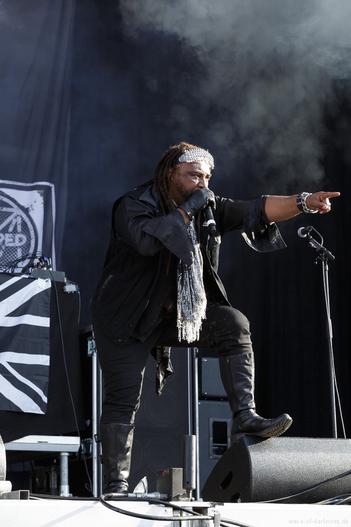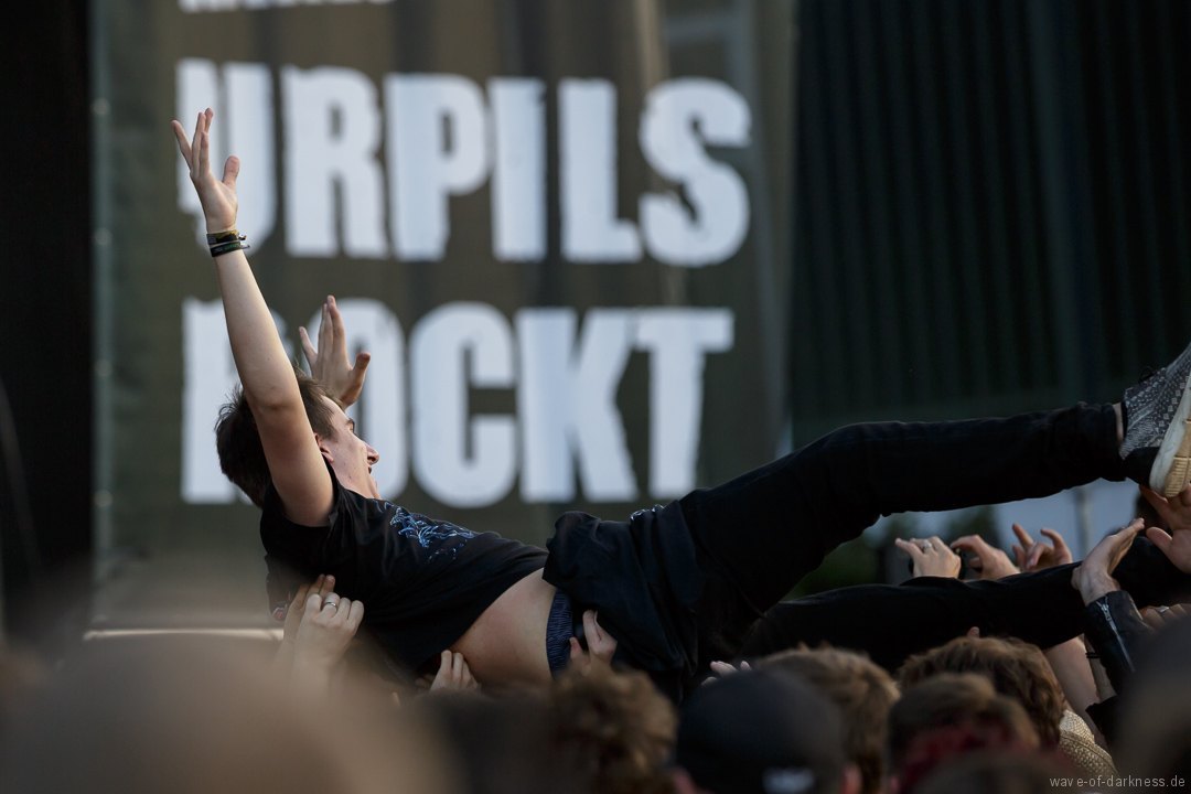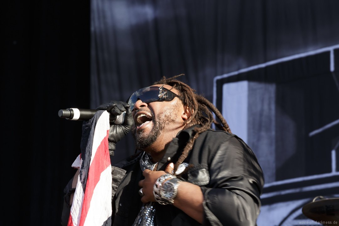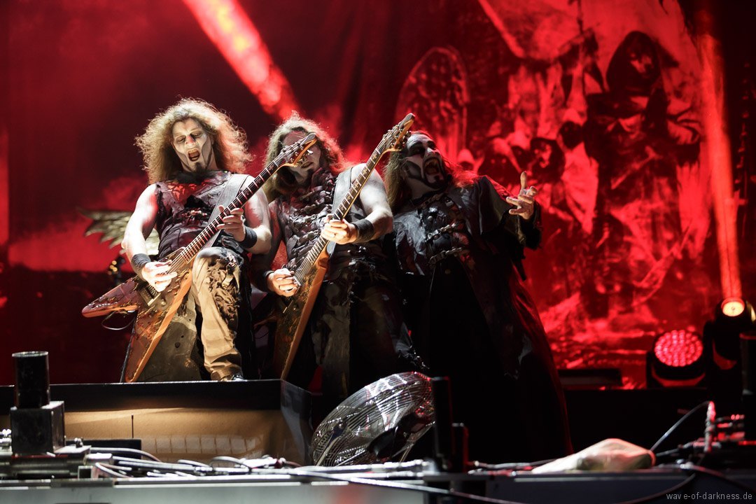 Die Stimmung stieg jedoch wieder schlagartig als Skindred mit ihrer unvergleichlichen Art von Metal auftraten. Den expressiven Engländern gelang es mit harten Riffs gepaart mit Punk-, Reggae- und Hiphop-Elementen die Menschenmasse bei strahlendem Sonnenschein zum Tanzen und Springen zu bringen. Besondere Kollegialität zeigte die Band, indem sie während ihres Gigs für ein paar Lieder Valient Thorr die Bühne überließ, die wohl auch nicht rechtzeitig zu ihrer Spielzeit kamen. Dann gaben Airbourne, die schon seit Jahren auf weltweiten Headliner-Touren und auf Festivals für Begeisterungsstürme sorgen, Vollgas. Mit einer sensationellen Performance aus purem Rocksound überzeugten die vier Jungs aus Australien auf ganzer Linie und das das Publikum feierte sie zu Recht von Anfang bis Ende. Der Sänger und Leadgitarrist Joel O’Keeffe, der mit seinem Bruder Ryan am Schlagzeug die Band 2001 gründete, zelebrierte auf dem Festival geradezu das Image des Rock’n’Roll. Ob es die Bierdose war, die er sich auf dem Kopf zerhämmerte, oder die überschäumende Power, mit der er auf der Bühne und im Publikum agierte, der Auftritt war stets mitreißend. Powerwolf erwiesen sich zu Abschluss als würdiger Headliner. Die saarländische Band hat in den letzten Jahren ihre Fanbase immer weiter ausgebaut und diese zeigte sich deutlich bei dem Heimspiel in Saarbrücken. In einer gewaltigen Bühnenshow mit reichlich Pyro- sowie Lichteffekten begeisterten die Saarländer die knapp 2500 Metalheads auf dem Messegelände durch ihre gewohnt kraftvolle Art von Power-Metal vereint mit spirituellen Musikeinflüssen.