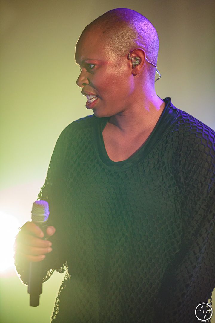 Doch der Headliner wird mit zunehmender Begeisterung erwartet. Schon während des letzten Songs der Opener drängen die Leute gen Bühne, ein bunt gemischtes Völkchen aller Altersklassen, junge, alte, alternative, queere und straighte Leute, auch Vater mit Sohn bzw. Tochter tummeln sich hier in gespannter Erwartung. Die Lichter fahren zur Showtime um 21:15 Uhr herunter. Mit bohrenden Drum-and Bass-Beats brettern die ersten Takte des ungestümen Charlie Big Potato aus den Boxen. Skin erscheint im surrealen Lackjacket mit kastigen Schultereinsätzen, als hätte es Jean Paul Gautier exklusiv für sie designt (hat er vielleicht auch). Sie trägt eine Maske, befremdlich und insektenartig. Vor Scheinwerfern, die wie Waben aussehen, hüpft und schreit ihren Text in das Mikrofon. Alsbald zieht die Powerfrau ihre Maske ab, so als ob sie sich Häuten würde. Mit jedem weiteren Song zeigt sich die eigenwillige Schönheit etwas mehr aus, legt etwas von ihrer Hülle ab.