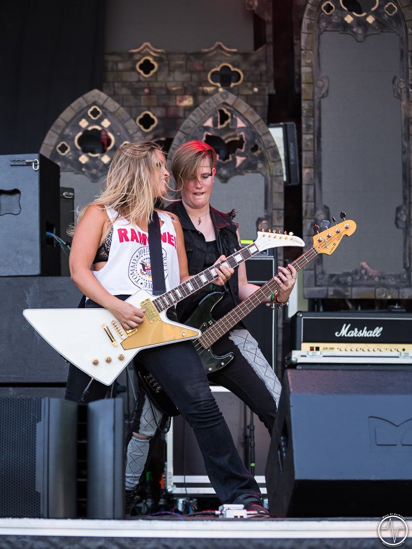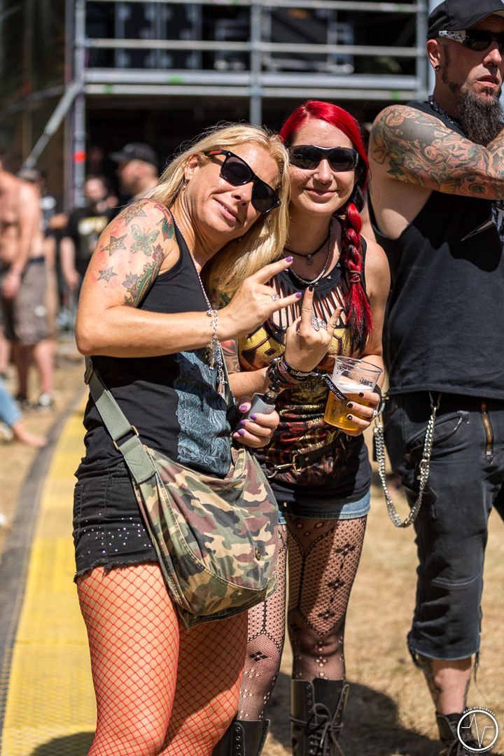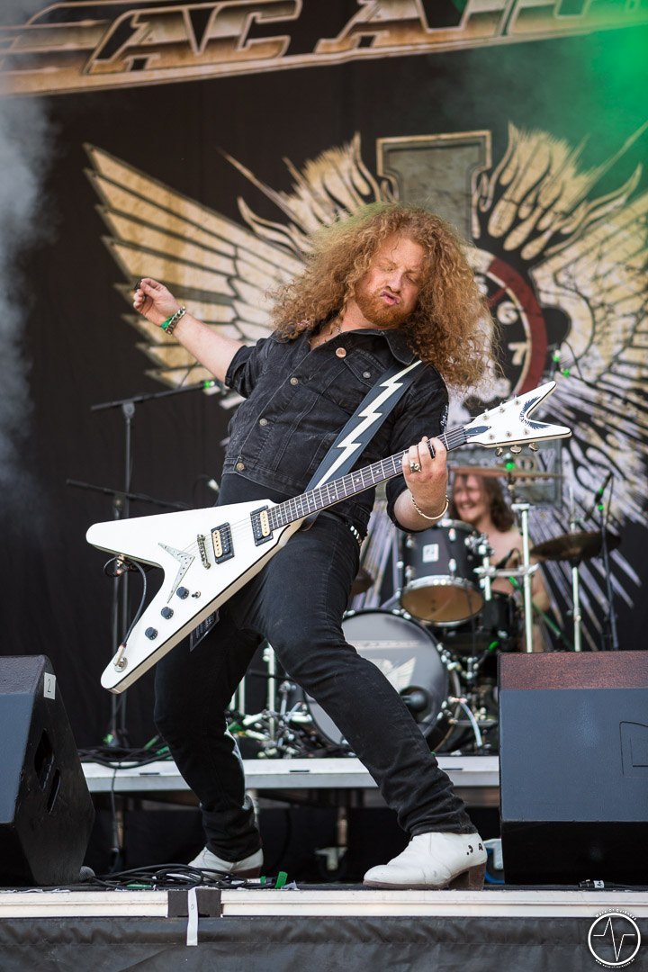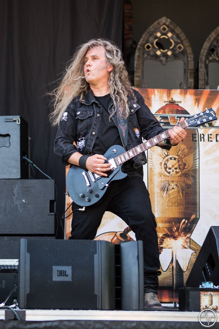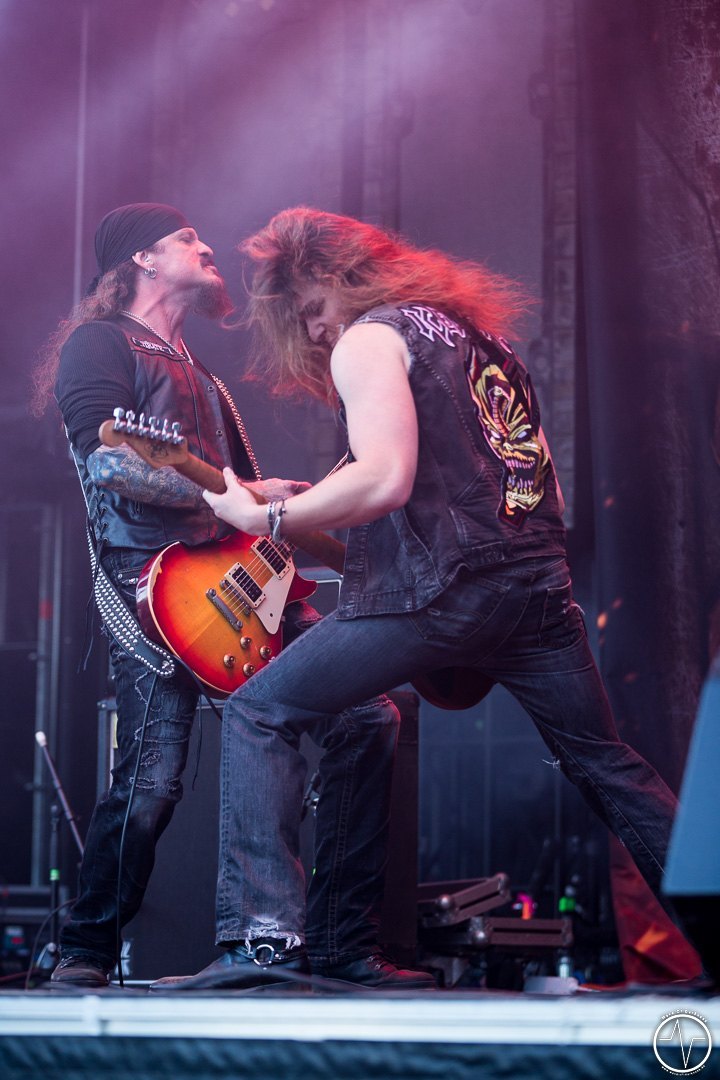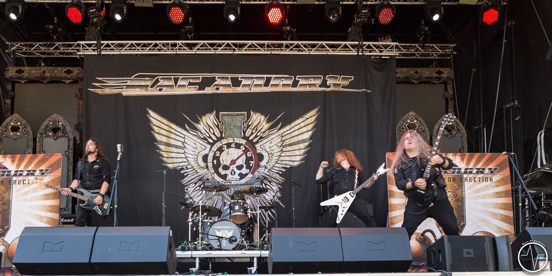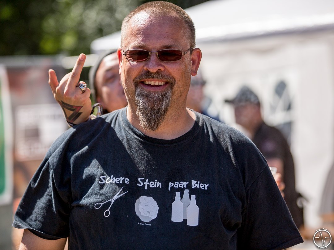 Mit 35 Minuten Verspätung eröffnete AC Angry, die einzige saarländische Band an diesem sonnig-heißen Festivaltag, die zweite Ausgabe des Saarmageddons. Im guten alten Hardrock-Stil machten die vier Jungs ordentlich Druck, was so manchen direkt auf die Beine brachte. So waren mit dem ersten Ton die früh angereisten Festivalbesucher trotz sengender Hitze voll dabei. Heiß ging es auch bei Tundermother weiter. Denn die vier jungen Damen aus Schweden schlossen nahtlos an den Vorgängern an, nämlich mit kräftig-melodischem Hardrock, der mitreißt. Besonders eindrucksvoll war die raue aber kraftvolle Stimme der stets umher wirbelnden und Bier trinkenden Sängerin. Währenddessen spielte die Gitarristin ihr Solo vor der Bühne inmitten der jubelnden Headbangerschar, von wo die Mädels später auch für Bilder und Autogramme bereit standen. Steak Number Eight zeigte sich eher von der psychedelischen Seite. Insbesondere der Sänger präsentierte sich etwas verstörend auf der Bühne, nicht zuletzt als er sich beim Schreien das Mikrofon bis in den Rachen steckte. Ansonsten ging es bei der Band aus Belgien auf der Bühne gut ab, wogegen sich das Publikum nun etwas ruhiger verhielt.