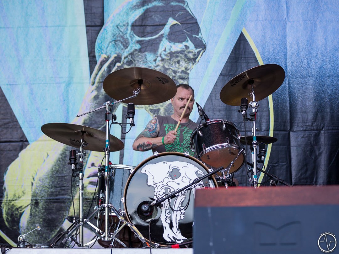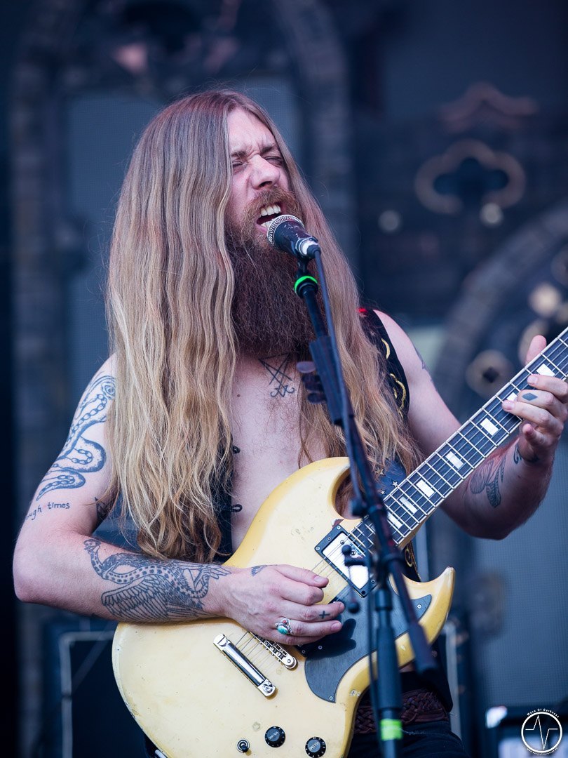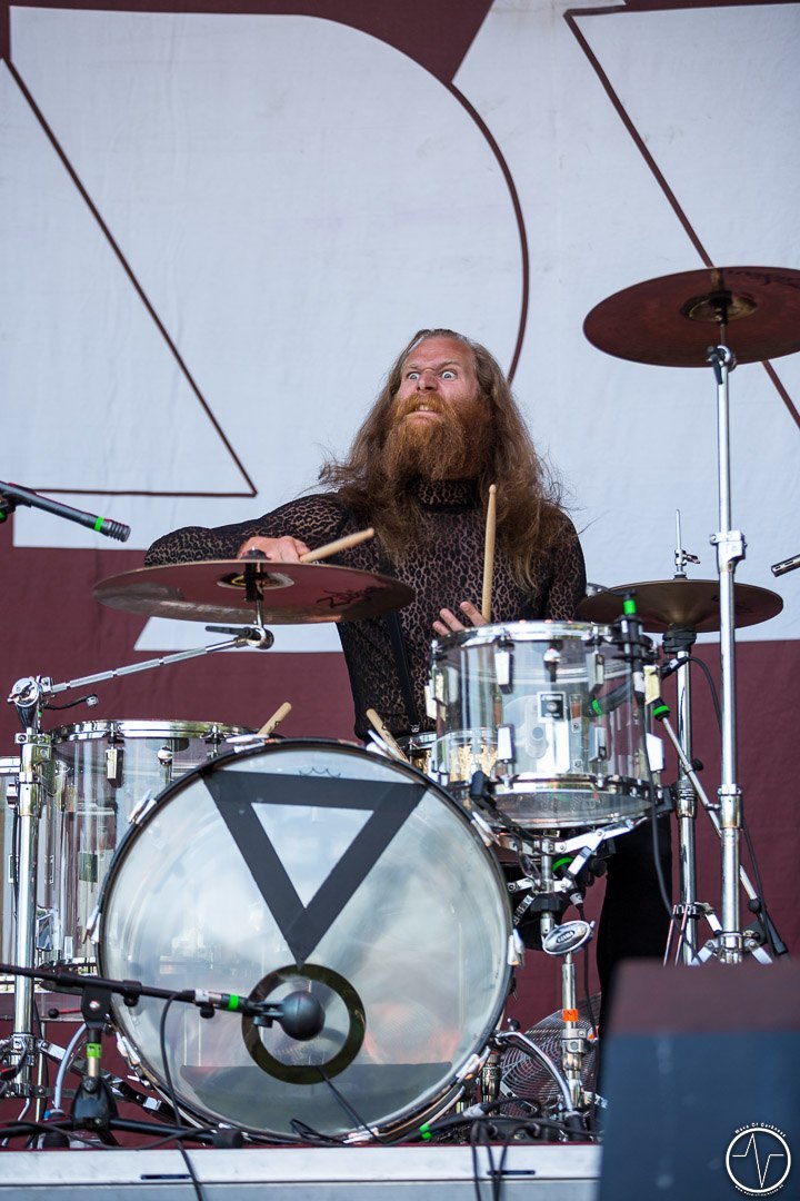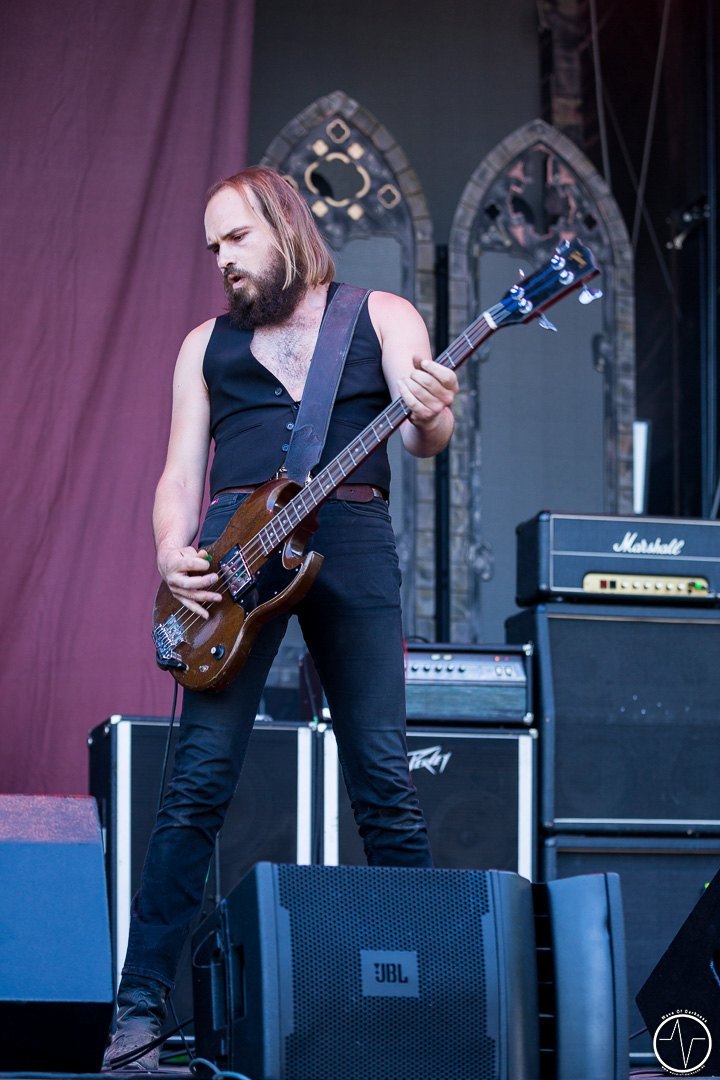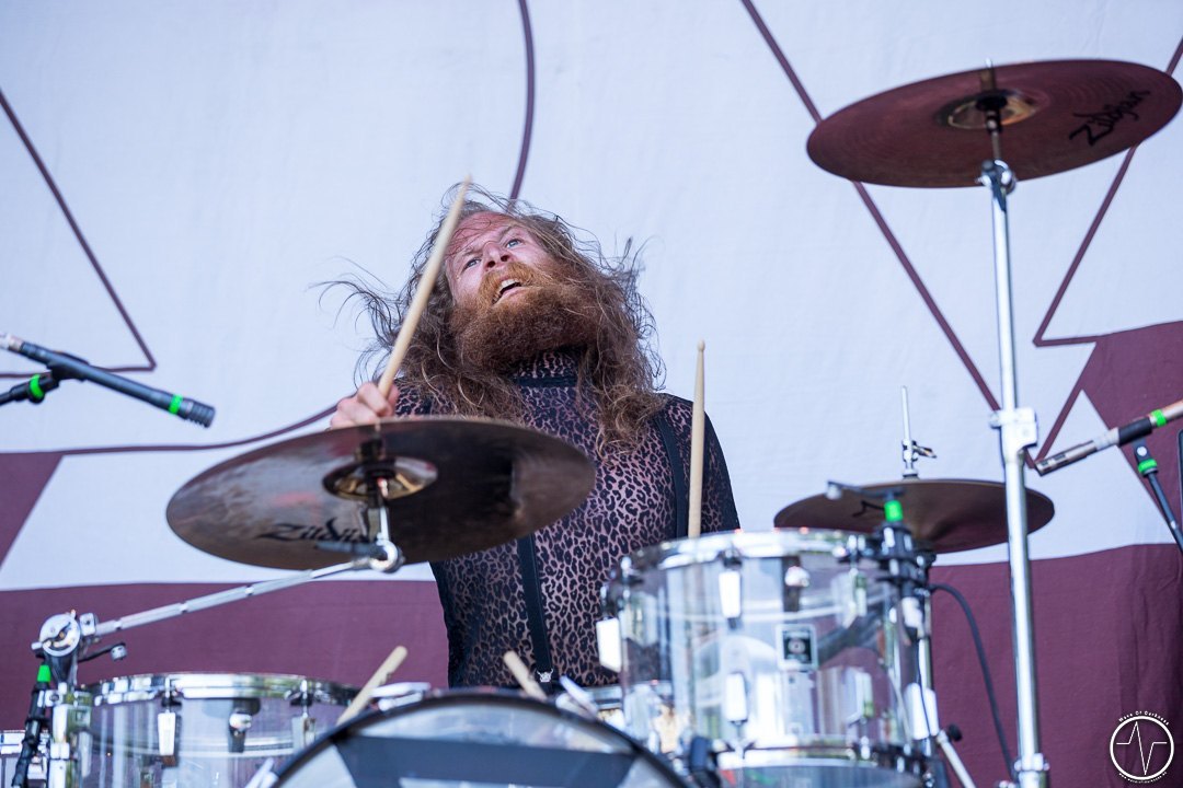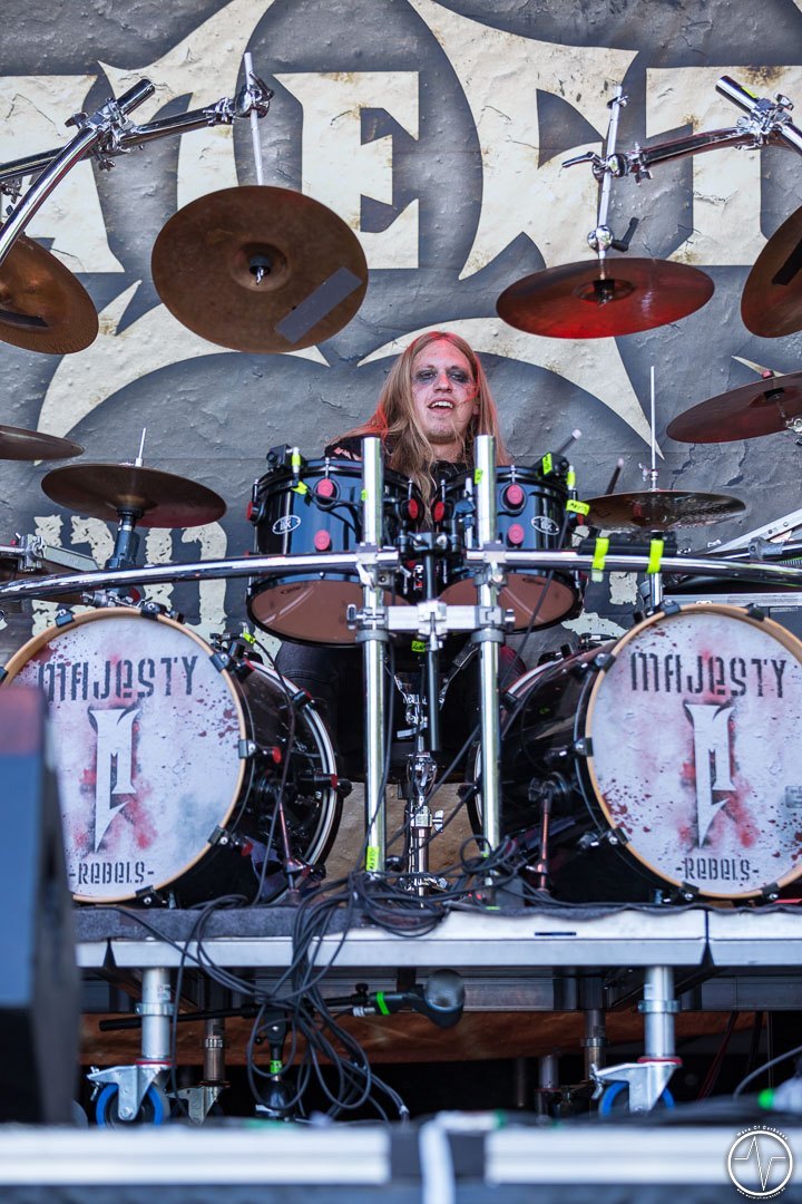 Das änderte sich bei Majesty. Inzwischen trafen immer mehr Leute auf der Festwiese am Schwimmbad ein, um ihre Bands zu sehen und mit Freunden bei lauter Musik zu feiern. Aber auch die Band um Tarek „MS“ Maghary trieb das Stimmungsbarometer in die Höhe. Erfreulich für diejenigen, die sich beeilt hatten. Denn bis dahin hatte sich das Programm um 60 Minuten nach hinten geschoben, so dass jetzt auch die Neuankömmlinge, die „YOLO Heavy Metal“-Party von Majesty mitfeiern durften. Doch die Laune von so manchem sank danach kurz in den Keller als in der ausgiebigen Umbauphase verkündet wurde, dass Entombed A.D. aus „produktionstechnischen Gründen“ nicht anreisen könnten. Das Gute daran war, dass man nun wieder im Zeitplan war und so Kadavar pünktlich loslegen konnten. Eigentlich zunächst nur mit dem Soundcheck, der jedoch schon die ersten Fans begeisterte. Denn als die drei Berliner wieder Backstage verschwanden, erschallten „Zugabe, Zugabe“-Rufe. Kurz drauf meldete sich die Band mit „Habt ihr noch Bock?“ zum eigentlich Gig zurück. Kadavar überzeugte nicht nur mit ihrem groovigen Rock sondern auch mit authentischer Inszenierung. Es war allein schon sehenswert, wenn der lange, dünne Drummer hinter seinem zu klein wirkenden Schlagzeug saß und wie wild um sich schlagend auf sein Instrument drosch. In immer noch praller Sonne war jetzt wieder gute Laune angesagt.