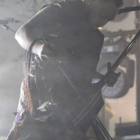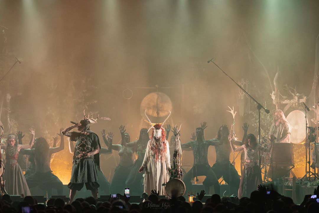 In Hinblick auf den Umfang der Kulisse, die sich gleich bieten würde, ziehe ich auch hier den Hut. 2022 habe ich schon einmal Heilung live gesehen. Damals in der Frankfurter Jahrhunderthalle. Ich wusste also was nun folgen würde. Und ja, der Vorhang fällt und es bietet sich eine liebevoll und bis ins kleinste Detail gestaltete Kulisse. Während Vogelgezwitscher aus den Lautsprechern dringt, schleicht ein Schamane durch die Szene und segnet mit Weihrauch die Instrumente. Ich kann mir das Grinsen nicht verkneifen. Das Konzert ist vorbei, doch das zeremonielle Ritual beginnt.