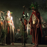 Starke basslastige Rhythmen von mehreren Trommlern, die hohe fein nuancierte Stimme von Maria Franz, Christopher Juul, zwei jungen Background Sängerinnen und das gutturale, kehlkopflastige Singen von Kai Uwe Faust generieren eine Musik, die ihres gleichen sucht. Ich für meinen Teil wüsste keine Band, die ähnliches abliefert. Hier wird der Zuhörer fast hypnotisch dazu gezwungen in den Rhythmus einzusteigen und mitzutanzen. Das allein reicht Heilung aber nicht. Wie in einem liebevoll choreografierten Theaterstück aus Tänzern, Kriegern und Schamanen wird eine Stimmung geschaffen, die jeden in seinen Bann zieht. Details, wohin das Auge blickt. Mit Licht und Nebel werden fast spielerisch ganze Szenen modelliert.