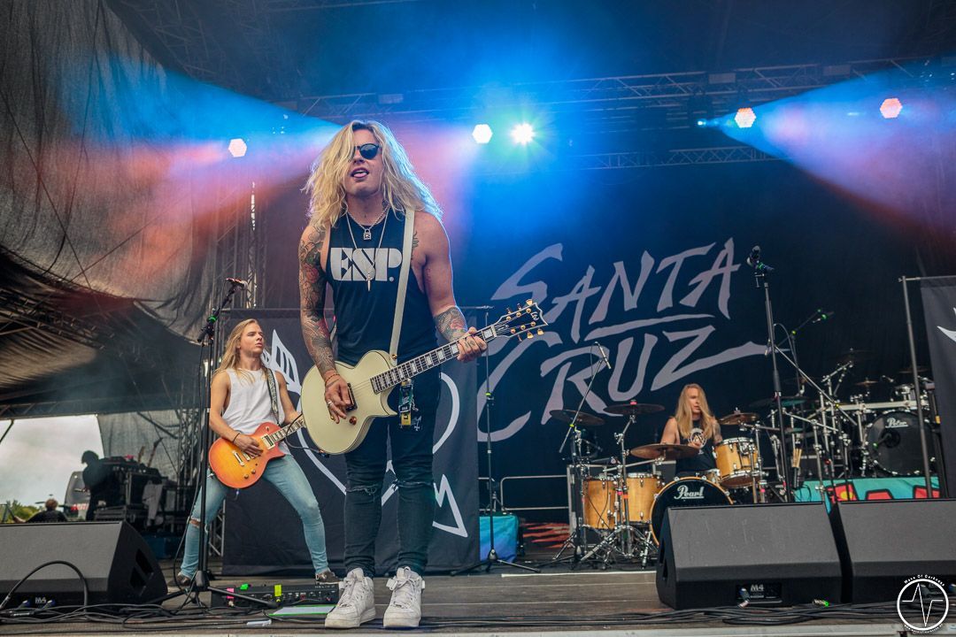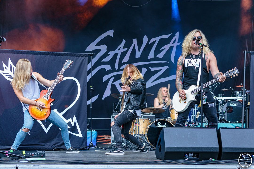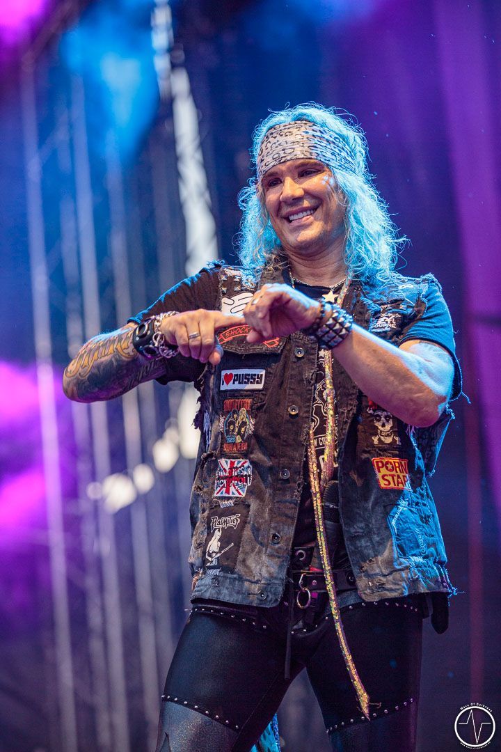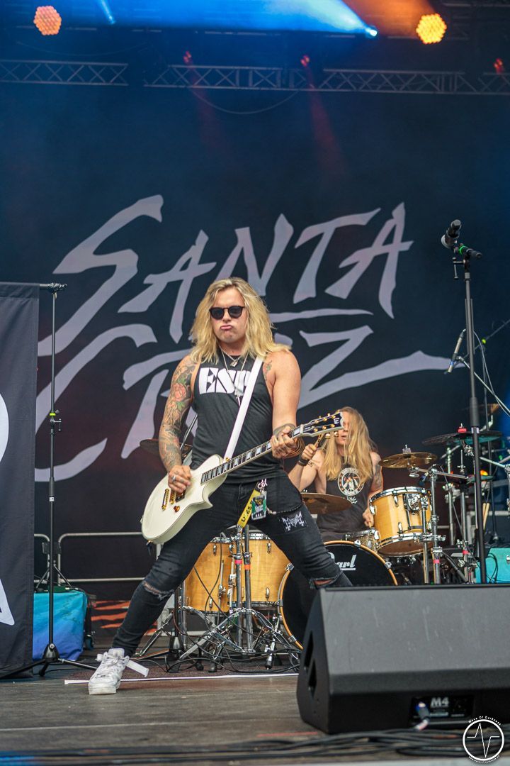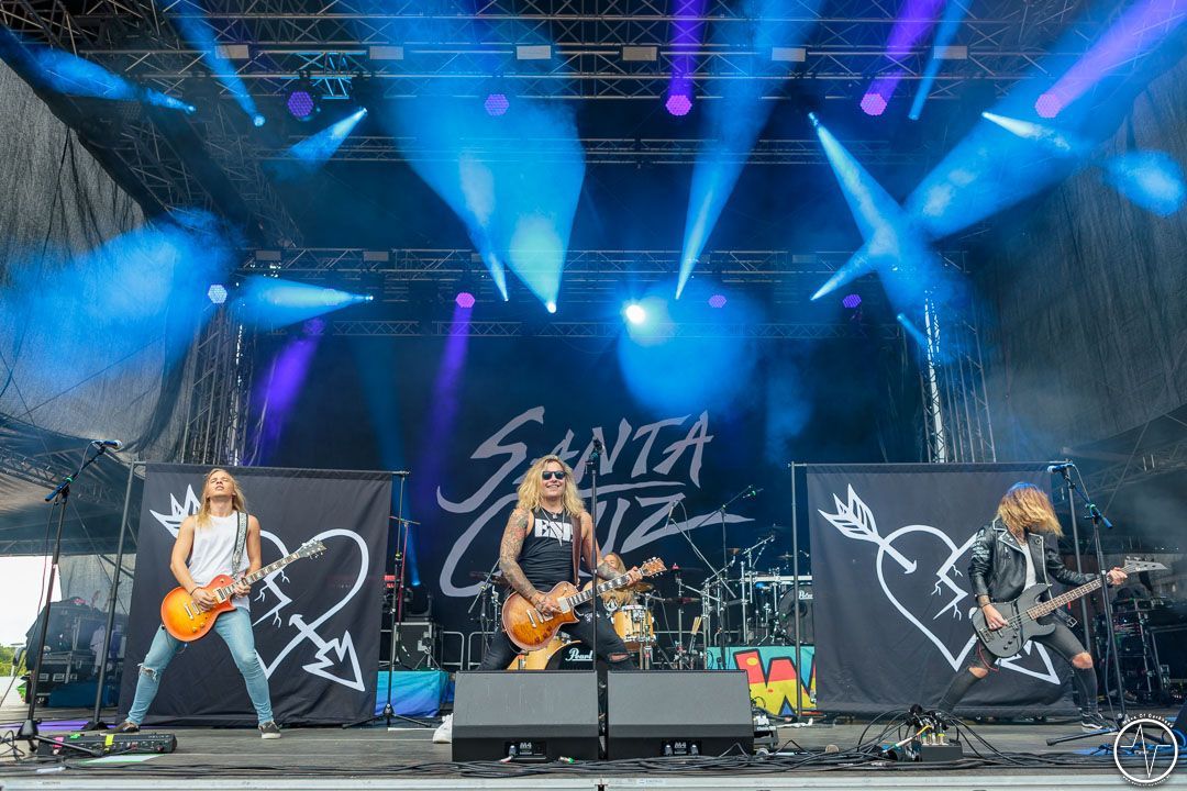 Zunächst startet aber die Sleaze Metal-Band Santa Cruz in den schwül-warmen Donnerstagabend. Die vier Finnen, die namensgerecht direkt aus LA kommen könnten, entern die Bühne vor der Congresshalle, um das noch übersichtliche Publikum mächtig aufheizen. Hoch recken sich bald schon die ersten Teufelshörner in den bedeckten Himmel. Druckvoll und voller Energie eifern die jungen Skandinavier ihren Idolen nach und strafen das Klischee lügen, dass Finnland nur düstere Blackmetal Bands hervorbringt. Dynamische Gitarrenwechsel, schreiende Riffs und blondierte Locken liefern einen Vorgeschmack auf die Hauptband, deren Fans bereits die ersten Reihen belagern. Derweil tummeln sich auf dem Vorplatz weitere illustre Gestalten im Outfit der schillernden 80er Jahre, die geschmückt mit Bandanas sowie Metal-Kutten im Takt mit den Köpfen Wippen.