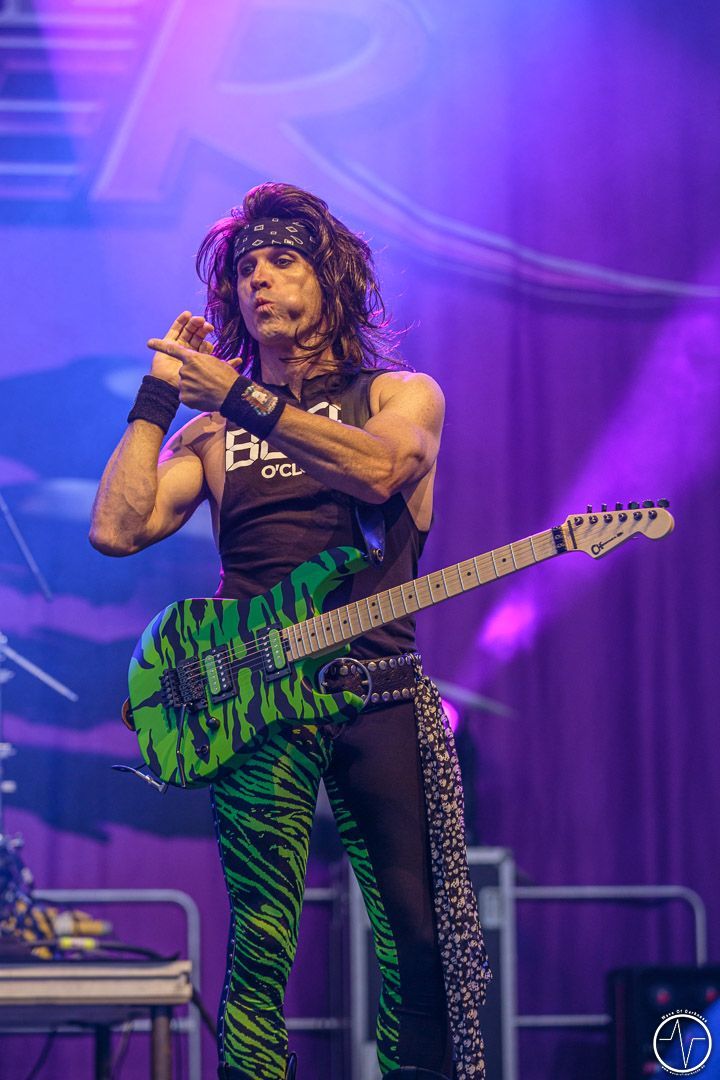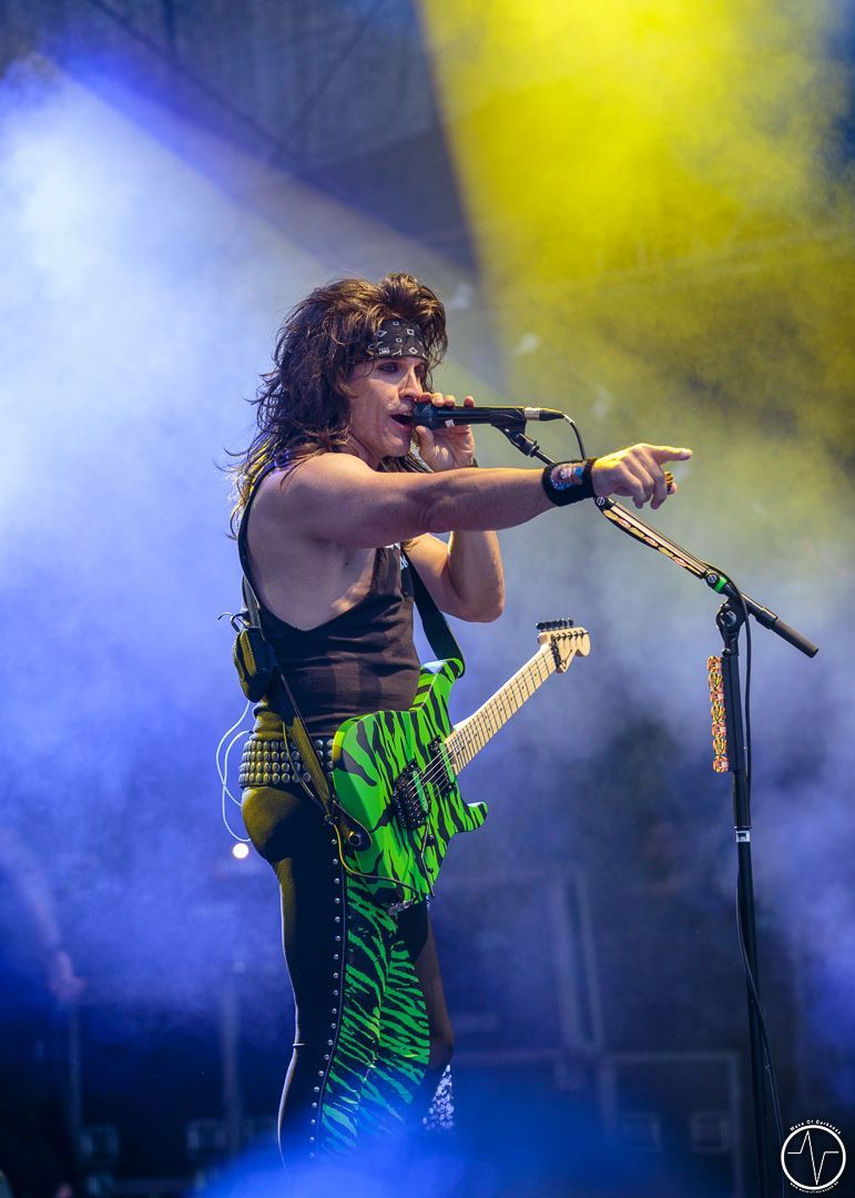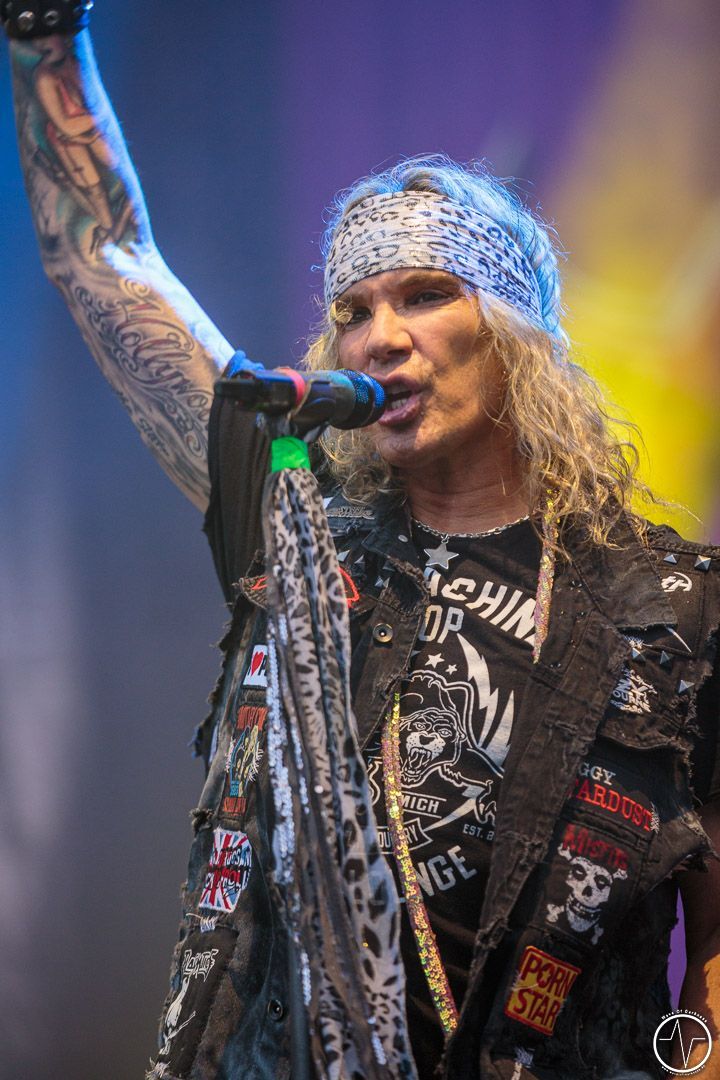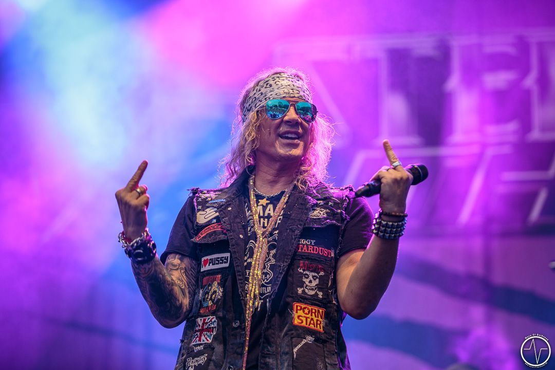 Zunächst startet aber die Sleaze Metal-Band Santa Cruz in den schwül-warmen Donnerstagabend. Die vier Finnen, die namensgerecht direkt aus LA kommen könnten, entern die Bühne vor der Congresshalle, um das noch übersichtliche Publikum mächtig aufheizen. Hoch recken sich bald schon die ersten Teufelshörner in den bedeckten Himmel. Druckvoll und voller Energie eifern die jungen Skandinavier ihren Idolen nach und strafen das Klischee lügen, dass Finnland nur düstere Blackmetal Bands hervorbringt. Dynamische Gitarrenwechsel, schreiende Riffs und blondierte Locken liefern einen Vorgeschmack auf die Hauptband, deren Fans bereits die ersten Reihen belagern. Derweil tummeln sich auf dem Vorplatz weitere illustre Gestalten im Outfit der schillernden 80er Jahre, die geschmückt mit Bandanas sowie Metal-Kutten im Takt mit den Köpfen Wippen.