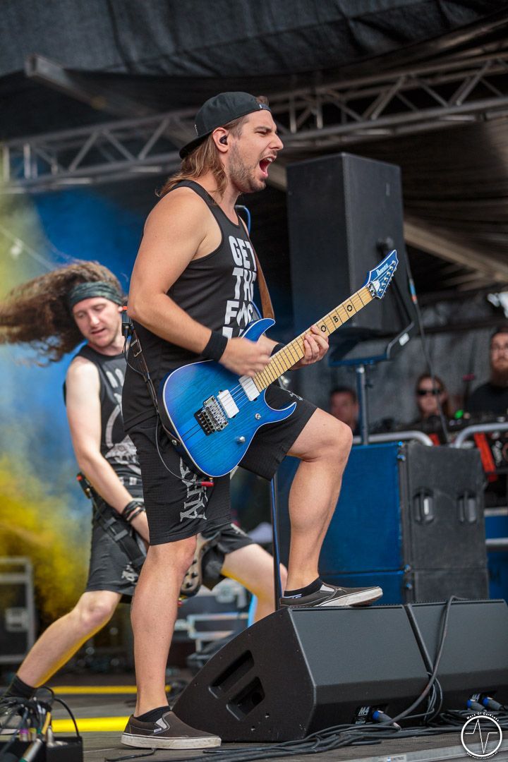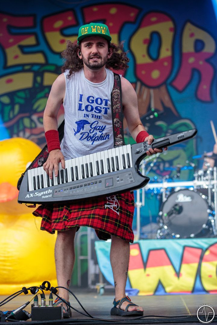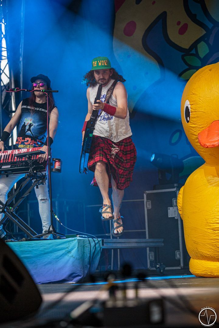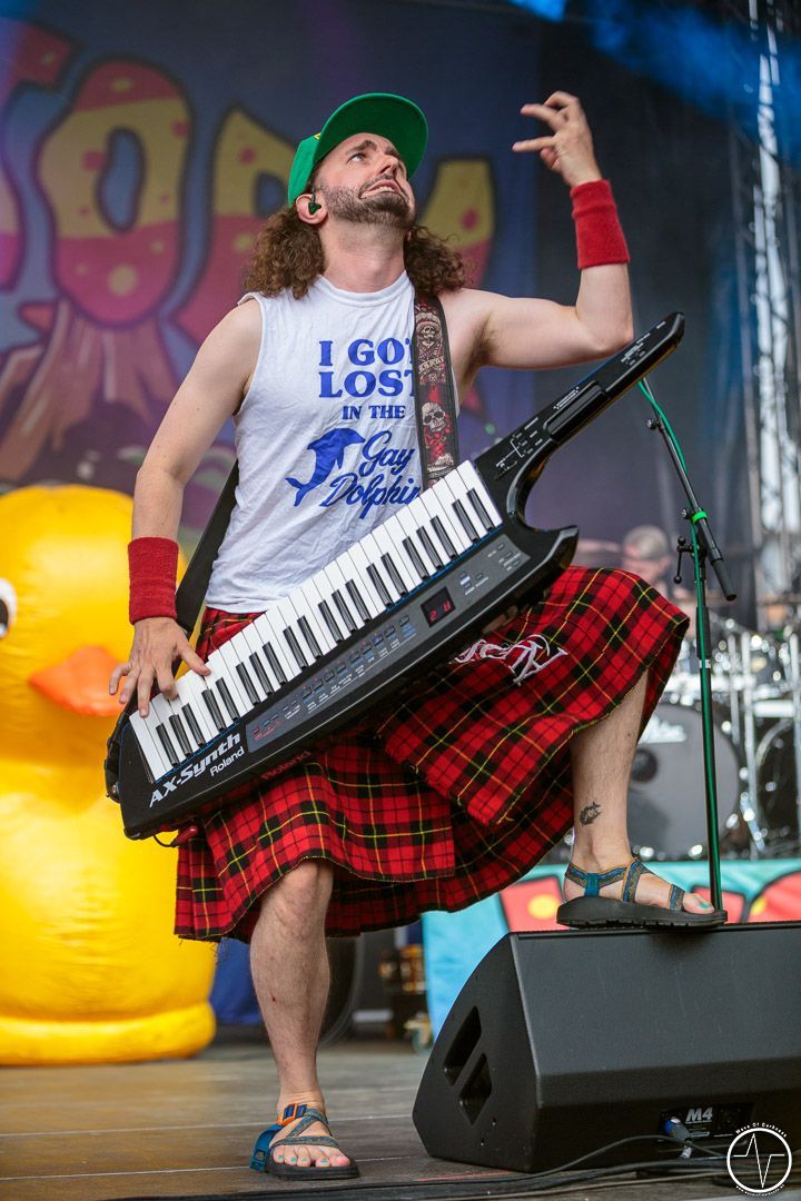 Aber noch etwas kommt in Wallung. Denn zeitgleich ziehen auch schwere Wolken über das Gelände. Doch selbst der anfangs leichte Regen kann die ausgelassene Atmosphäre nicht trüben. Zum Cover von „Hangover“ erscheint ein mit Hai-Kopf maskierter Rapper. Mit ihm öffnet der Himmel aber auch seine Schleusen, so dass die Show wegen des Platzregens um 19:28 Uhr unterbrochen wird. Der Veranstalter bittet die Besucher, im Foyer der Congresshalle trockenen Schutz zu suchen und ihre Bierdruckbetankung kurz zu unterbrechen. Dort angekommen schallte den herbeieilenden Fans ein kollektives „Einst ging ich am Rande der Donau entlang“ entgegen. Um 19:41 Uhr ist der Regen weitergezogen und Alestorm machen mit „Mexico“ dort weiter, wo sie vor wenigen Minuten aufgehört haben. Schließlich ist Zeit für „Captain Morgan‘s Revenge“, die nun wieder etwas freundlichere Wolken mit sich bringt. Die frenetisch gefeierten Hymne „Drink“ läutet den finalen Teil ein und lässt fast alle getreu dem Bandmotto mitsingen sowie tanzen. Als letzter Geniestreich verabschieden die fünf Jungs die aufgeweichte Menge mit einem freundlichen „Fucked with an Anchor“ und machen die Bühne frei für Steel Panther.