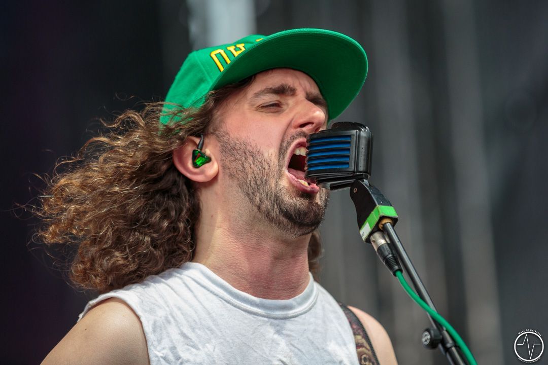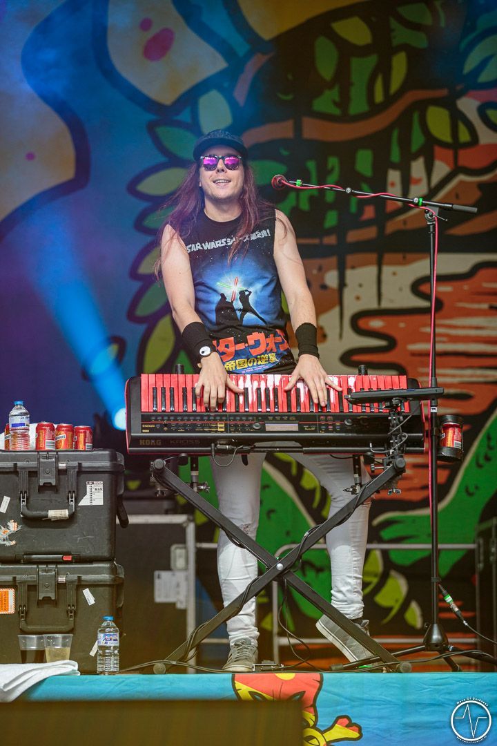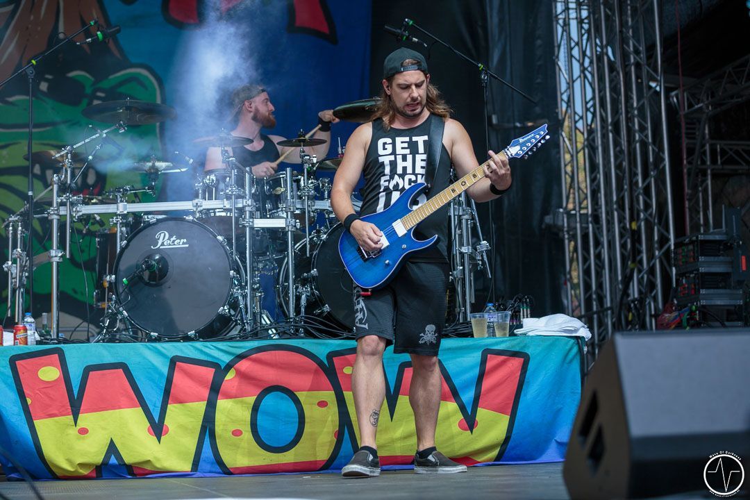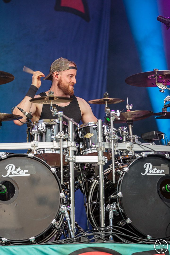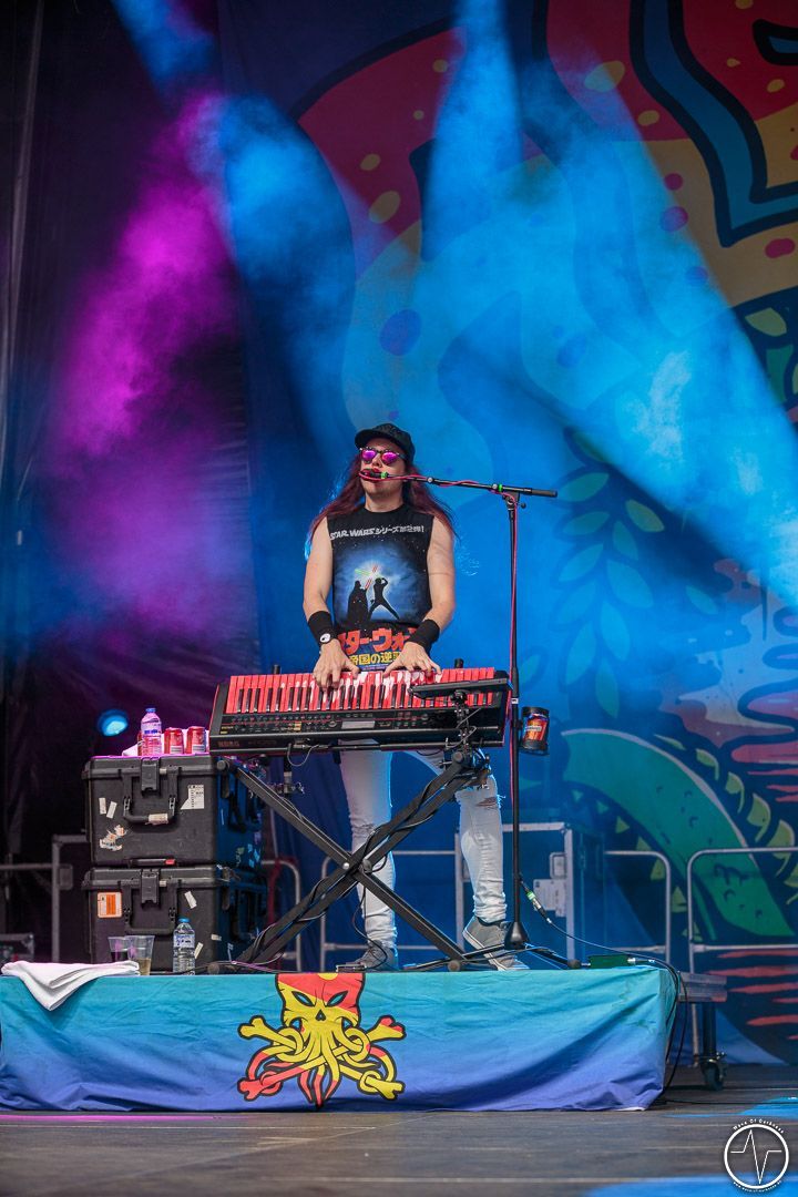 Aber noch etwas kommt in Wallung. Denn zeitgleich ziehen auch schwere Wolken über das Gelände. Doch selbst der anfangs leichte Regen kann die ausgelassene Atmosphäre nicht trüben. Zum Cover von „Hangover“ erscheint ein mit Hai-Kopf maskierter Rapper. Mit ihm öffnet der Himmel aber auch seine Schleusen, so dass die Show wegen des Platzregens um 19:28 Uhr unterbrochen wird. Der Veranstalter bittet die Besucher, im Foyer der Congresshalle trockenen Schutz zu suchen und ihre Bierdruckbetankung kurz zu unterbrechen. Dort angekommen schallte den herbeieilenden Fans ein kollektives „Einst ging ich am Rande der Donau entlang“ entgegen. Um 19:41 Uhr ist der Regen weitergezogen und Alestorm machen mit „Mexico“ dort weiter, wo sie vor wenigen Minuten aufgehört haben. Schließlich ist Zeit für „Captain Morgan‘s Revenge“, die nun wieder etwas freundlichere Wolken mit sich bringt. Die frenetisch gefeierten Hymne „Drink“ läutet den finalen Teil ein und lässt fast alle getreu dem Bandmotto mitsingen sowie tanzen. Als letzter Geniestreich verabschieden die fünf Jungs die aufgeweichte Menge mit einem freundlichen „Fucked with an Anchor“ und machen die Bühne frei für Steel Panther.