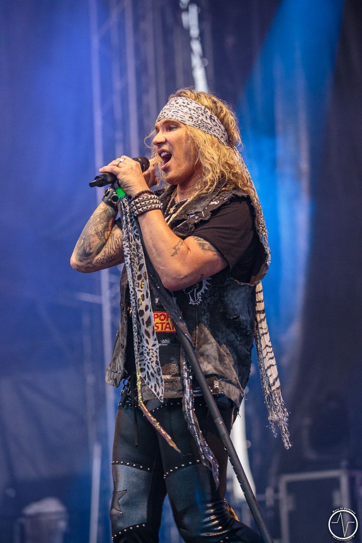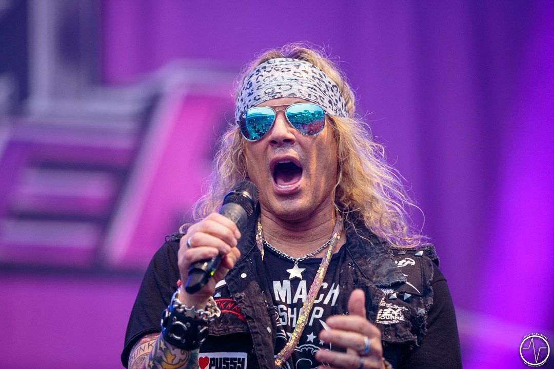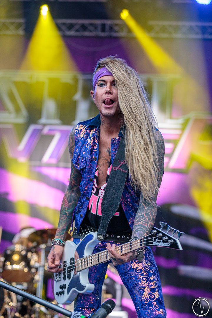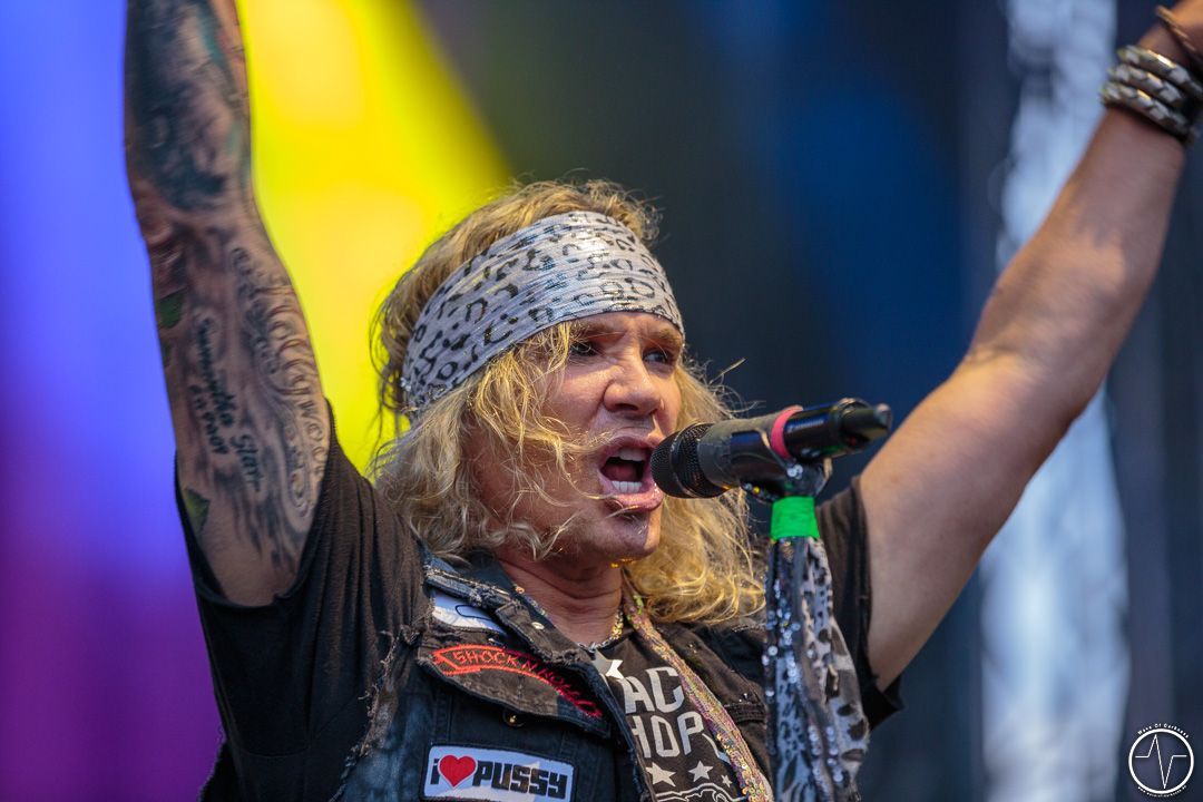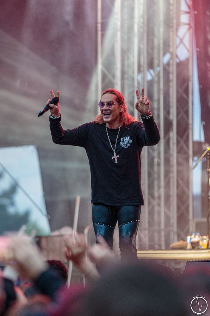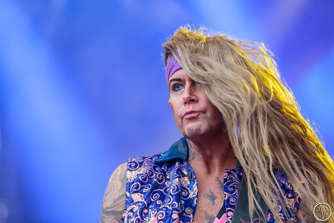 Dann heißt es Showtime für Lexxi Fox, Satchel, Stix Zadinia und Michael Starr. Und wie Stars werden diese empfangen. Mit „Eyes of a Panther“ und „Goin‘ in the Backdoor“ steigen die Kalifornier mit leichter Verspätung in ihr Set ein und holen die Fans gleich in dem Zustand ab, in welchem sie sich trotz Regennässe befinden: high und ready to rock! Die energetische und stets explizit vulgäre Bühnenshow reißt alle mit, auch wenn (oder gerade weil) wir wissen, dass Steel Panther nicht nur „Music“ sondern auch „Girls“ lieben, und dies ausgiebig transportiert wird. Die Deutschkenntnisse der Band sind – zumindest im Wortfeld Sex- und Fäkalsprache – gut ausgeprägt, die Aussprache flüssig und der Einfallsreichtum nahezu grenzenlos. Zahlreiche Intermezzi zum Thema „Wait, ich habe einen Ständer“ oder „Muschilecken“ machen eine Steel Panther Show eben nicht nur zu einem Musik- sondern auch zu einem Comedy-Event. Vor allem Gitarrist Satchel schwadroniert zwischen den Songs über den „kleinen Schwanz unseres Sängers“, suhlt sich in Eigenlob oder macht sich über die männlichen Fans lustig, die ihre bessere Hälfte auf ein Steel Panther Konzert mitnehmen. Sänger Michael Starr mischt kräftig mit und im Laufe des Sets werden noch weitere derbe Scherze platziert, z.B. wird sich über Musikerkollegen wie DEF LEPPARD oder über Ozzy Osborne lustig gemacht, indem Starr zum Cover von Black Sabbaths „Crazy Train“ eine grandiose Ozzy Inkarnation hinlegt.