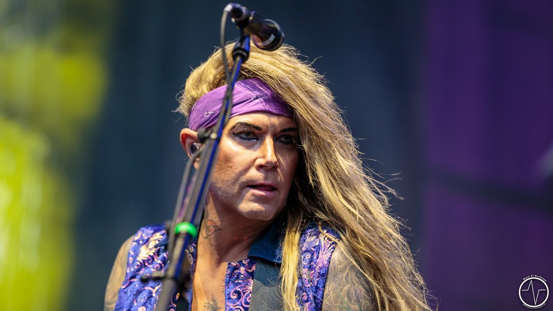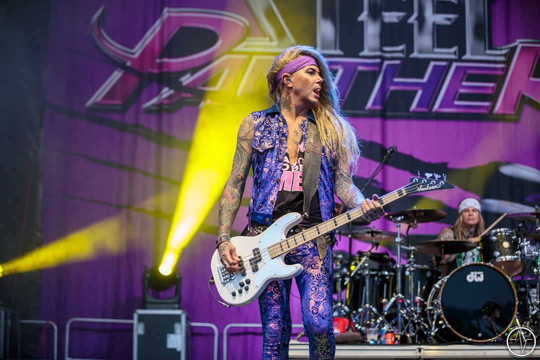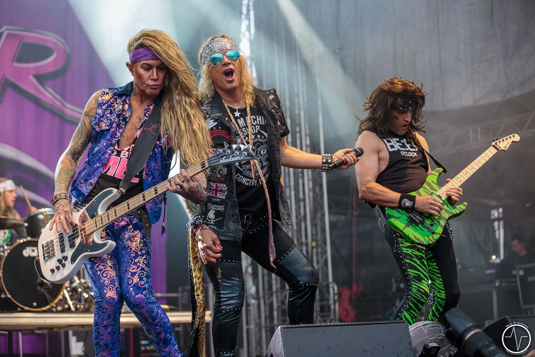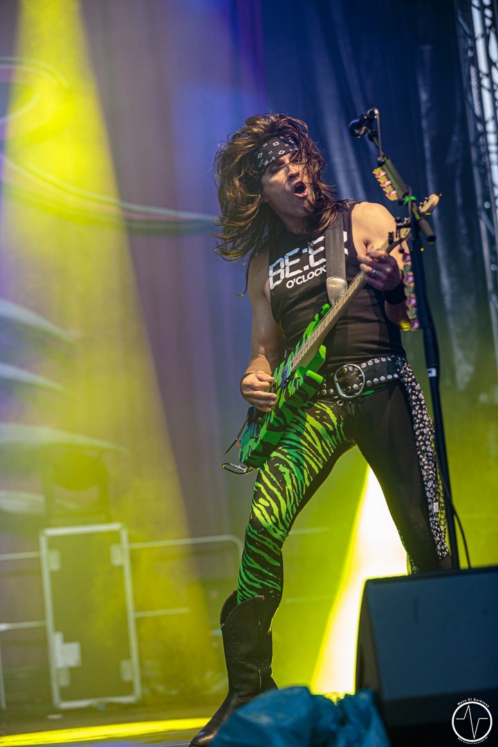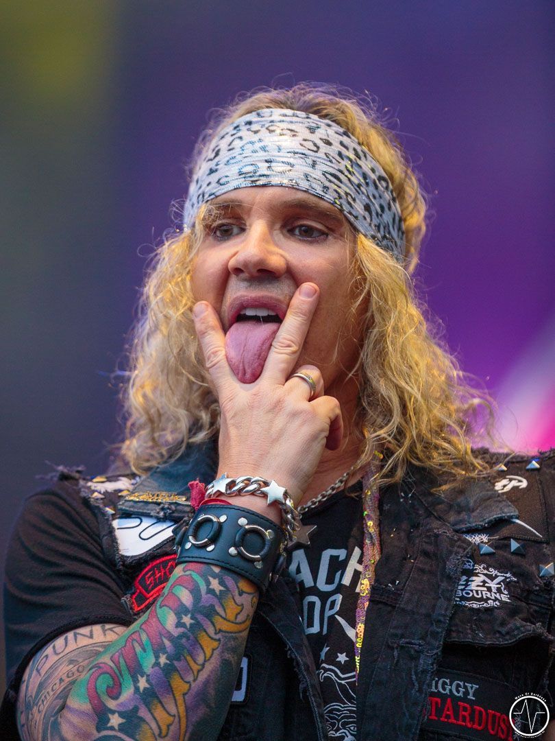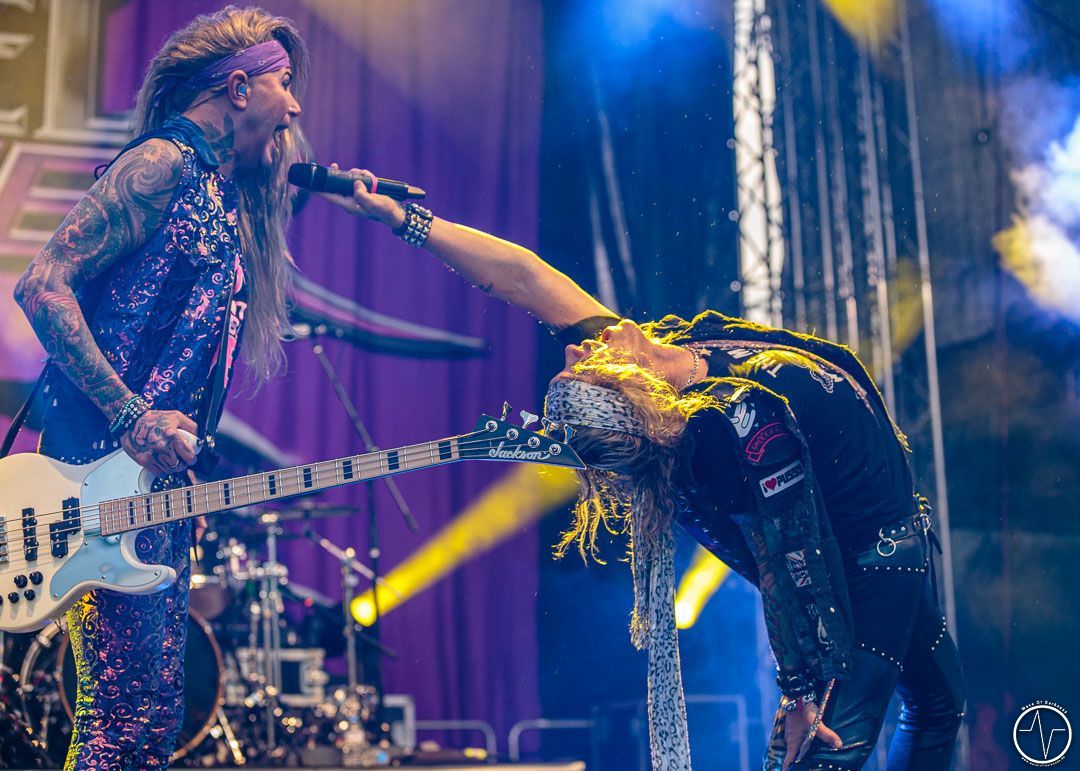 Dann heißt es Showtime für Lexxi Fox, Satchel, Stix Zadinia und Michael Starr. Und wie Stars werden diese empfangen. Mit „Eyes of a Panther“ und „Goin‘ in the Backdoor“ steigen die Kalifornier mit leichter Verspätung in ihr Set ein und holen die Fans gleich in dem Zustand ab, in welchem sie sich trotz Regennässe befinden: high und ready to rock! Die energetische und stets explizit vulgäre Bühnenshow reißt alle mit, auch wenn (oder gerade weil) wir wissen, dass Steel Panther nicht nur „Music“ sondern auch „Girls“ lieben, und dies ausgiebig transportiert wird. Die Deutschkenntnisse der Band sind – zumindest im Wortfeld Sex- und Fäkalsprache – gut ausgeprägt, die Aussprache flüssig und der Einfallsreichtum nahezu grenzenlos. Zahlreiche Intermezzi zum Thema „Wait, ich habe einen Ständer“ oder „Muschilecken“ machen eine Steel Panther Show eben nicht nur zu einem Musik- sondern auch zu einem Comedy-Event. Vor allem Gitarrist Satchel schwadroniert zwischen den Songs über den „kleinen Schwanz unseres Sängers“, suhlt sich in Eigenlob oder macht sich über die männlichen Fans lustig, die ihre bessere Hälfte auf ein Steel Panther Konzert mitnehmen. Sänger Michael Starr mischt kräftig mit und im Laufe des Sets werden noch weitere derbe Scherze platziert, z.B. wird sich über Musikerkollegen wie DEF LEPPARD oder über Ozzy Osborne lustig gemacht, indem Starr zum Cover von Black Sabbaths „Crazy Train“ eine grandiose Ozzy Inkarnation hinlegt.