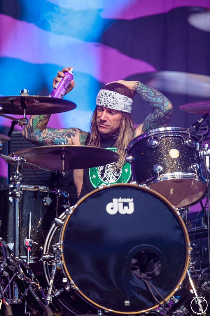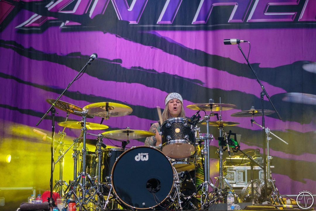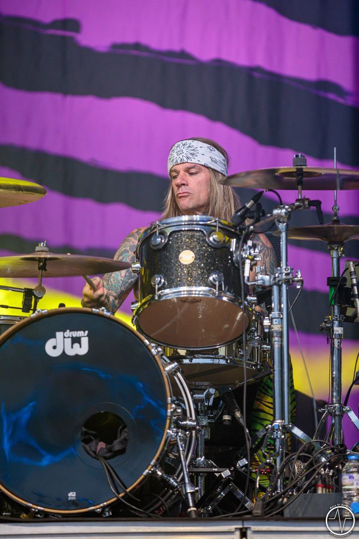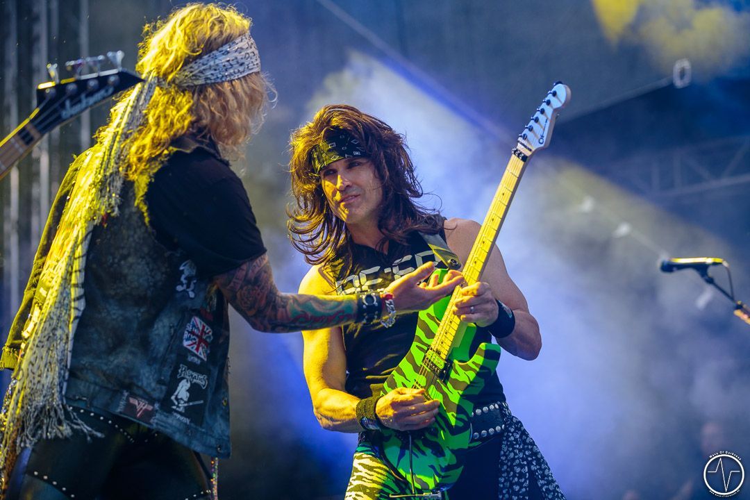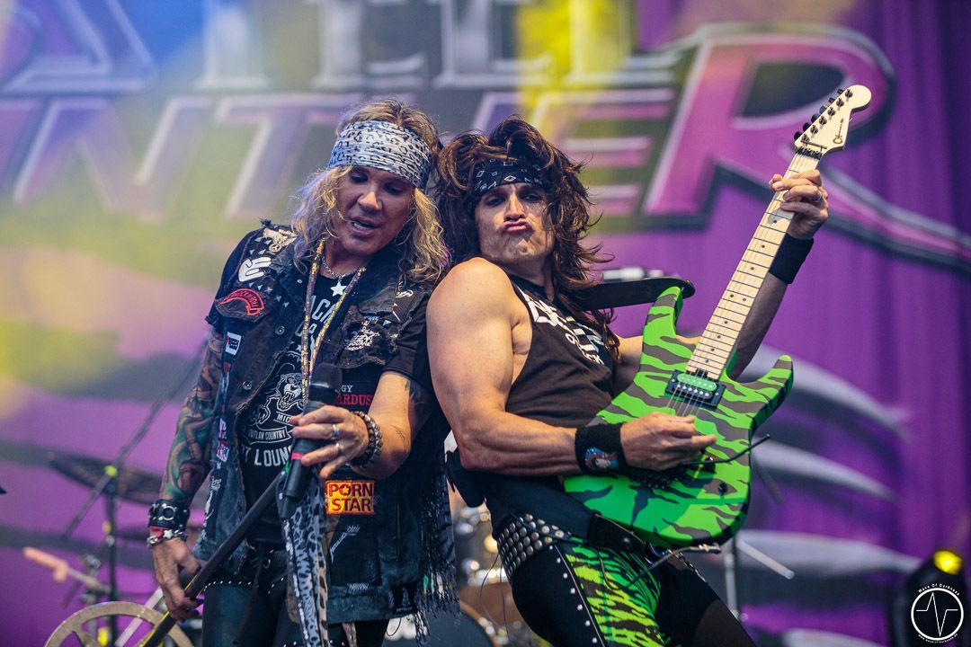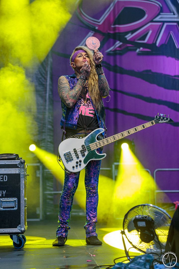 Dann heißt es Showtime für Lexxi Fox, Satchel, Stix Zadinia und Michael Starr. Und wie Stars werden diese empfangen. Mit „Eyes of a Panther“ und „Goin‘ in the Backdoor“ steigen die Kalifornier mit leichter Verspätung in ihr Set ein und holen die Fans gleich in dem Zustand ab, in welchem sie sich trotz Regennässe befinden: high und ready to rock! Die energetische und stets explizit vulgäre Bühnenshow reißt alle mit, auch wenn (oder gerade weil) wir wissen, dass Steel Panther nicht nur „Music“ sondern auch „Girls“ lieben, und dies ausgiebig transportiert wird. Die Deutschkenntnisse der Band sind – zumindest im Wortfeld Sex- und Fäkalsprache – gut ausgeprägt, die Aussprache flüssig und der Einfallsreichtum nahezu grenzenlos. Zahlreiche Intermezzi zum Thema „Wait, ich habe einen Ständer“ oder „Muschilecken“ machen eine Steel Panther Show eben nicht nur zu einem Musik- sondern auch zu einem Comedy-Event. Vor allem Gitarrist Satchel schwadroniert zwischen den Songs über den „kleinen Schwanz unseres Sängers“, suhlt sich in Eigenlob oder macht sich über die männlichen Fans lustig, die ihre bessere Hälfte auf ein Steel Panther Konzert mitnehmen. Sänger Michael Starr mischt kräftig mit und im Laufe des Sets werden noch weitere derbe Scherze platziert, z.B. wird sich über Musikerkollegen wie DEF LEPPARD oder über Ozzy Osborne lustig gemacht, indem Starr zum Cover von Black Sabbaths „Crazy Train“ eine grandiose Ozzy Inkarnation hinlegt.