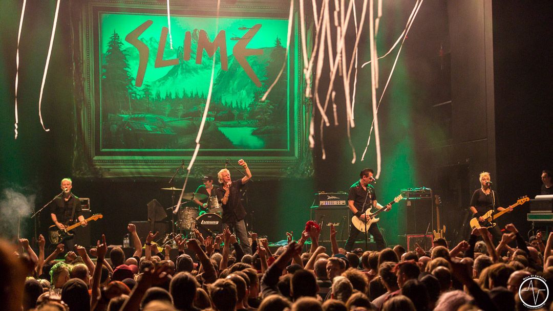 Nach nahezu zwei Stunden dürfen auch Slime vor die ausgelassen feiernden Fans, um „unsere Lieder“ zu spielen. Und Altpunks knüpfen nahtlos dort an, wo man nur wenige Minuten vorher aufgehört hat. Die stilprägende Band der 1980er Jahre hat jede Menge auf junge Fans angelockt, von denen sie heute Abend gefeiert werden. Kaum erklingt der erste Ton, schon tanzt man zu „Alle gegen Alle“ an mehreren Stellen in der Halle Pogo oder lässt sich bei „Störtebecker“ schnell mal auf Händen nach vorne tragen. In den kleinen Pausen Pausen zwischen den Liedern ertönen stellenweise antifaschistische Sprechchöre. Plötzlich preschen aus den Boxen die Klänge von AC/DCs „Highway To Hell“, die zu Ehren des am Morgen verstorbenen Malcolm Young mit Anerkennung gewürdigt werden. „Schöne neue Welt“ versetzt den Schlachthof wieder in mächtig Bewegung. Die unermüdlichen Fans feiern friedlich die direkten, ungeschönte Lieder der legendären Punkband. Nach „Der siebte Kontinent“ geht es zum ruhigeren, zum akustischen Teil über, der von vielen textsicher begleitet wird. Doch die Ruhe währt nur zwei Liedern, nämlich „Zu kalt“ und „Gewalt“. Dann wird wieder Fahrt aufgenommen und mit „Hier und Jetzt“ abgerockt. Die inhaltliche direkte Marschrichtung von Slime ist bekannt und kommt bei dem Publikum gut an. Obwohl sich inzwischen schon die manche Reihen lichten, tobt die Menge zu „Brandstifter“ oder „Ich war dabei“. Das Potpourri mit alten Klassikern und Liedern aus dem aktuellen Album führen Slime in ihrer Zugabe weiter, so dass am Ende alle zufrieden nach Hause gehen können.